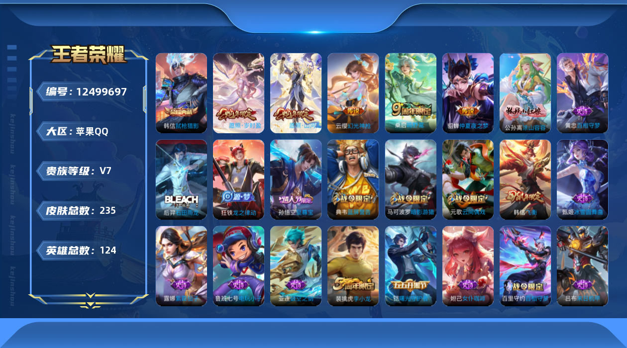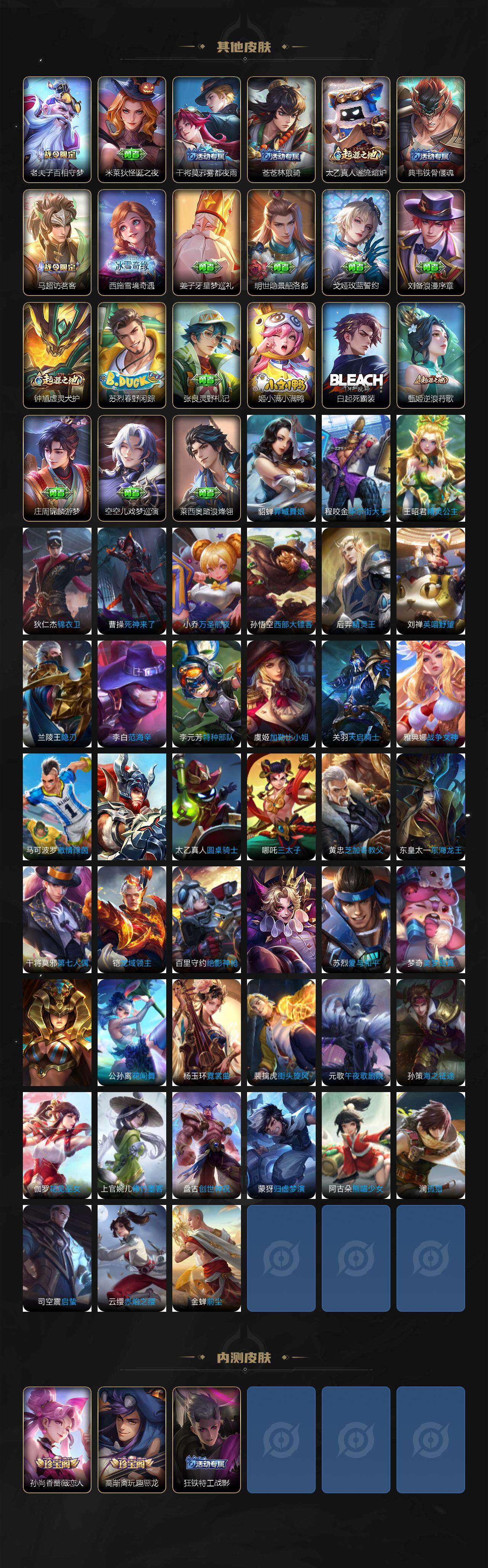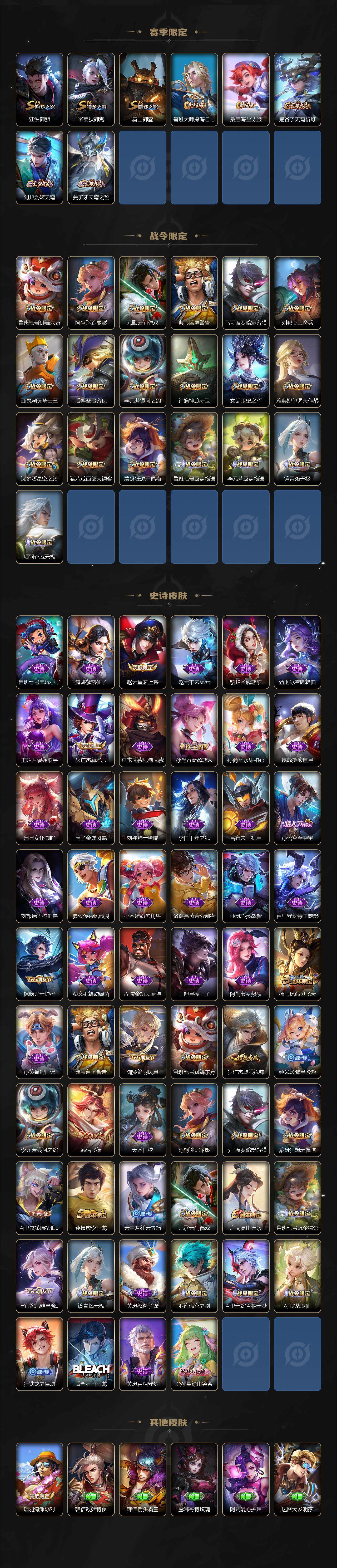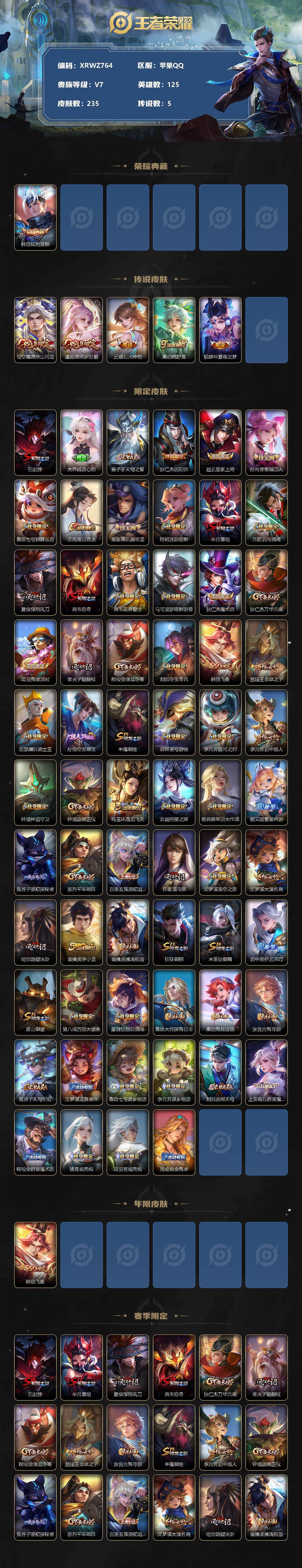 商品描述:[12499697]Xr42729-苹果Q-V7-永恒钻石V段位-125英雄-235皮肤-1典藏-0珍品无双-0无双-0珍品传说-5传说-58史诗【英雄全皮】:空空儿全皮【荣耀典藏】:韩信弑枪猎影【传说皮肤】:司空震愿照山河定,虞姬愿照岁时盈,云缨幻光神枪,桑启鸣野蒿,貂蝉仲夏夜之梦【限定皮肤】:白起狰,大乔绒语心约,姜子牙天穹之誓,狄仁杰阴阳师,赵云皇家上将,孙尚香蔷薇恋人,鲁班七号狮舞东方,庄周高山流水,高渐离玩趣恶龙,阿轲迷踪丽影,芈月重明,元歌云间偶戏,夏侯惇朔风刀,典韦穷奇,典韦蓝屏警告,马可波罗暗影游猎,狄仁杰魔术师,狄仁杰万华元夜,项羽海滩派对,老夫子醍醐杖,程咬金演武夺筹,刘邦夺宝奇兵,韩信飞衡,兰陵王金庭之子,亚瑟潮玩骑士王,孙悟空至尊宝,牛魔御旌,后羿圣弓游侠,李元芳银河之约,李元芳云中旅人,钟馗神迹守卫,钟馗驱傩正仪,杨玉环遇见飞天,女娲朔望之晖,雅典娜单词大作战,蔡文姬繁星吟游,鬼谷子原初探秘者,苏烈千军破阵,百里玄策原初追逐者,弈星混沌棋,沈梦溪星空之诺,沈梦溪大漠名商,明世隐疑决卦,裴擒虎李小龙,裴擒虎擒涛扼浪,狂铁御狮,米莱狄御霄,云中君纤云弄巧,盾山御銮,猪八戒西部大镖客,蒙犽狂想玩偶喵,鲁班大师探海日志,桑启海盐诗旅,张良古海寻踪,鬼谷子天穹祈灯,沈梦溪龙舞盛年,鲁班七号蔬乡物语,李元芳蔬乡物语,刘邦剑破天穹,上官婉儿群星魔术团,程咬金群星魔术团,镜青焰无极,项羽苍威无极,周瑜熔金海岸【年限皮肤】:韩信飞衡【赛季限定】:白起狰,芈月重明,夏侯惇朔风刀,典韦穷奇,狄仁杰万华元夜,老夫子醍醐杖,程咬金演武夺筹,兰陵王金庭之子,张良古海寻踪,牛魔御旌,李元芳云中旅人,钟馗驱傩正仪,鬼谷子原初探秘者,苏烈千军破阵,百里玄策原初追逐者,弈星混沌棋,沈梦溪大漠名商,明世隐疑决卦,裴擒虎擒涛扼浪,狂铁御狮,米莱狄御霄,盾山御銮,鲁班大师探海日志,桑启海盐诗旅,鬼谷子天穹祈灯,刘邦剑破天穹,姜子牙天穹之誓【战令限定】:鲁班七号狮舞东方,阿轲迷踪丽影,元歌云间偶戏,典韦蓝屏警告,马可波罗暗影游猎,刘邦夺宝奇兵,亚瑟潮玩骑士王,后羿圣弓游侠,李元芳银河之约,钟馗神迹守卫,女娲朔望之晖,雅典娜单词大作战,沈梦溪星空之诺,猪八戒西部大镖客,蒙犽狂想玩偶喵,鲁班七号蔬乡物语,李元芳蔬乡物语,镜青焰无极,项羽苍威无极【史诗皮肤】:鲁班七号电玩小子,露娜紫霞仙子,
