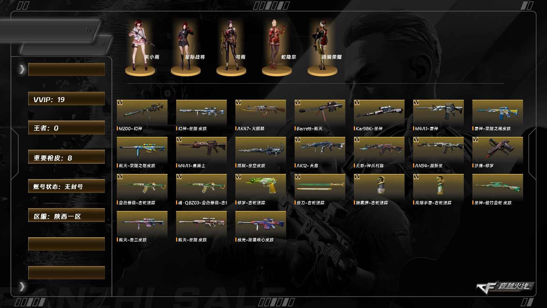 陕西一区 有二次 可排位 78v 【传说破晓+晴雅+炽芒蝶刃】【M200-幻神+幻神-宠儿+幻神-N9+幻神-星火小队签名珍藏版+幻神-冠军之幻+幻神-丹凤+幻神音效卡+USP雷暴+柯尔特-荣耀世冠+冠军之刃*2】【王者星霆】【QBZ金色蔷薇+QBZ-CFS2024+QBZ王者蔷薇】【Scar白虎+白虎-暗星+M4A1-青龙】【火麒麟+火麒麟-HeartShot+火麒麟音效卡】【雷神+雷神-巅峰荣耀+雷神-LGD18冠军】【毁灭+毁灭-HeartShot+毁灭-AG15冠军+毁灭音效卡】【天龙+天龙-能量核心】【极光+极光音效卡】【斩神刀-雷暴+雷暴手雷套】【幻灵之锋+幻灵手雷套】【雷霆王者之锋+雷霆王者手雷套】王者之魄 王者之势 王者之烈 王者玉锋 炫金火麒麟 炫金骑士 炫金毁灭 炫金天神 无影 极光 裁决 修罗 天神 屠龙 麒麟刺 【小人枪】COP白鲨 【角色】4防王者云悠悠 晴雅 奇洋探员 王者玲珑 王者凌霄 云海玲珑 岚兮儿 魅影 如赛季更新等不可抗拒因素发生变化、时限道具不保证所剩时间 如有号中有战队需解除或退出只能协调解除不保证解除成功四川一区 有二次 可排位 11v 【M200-幻神+幻神-纸灯龙】【王者芳薇】【M4A1-青龙】【幻灵之锋+幻灵手雷套】天启 黑鲨 修罗 等各种永久道具详情看图(截图展示段位不代表实际段位,如赛季更新等不可抗拒因素发生变化、时限道具不保证所剩时间,其余道具看截图或咨询客服)
