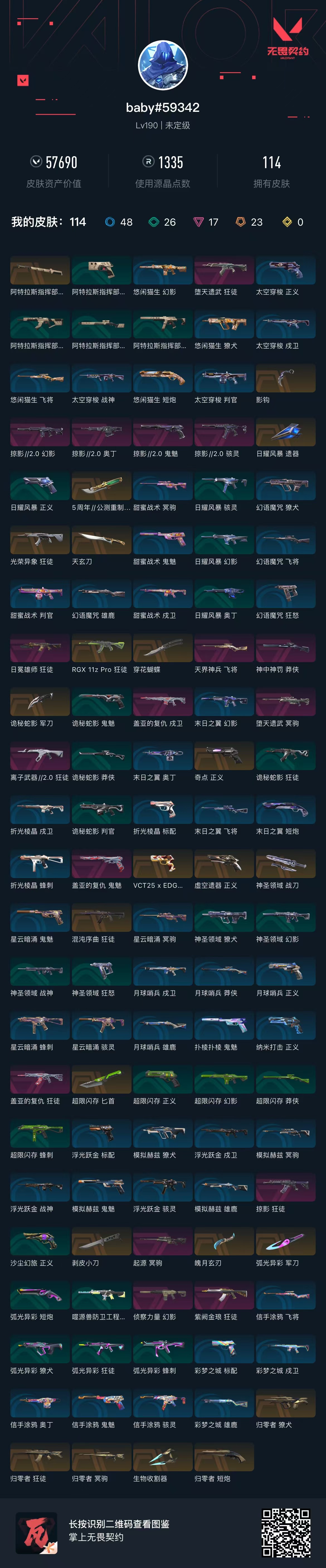 SH71 Lv190 ,皮肤总价值57690,未定级,总皮肤114,刀皮13枪皮101(传奇10卓越17),套装2(传奇1卓越1),具体详情看图
