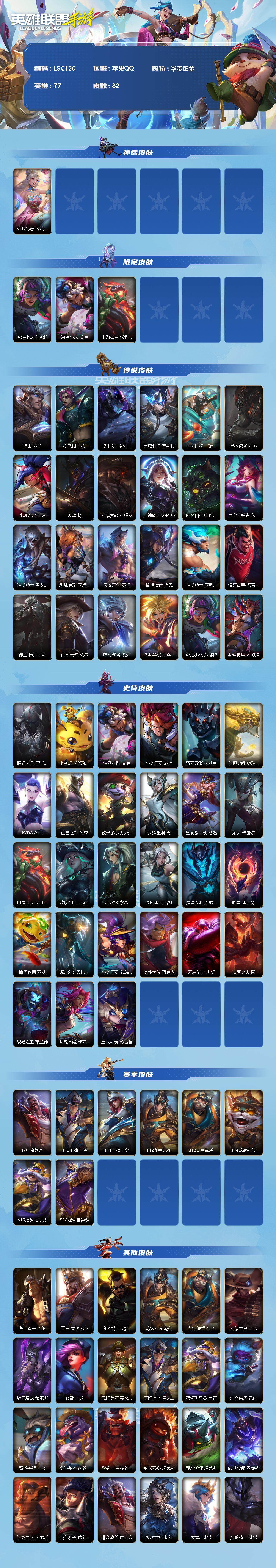 商品描述:【LSC120】77英雄/82皮肤/1神话/24传说/27史诗/华贵铂金/桃映暖春 灼灼芳菲 拉克丝/涂鸦小队 莎弥拉/涂鸦小队 艾克/山海绘卷 沃利贝尔/神王 盖伦/心之钢 凯隐/源计划:净化 薇恩/星域游侠 崔斯特/太空律动 “猫猫”布里和里茨 布里茨/黑夜使者 亚索/斗魂无双 亚索/天煞 劫/西部魔影 卢锡安/月蚀骑士 蕾欧娜/欧米伽小队 幽灵特工 提莫/星之守护者 落 霞/神龙尊者 圣龙 李青/跳跳倩影 厄运小姐/灵魂莲华 瑟提/黎明使者 永恩/神龙尊者 驭风啸龙 易/灌篮高手 德莱厄斯/神王 德莱厄斯/西部天使 艾希/黎明使者 锐雯/战斗学院 伊泽瑞尔/斗魂觉醒 莎弥拉/腥红之月