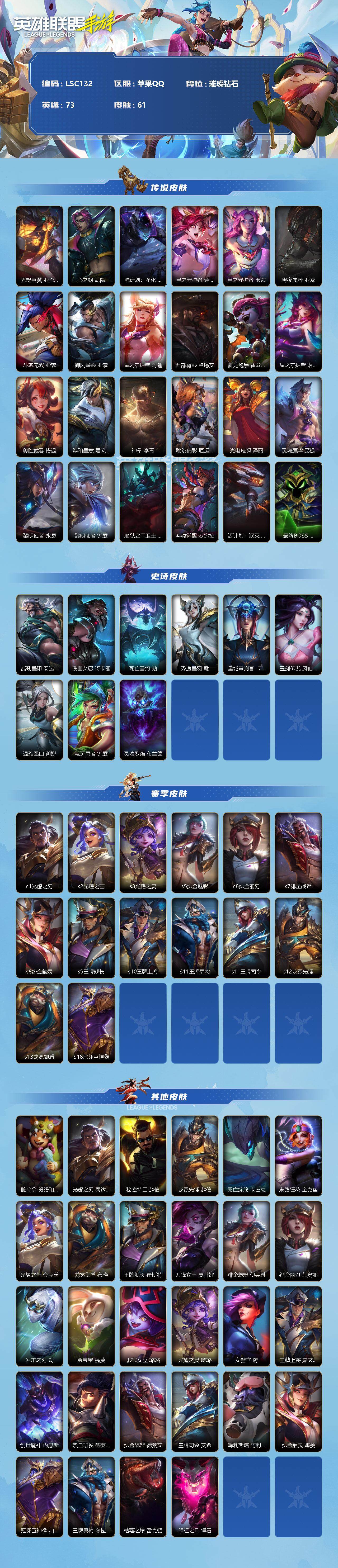 商品描述:【LSC132】73英雄/61皮肤/璀璨钻石/光影巨翼 亚托克斯/心之钢 凯隐/源计划:净化 薇恩/星之守护者 金克丝/星之守护者 卡莎/黑夜使者 亚索/斗魂无双 亚索/御风墨影 亚索/星之守护者 阿狸/西部魔影 卢锡安/驯龙炮手 崔丝塔娜/星之守护者 落 霞/剪胜裁春 格温/淳和墨意 嘉文四世/神拳 李青/跳跳倩影 厄运小姐/光电璀璨 泽丽/灵魂莲华 瑟提/黎明使者 永恩/黎明使者 锐雯/地狱之门卫士 加里奥/斗魂觉醒 莎弥拉/源计划:泯灭 雷克顿/最终BOSS 维迦/端劲墨印 泰达米尔/铁血女忍 阿卡丽/死亡誓约 劫/秀逸墨羽 霞/星域审判官 卡蜜尔/玉剑传说 风仙子 迦娜/温雅墨曲 迦