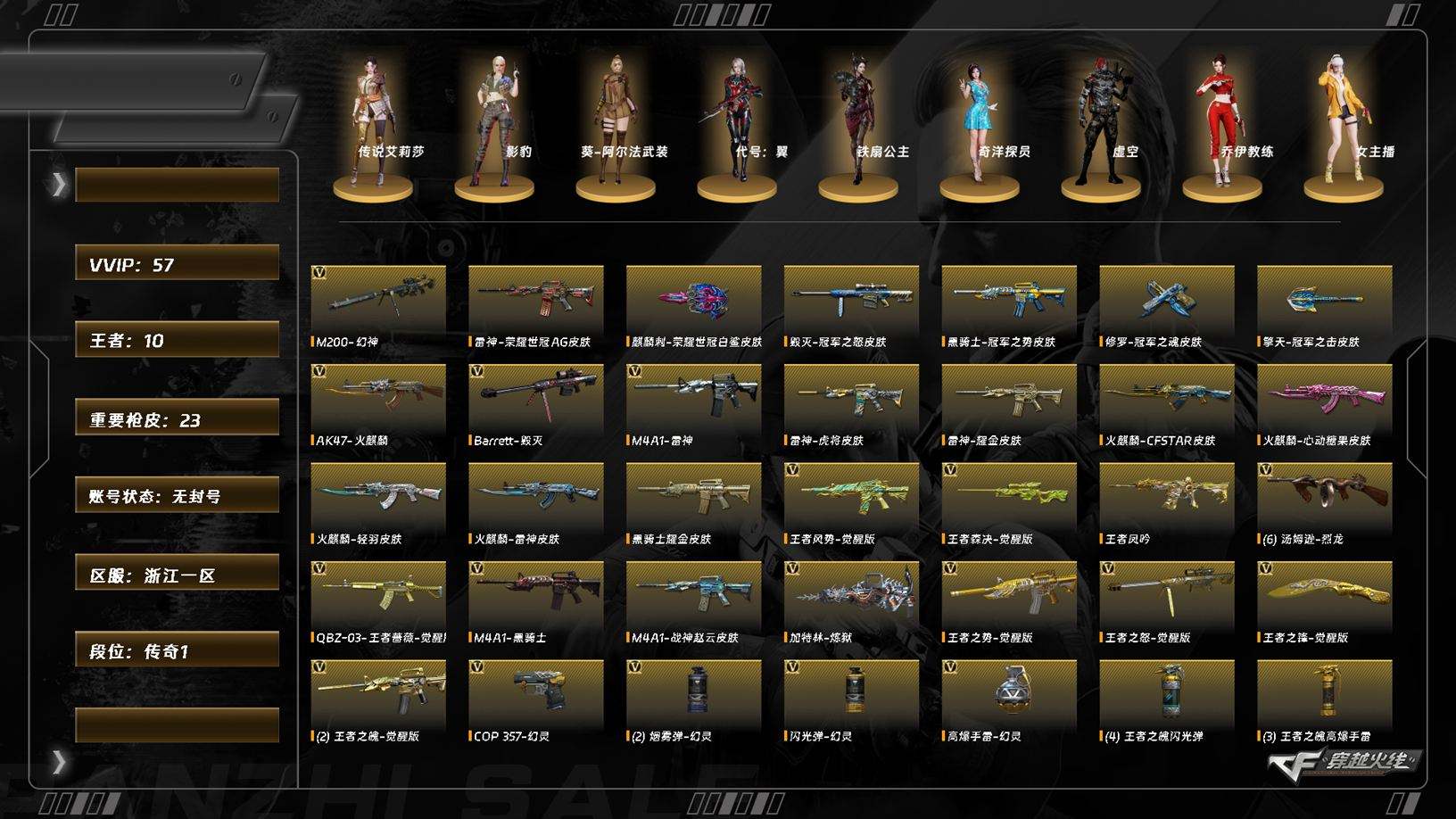 商品描述:[12844521]LC6928,东部,浙江一区,可排位,60v,2传说,【三防传说角色,传说艾莉莎,】,传说夜影,幻神,6烈龙,6修罗,QBZ王者蔷薇,白虎之魄,【四防角色,灵狐者职业经理,】,【角色】,影豹,葵阿尔法武装,奇洋探员,乔伊教练,【音效卡,炼狱百战金芒庆典舞曲音效卡,白虎音效卡,】,【枪皮】,雷神HeartShot,擎天冠军之击,雷神荣耀世冠AG,火麒麟心动糖果,王者武器王者凤吟,王者风势,王者之魄,王者之势,王者凛烈,王者森决,王者之怒,王者之锋,【小人枪,白虎迷你小艾,炼狱迷你小钢,COP白鲨,王者COP精英刀锋,巴雷特零水下丽影,CAT猫锋,COP旗袍,】,永久AC,有过十年记录,找回包赔