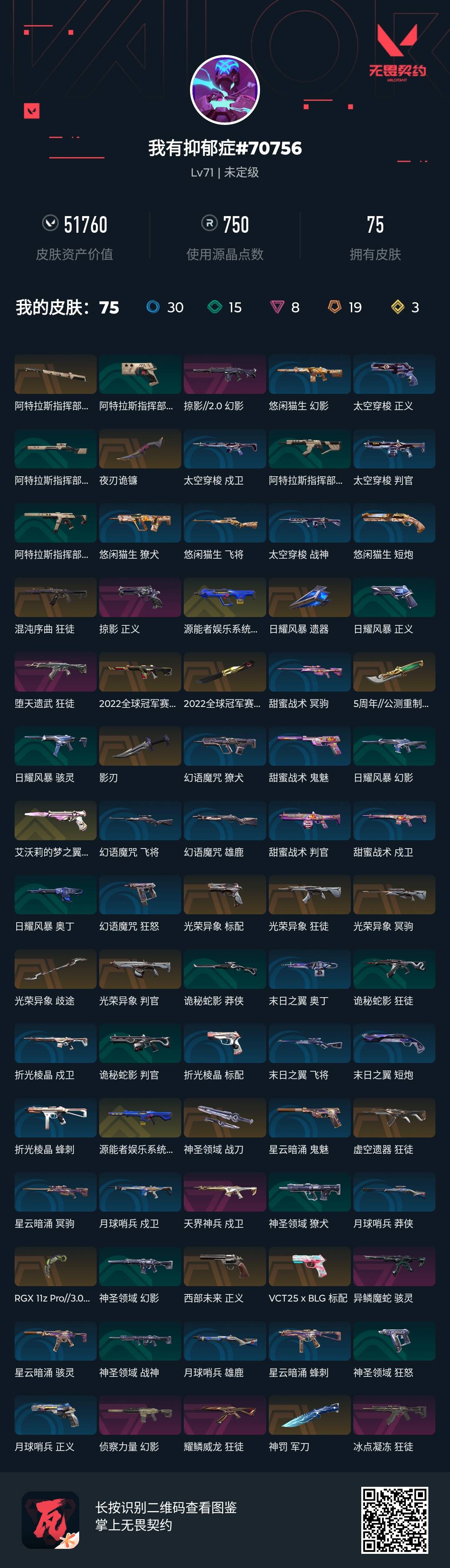 商品描述:[12912672]B189048(2022全球冠军赛套装/光荣异象套装)无畏契约/71等级/未定级/20英雄/75皮肤/51760资产/已使用R点750/剩余R点10/2022全球冠军赛-幻影,2022全球冠军赛-蝴蝶刀,光荣异象-狂徒,光荣异象-冥驹,光荣异象-判官,光荣异象-标配,光荣异象-歧途,阿特拉斯指挥部-甩棍,日耀风暴-遗器,5周年//公测重制版-苍龙之刃,神圣领域-战刀,神罚-军刀,夜刃诡镰,RGX-11z-Pro//3.0-爪刀,影刃,虚空遗器-狂徒,混沌序曲-狂徒,源能者娱乐系统-獠犬,源能者娱乐系统-幻影,掠影//2.0-幻影,堕天遗武-狂徒,天界神兵-戍卫,侦察力量-幻影,冰点凝冻-狂徒,耀鳞威龙-狂徒-,VCT25-x-BLG-标配,西部未来-正义,艾沃莉的梦之翼-鬼魅,掠影-正义