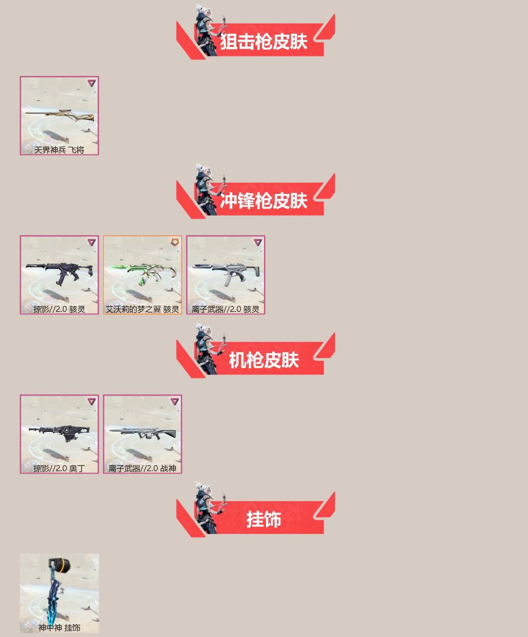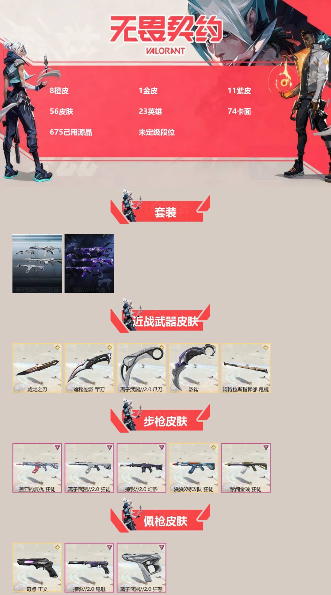 商品描述:[12918277]8橙皮 1金皮 11紫皮 56皮肤 23英雄 74卡面 675已用源晶 未定级段位 【套装】:掠影2.0套装,离子武器2.0 【近战武器皮肤】:离子武器2.0 爪刀,诡秘蛇影,影钩,阿特拉斯指挥部,威龙之刃 【佩枪皮肤】:狂怒-离子武器2.0,鬼魅-掠影2.0,正义-奇点 【冲锋枪皮肤】:骇灵-掠影2.0,骇灵-离子武器2.0,骇灵-艾沃莉的梦之翼 【步枪皮肤】:狂徒-滋滋X特攻队,幻影-掠影2.0,狂徒-离子武器2.0,狂徒-紫阙金琅,狂徒-盖亚的复仇 【狙击枪皮肤】:飞将-天界神兵 【机枪皮肤】:奥丁-掠影2.0,战神-离子武器2.0 【挂饰】:神中神挂饰