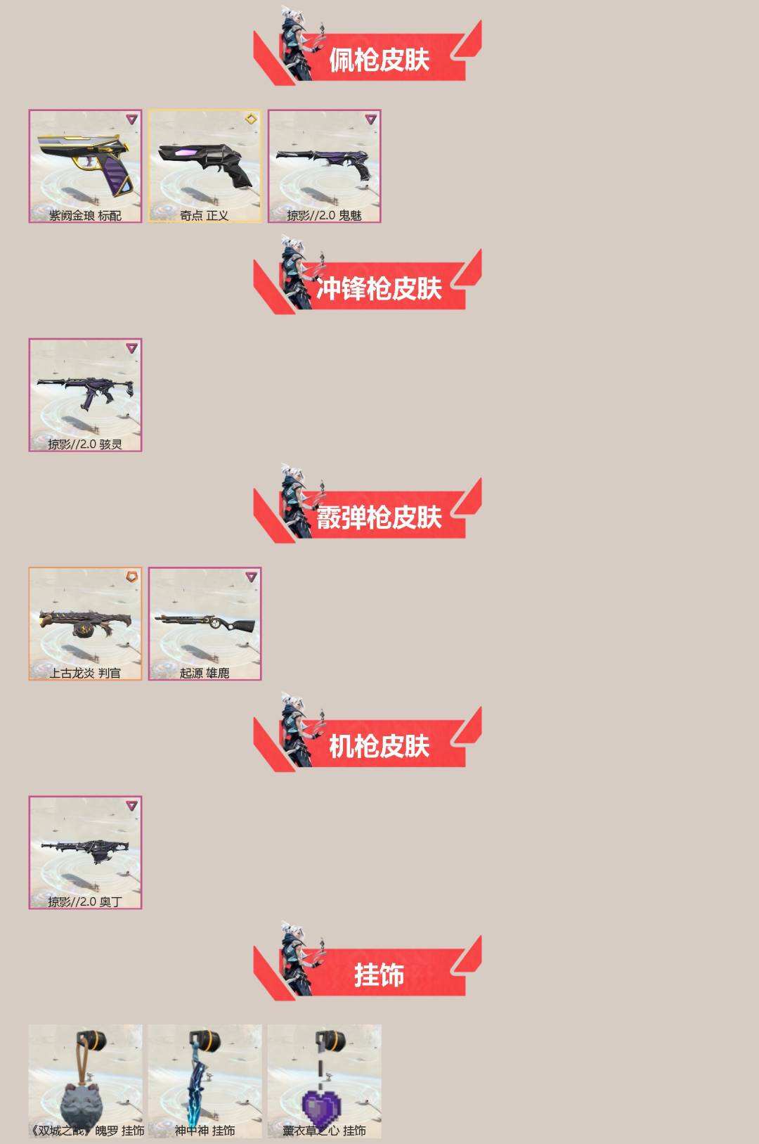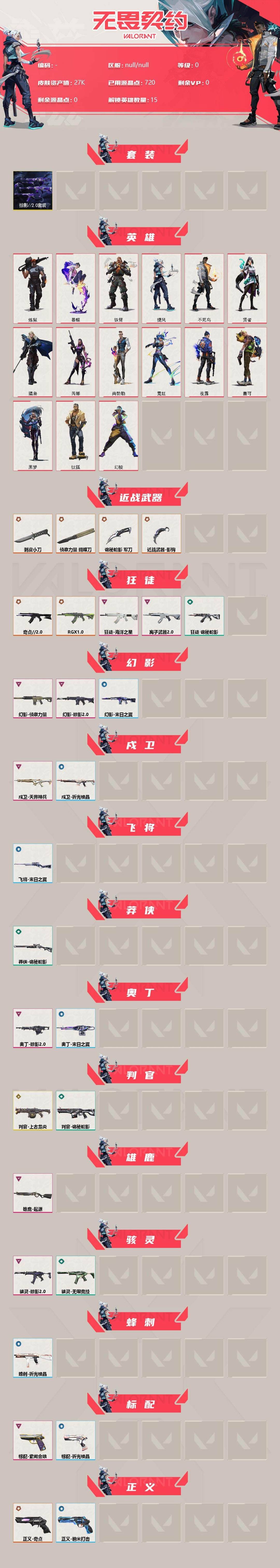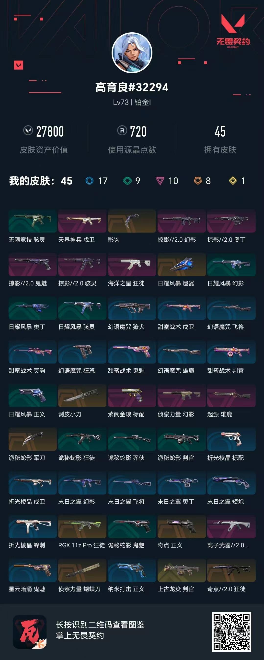 商品描述:[12921047]8橙皮 1金皮 10紫皮 45皮肤 15英雄 78卡面 720已用源晶 未定级段位 【套装】:掠影2.0套装 【近战武器皮肤】:诡秘蛇影,影钩,蝴蝶刀-侦察力量,剥皮小刀 【佩枪皮肤】:鬼魅-掠影2.0,正义-奇点,标配-紫阙金琅 【冲锋枪皮肤】:骇灵-掠影2.0 【霰弹枪皮肤】:判官-上古龙炎,雄鹿-起源 【步枪皮肤】:狂徒-奇点//2.0,幻影-掠影2.0,狂徒-RGX 11z pro,狂徒-离子武器2.0,狂徒-海洋之星,幻影-侦察力量,戍卫-天界神兵 【机枪皮肤】:奥丁-掠影2.0 【挂饰】:薰衣草之心挂饰,双城之战魄罗挂饰,神中神挂饰