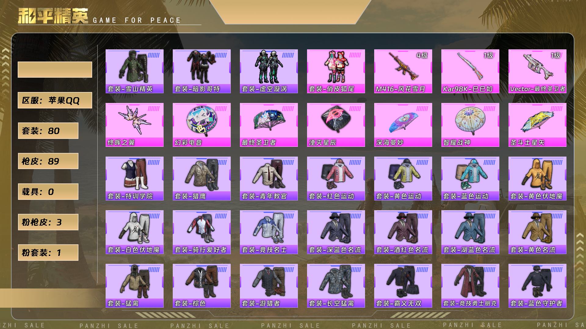 商品描述:[10729184]连体号:王者 金标猴子 贵族8 荣耀典藏1 无双1 传说皮肤16 史诗皮肤84 皮肤数量318 和平 1粉装-3粉枪-0载具-1珍稀飞行器-80套装-89枪皮 王者荣耀-苹果QQ 贵族8 荣耀典藏1 无双1 传说皮肤16 史诗皮肤84 皮肤数量318 皮肤价值:223766 英雄125 至尊星耀III 总场次13502 【内测皮肤】3 弈星_万物之道 孙尚香_蔷薇恋人 艾琳_女武神 【荣耀皮肤】1 花木兰_九霄神辉 【珍品无双】0 【无双皮肤】1 曜_器灵螭龙剑【传说皮肤】16 司空震_愿照山河定 澜_愿照九州拓 裴擒虎_祥瑞亨通 桑启_鸣野蒿 兰陵王_影龙天霄 诸葛亮_时雨天司 百里玄策_白虎志 虞姬_启明星使 孙悟空_齐天大圣 橘右京_枫霜尽 孙悟空_零号赤焰 吕布_怒海麟威 镜_炽阳神光 曜_云鹰飞将 李白_诗剑行 狄仁杰_神器狴犴令 【史诗皮肤】84 黄忠_百相守梦 狂铁_龙之律动 刘禅_鸭鸭历险记 孙膑_茶境仙 牛魔_星界战将 百里守约_百相守梦 亚连_破空之剑 李白_谪仙醉月 蔡文姬_夏日便利店 狄仁杰_魔术师 赵云_皇家上将 吕布_御风骁将 韩信_飞衡 孙悟空_大圣娶亲 孙悟空_至尊宝 铠_曙光守护者 花木兰_水晶猎龙者 阿古朵_江河有灵 鬼谷子_五谷丰年 庄周_高山流水 裴擒虎_李小龙 上官婉儿_梁祝 甄姬_游园惊梦 高渐离_燃音魔法 司空震_地狱燃心 戈娅_驭风魔法 扁鹊_奇幻香踪 暃_星界游侠 钟无艳_超时空战士 元歌_云间偶戏 马可波罗_暗影游猎 李元芳_银河之约 兰陵王_驯魔猎人 鲁班七号_狮舞东方 典韦_蓝屏警告 嬴政_白昼王子 韩信_逐梦之影 刘禅_电玩爆裂旋风 澜_赏金猎手 钟馗_乐园奇幻夜 橘右京_修罗 孙策_猫狗日记 阿轲_节奏热浪 白起_星夜王子 程咬金_功夫厨神 李元芳_逐浪之夏 刘禅_天才门将 蔡文姬_舞动绿茵 百里守约_特工魅影 安琪拉_心灵骇客 雅典娜_冰冠公主 亚瑟_心灵战警 诸葛亮_黄金分割率 兰陵王_暗隐猎兽者 小乔_缤纷独角兽 夏侯惇_乘风破浪 韩信_白龙吟 吕布_末日机甲 李白_千年之狐 曹操_幽灵船长 阿轲_暗夜猫娘 妲己_女仆咖啡 妲己_魅力维加斯 貂蝉_圣诞恋歌 宫本武藏_鬼剑武藏 廉颇_地狱岩魂 露娜_紫霞仙子 鲁班七号_电玩小子 吕布_圣诞狂欢 墨子_金属风暴 墨子_龙骑士 孙尚香_水果甜心 项羽_苍穹之光 嬴政_摇滚巨星 赵云_未来纪元 甄姬_冰雪圆舞曲 元歌_无心 云中君_纤云弄巧 蒙恬_荣光圣徽 梦奇_顽趣 雅典娜_黎明之约 百里玄策_原初追逐者 狄仁杰_鹰眼统帅 和平精英-苹果QQ 【1粉装-3粉枪-0载具-1珍稀飞行器-80套装-89枪皮】当前段位:不朽星钻Ⅲ 历史最高段位:超级王牌12星 热力值:25265 王牌印记:2 游戏等级:65 【稀有资产数量】3 【套装数量】80 【枪械数量】89 【粉枪械数量】3 【粉套装数量】1 【载具数量】0 【飞行器数量】1 【稀有资产】套装-雪山精英/套装-暗影哥特/套装-虚空漩涡 【粉色套装】套装-俏皮狐尾 【粉色枪皮】M416-风花雪月[4级]/Kar98K-巳巳如意[1级]/Vector-最终圣卫者[1级] 【飞行器】终晖之翼飞行器