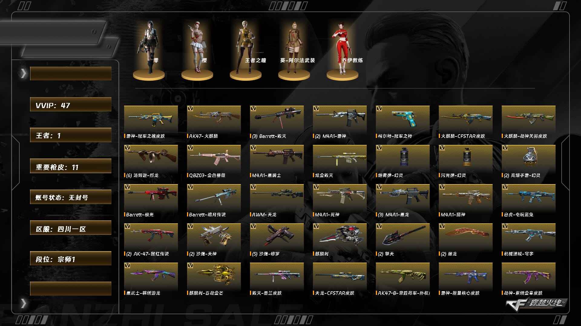 商品描述:[12999875]XH8606/西部/四川一区/【宗师1】/Lv.100 大元帅/VIP4/【爆破+生化】/47V/QBZ金色蔷薇/白虎电玩蓝兔/柯尔特冠军之特/6烈龙/死亡之眼/5修罗/毁灭/极光/雷神/黑骑士/黑龙/火麒麟/天神/屠龙/擎天/麒麟刺/一套幻灵手雷/【音效卡皮肤】/雷神冠军之魄/火麒麟战神关羽/黑骑士音效卡【角色】/王者之瞳/葵阿尔法武装/零/樱/零纪元/乔伊教练/【玩偶武器】/天龙曼陀罗/牛牛AK47///各种饰品/各种道具/细节看图/封禁过十年已解/