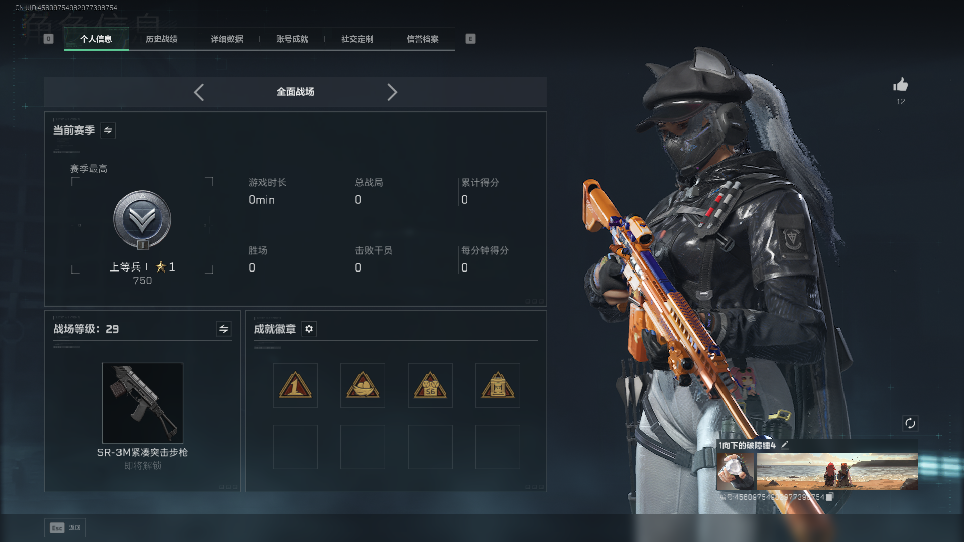 44m总资产-40490k哈伏币-36烽火等级-青铜-1战场等级-无军衔