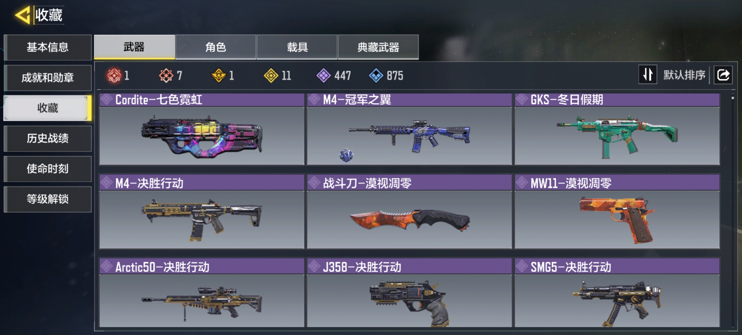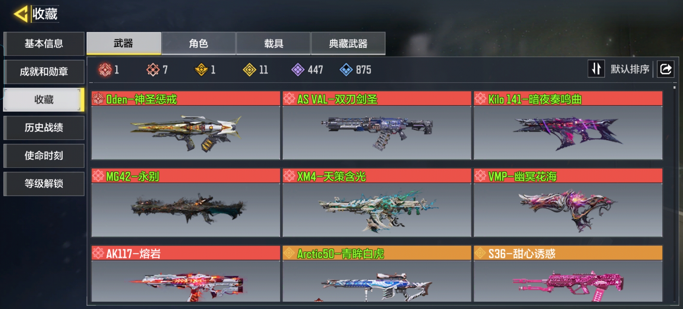 商品描述:ZMSM526【8红1满级 11金 1神话角色 圣诞狙】 安卓Q-等级368-7神话-11传说-1典藏-447史诗 【神话】 Oden-神圣惩戒 ASVAL-双刃剑圣 Kilo141-暗夜奏鸣曲 MG42-永别 XM4-天策含光 VMP-幽冥花海 AK117-熔岩 【传说】 Arctic50-清眸白虎 S36-甜心诱惑 Outlaw-艳阳时刻 十字弓-动能电流 DLQ33-炫彩冬日 M4-皇家黑魂 电棍-永恒炽热 HVK30-街机霸王·典藏 CAR56-回音律动 AK47-火箭炮 Krig6-苍天之剑 【角色】 索菲亚-砺锋的希冀