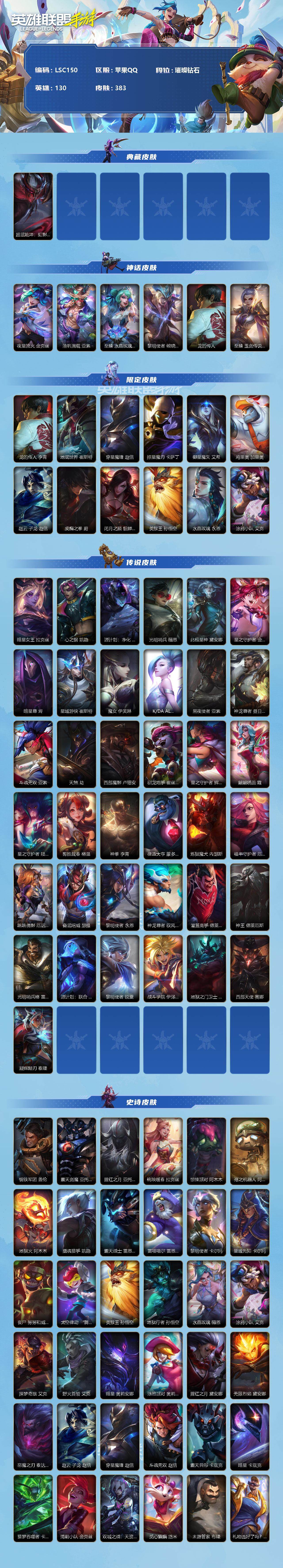 商品描述:【LSC150】130英雄/383皮肤/1典藏/6神话/37传说/205史诗/璀璨钻石/超武乾坤:虹影 劫/夜星流火 金克丝/渔帆满载 亚索/至臻 水晶玫瑰 格温/黎明使者 破晓之殇 佛耶戈/龙的传人 李青/至臻 玉剑传说 武剑仙 锐雯/地底世界 崔斯特/穿星魔锋 赵信/掠星魔刃 卡萨丁/御星魔矢 艾希/鸡里奥 加里奥/赵云 子龙 赵信/虎痴之拳 蔚/闭月之颜 貂蝉 卡特琳娜/美猴王 孙悟空/水晶玫瑰 永恩/涂鸦小队 艾克/暗星女王 拉克丝/心之钢 凯隐/源计划:净化 薇恩/光明哨兵 薇恩/北极星神 黛安娜/星之守护者 金克丝/暗星尊 烬/星域游侠 崔斯特/魔女 伊芙琳/K/DA ALL O