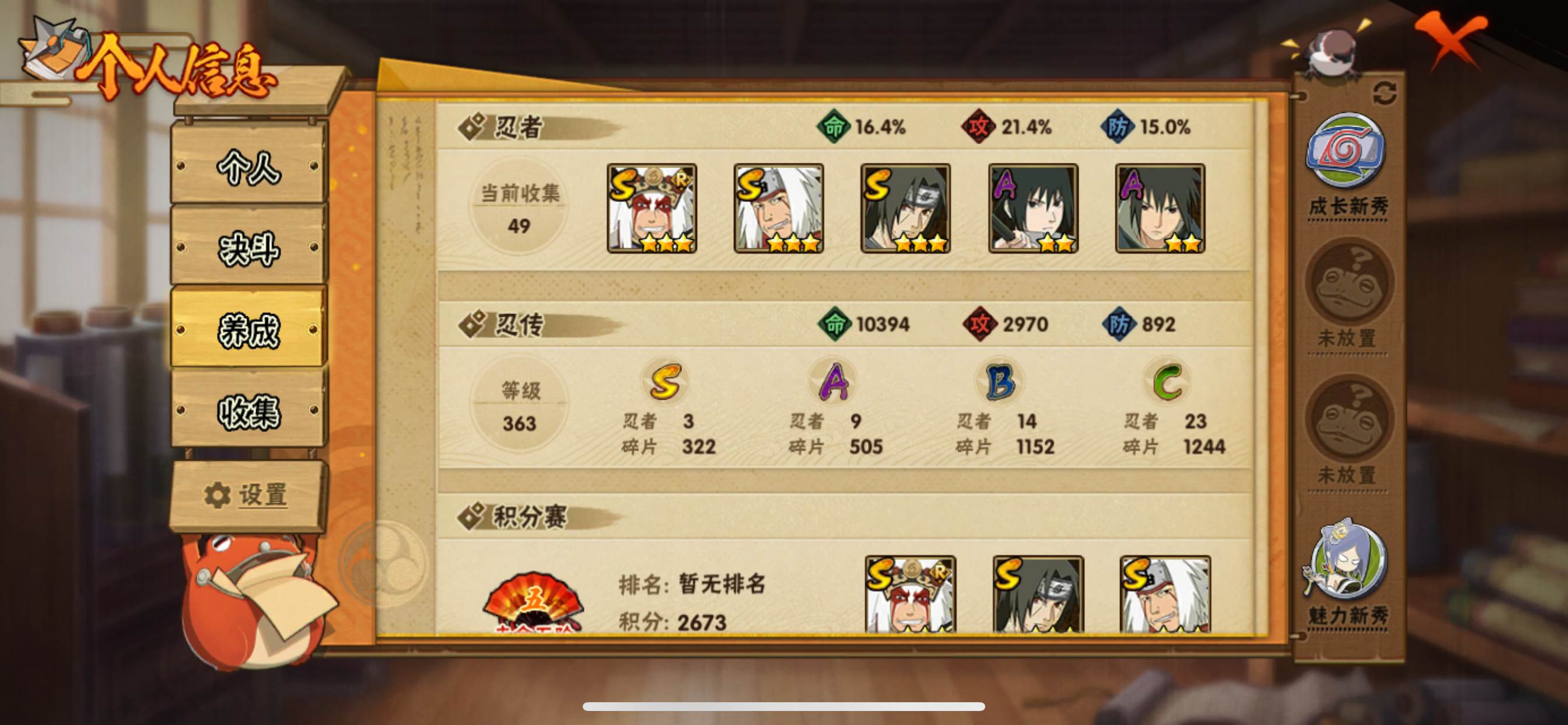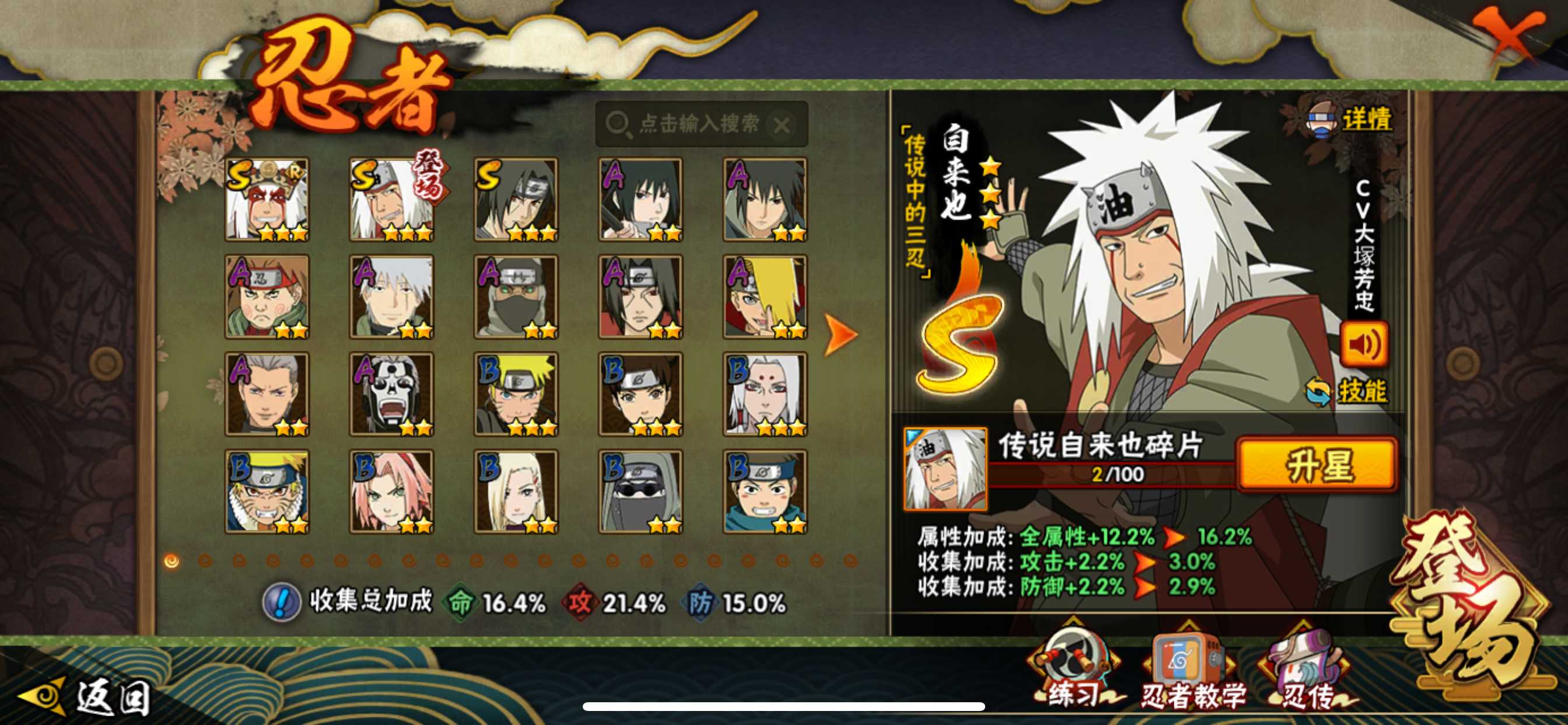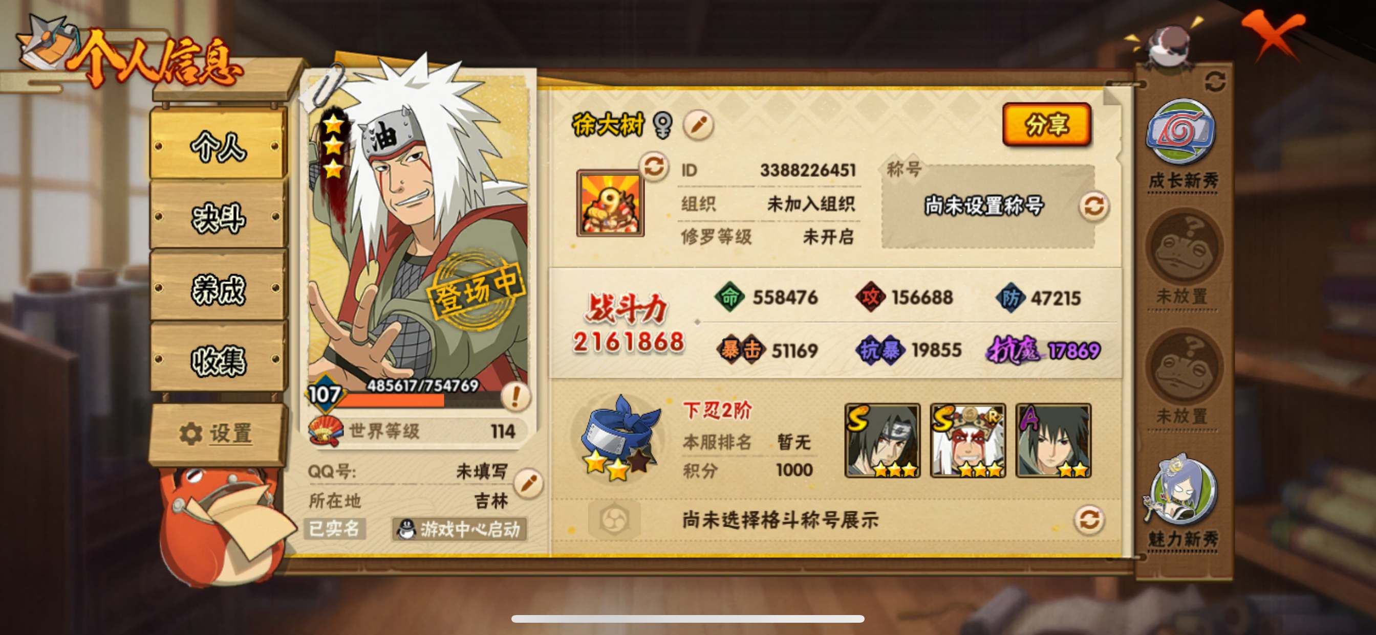 安卓V【包人脸】贵族等级:1266战力:13367975段位:1278S忍数量:26A忍数量:32由于赛季更新段位以上号为准苹果Q【包人脸】贵族等级:VIP0战力:2176035段位:1276S忍数量:3A忍数量:9自来也「传说中的三忍」宇智波鼬「须佐能乎」自来也「舞之豪杰」区:882