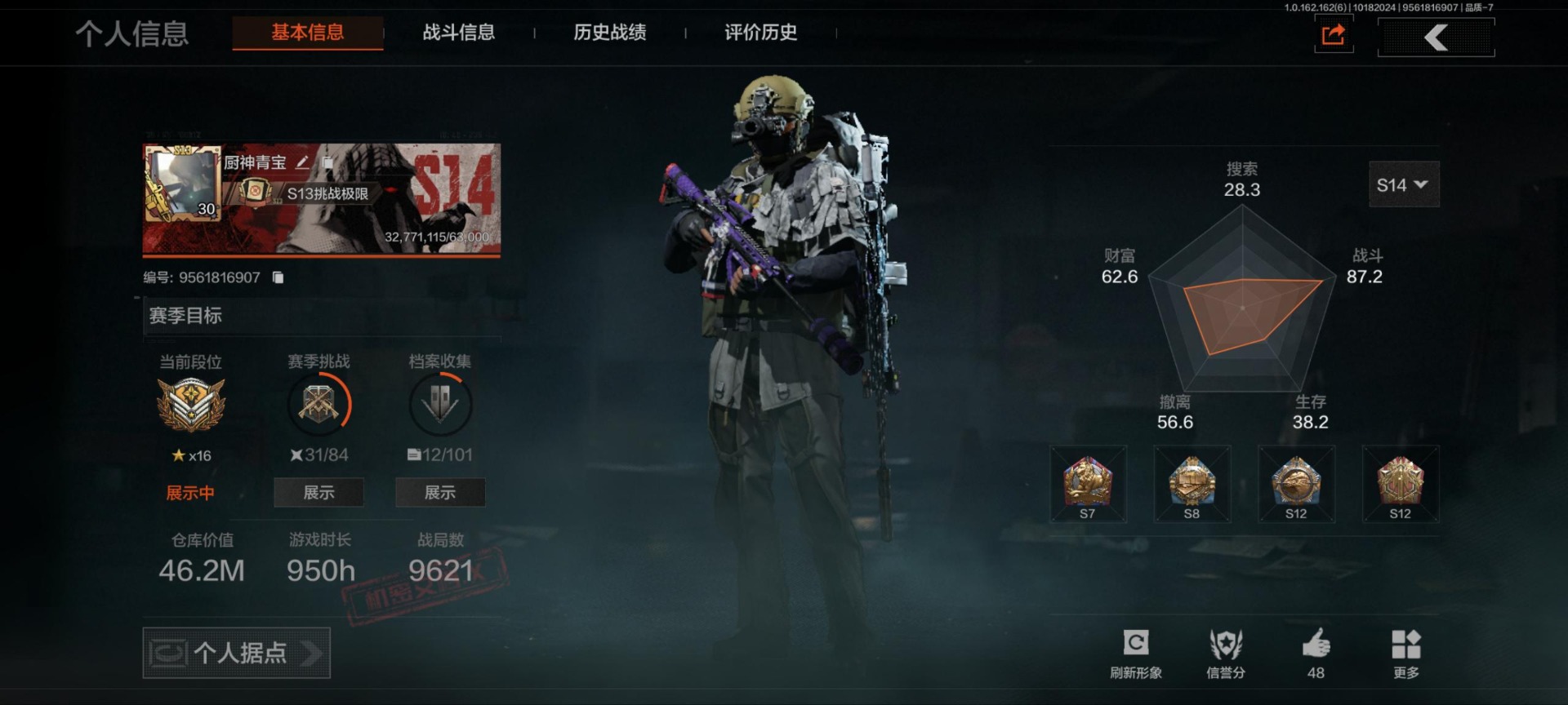 商品描述:库存价值46.2 10近战武器 4金套装 9金枪皮 可修改实名 【柯恩币数量】:38152【角色装扮(金)】:苍白隐者·伪装服,强尼·银手套装,火绒·塔莉娅,钢铁壁垒作战服【近战武器】:来战·开山刀,收割者,S-07折刀,热能武器·补牢,赢家匕首,瀚星斩铁,盘牙·彻甲短刃,工兵铲,贝利亚黄昏,涂鸦利刃【金色枪皮】:告丧夜曲·AUG,伦琴幻影·H416,骑士之剑·VSS,竞技·FAL,旗帜·AEK,棱光裂变·QBU191,战术大师·QBZ192,告丧夜曲·AR57,利齿风暴·MPX【紫色枪皮】:棱光裂变·莫辛,棱光裂变·AK74N,棱光裂变·AK102,灰鼠幻歌·P90,骑士之剑·AKS74U,无畏·USAS12,百锻寒芒·T951,武侍·SJ16,V·SKS,超越自我·Vector9,超越自我·AR30,利齿风暴·T03,飨宴前兆·QBZ191,鱼跃丹青·M110,竞技·M4A1,逆火·MDR,阴影·AN94,湖冰倒影·ACE31,雪山之王·F2000,雪原凌锋·SVDS,娜迦·RPK16【角色装扮(紫)】:鎏金街头套装,王国卫队礼装