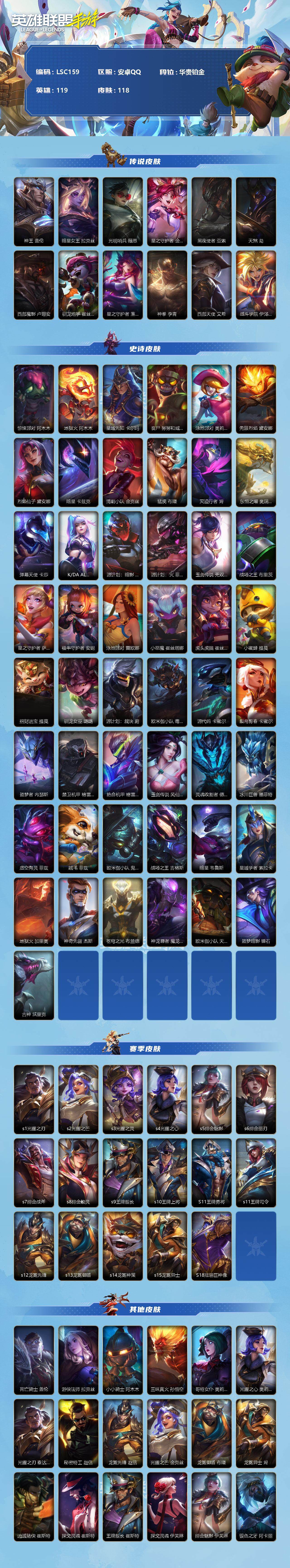 商品描述:【LSC159】119英雄/118皮肤/11传说/49史诗/华贵铂金/神王 盖伦/暗星女王 拉克丝/光明哨兵 薇恩/星之守护者 金克丝/黑夜使者 亚索/天煞 劫/西部魔影 卢锡安/驯龙炮手 崔丝塔娜/星之守护者 落 霞/神拳 李青/西部天使 艾希/战斗学院 伊泽瑞尔/惊悚派对 阿木木/地狱火 阿木木/星域先知 卡尔玛/丧尸 努努和威朗普/泳池派对 奥莉安娜/无限烈焰 黛安娜/烈焰仙子 黛安娜/暗星 卡兹克/清剿小队 金克丝/猛虎 布隆/灭迹行者 烬/东恒之曜 奥瑞利安·索尔/弹幕天使 卡莎/K/DA ALL OUT 伊芙琳/源计划:暗影 阿卡丽/源计划:火 菲奥娜/玉剑传说 无双 菲奥娜/战