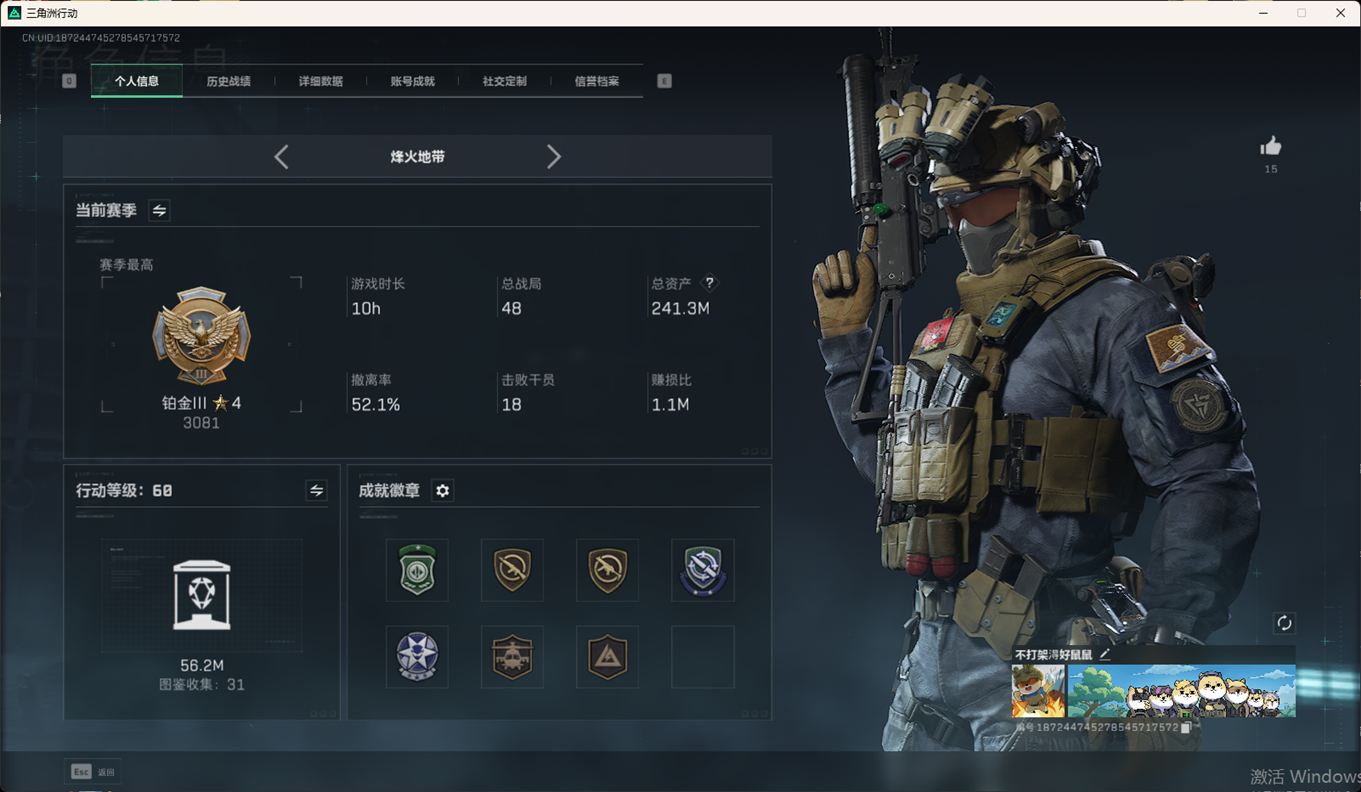 N6260/QQ区/哈夫币1762W/总资产241.3M/行动等级60/战场等级9/近战/黑鹰/干员/蜂医送葬人无题密令/枪皮/M4A1突击步枪阿米娅/CAR15突击步枪阿米娅/勇士冲锋枪能天使午夜邮差/725双管散弹枪送葬人无题密令/复合弓黑天际线/找回包赔