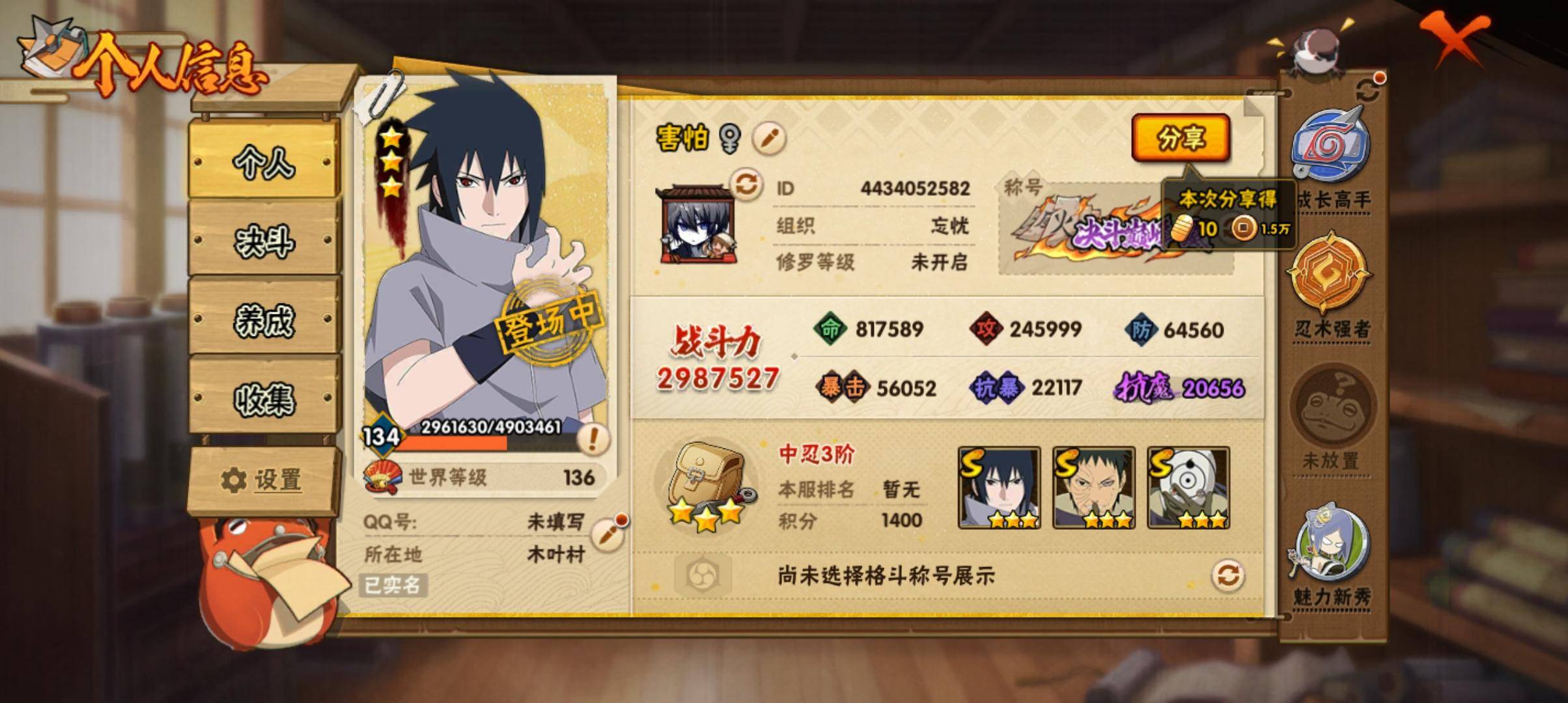 安卓V【包人脸】贵族等级:1266战力:13367975段位:1278S忍数量:26A忍数量:32由于赛季更新段位以上号为准苹果Q【包人脸】贵族等级:VIP0战力:2176035段位:1276S忍数量:3A忍数量:9自来也「传说中的三忍」宇智波鼬「须佐能乎」自来也「舞之豪杰」区:882