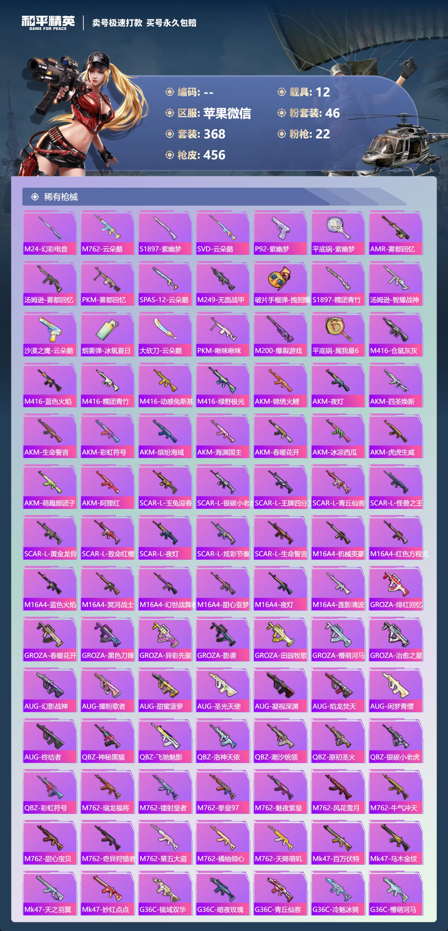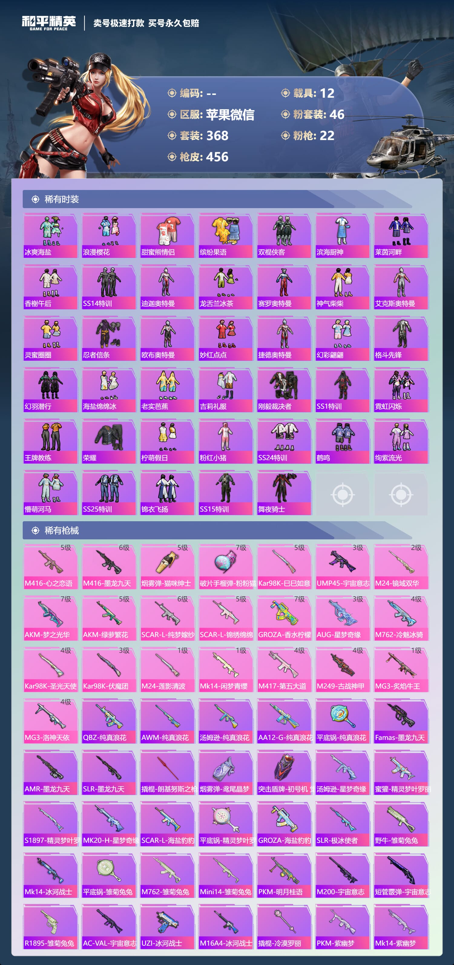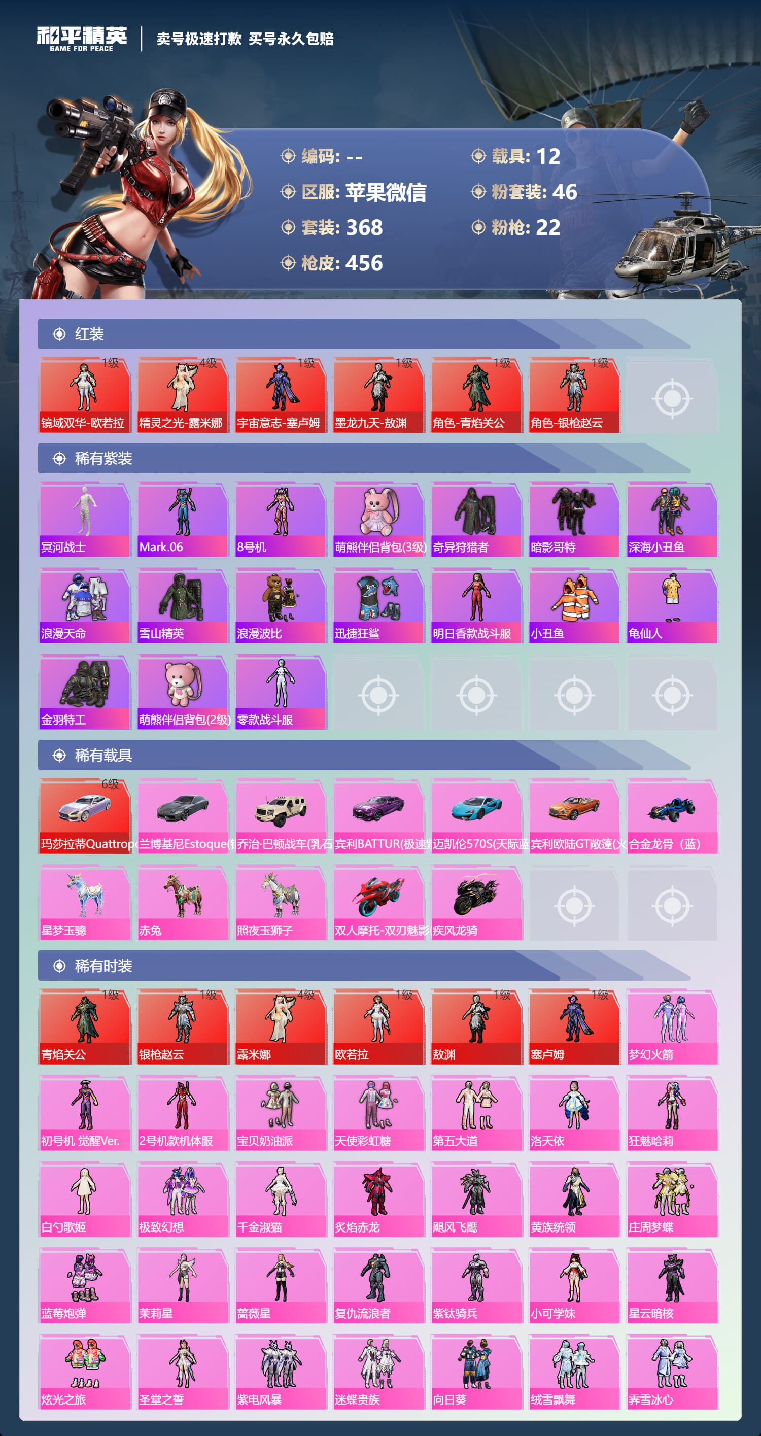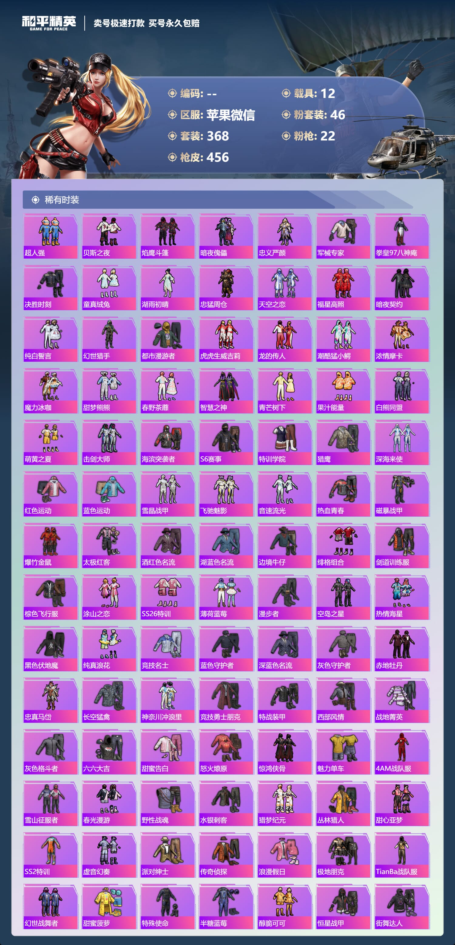 a4030/苹果微信/-18王牌印记-46粉装-22特效枪-12载具-193313热力值-368套装-456枪皮-9卓越印记-4传奇印记服务承诺: