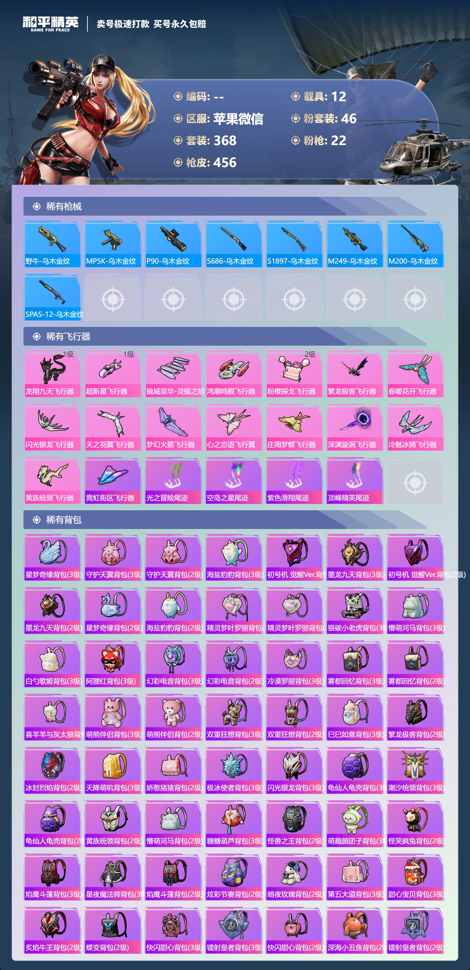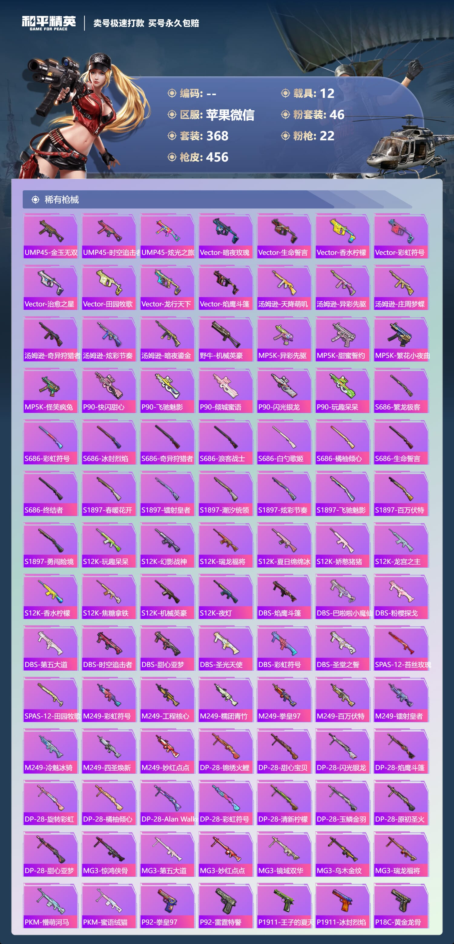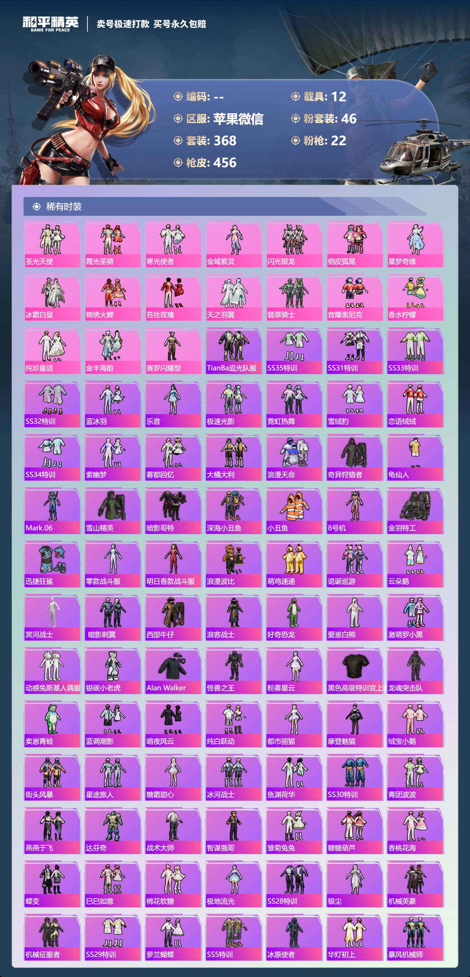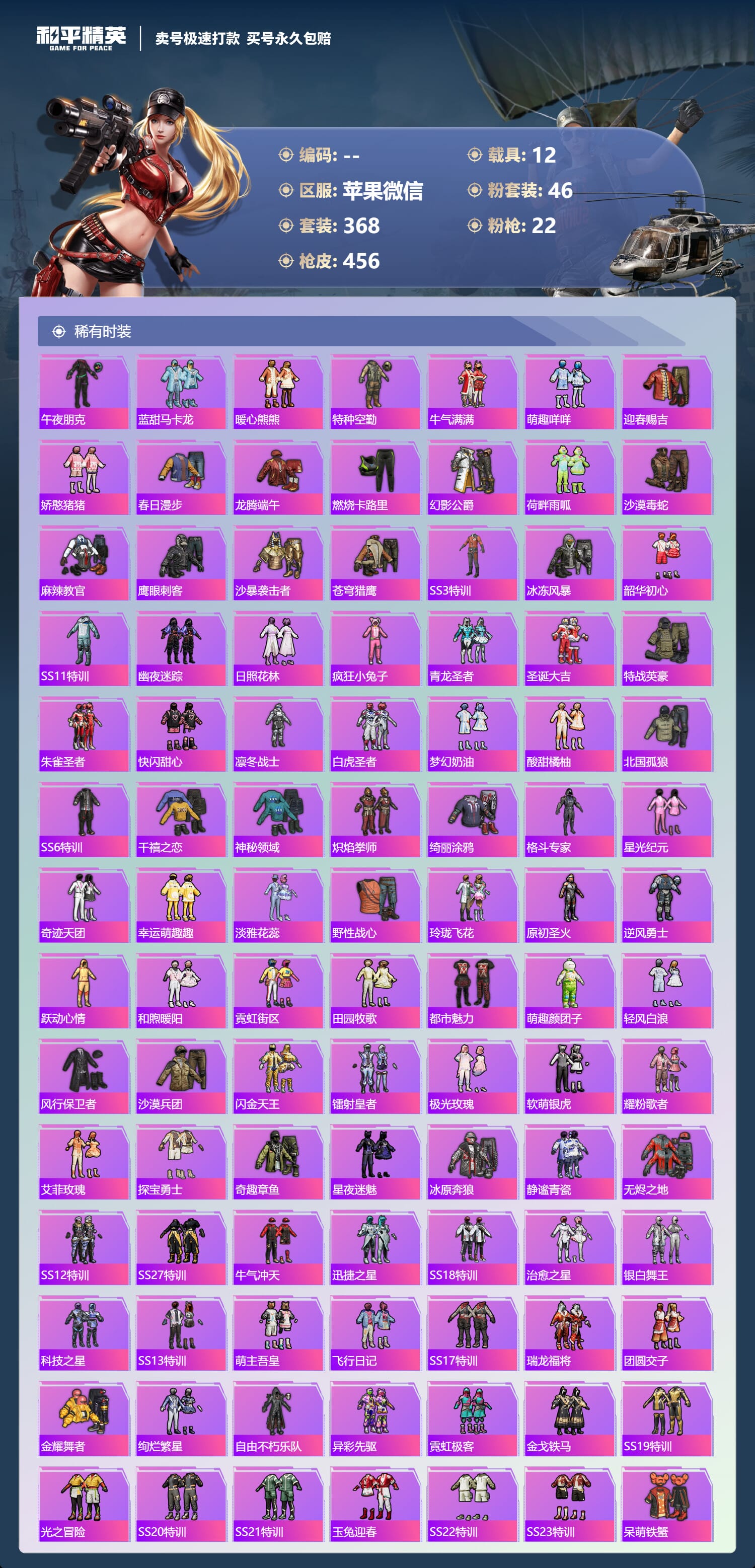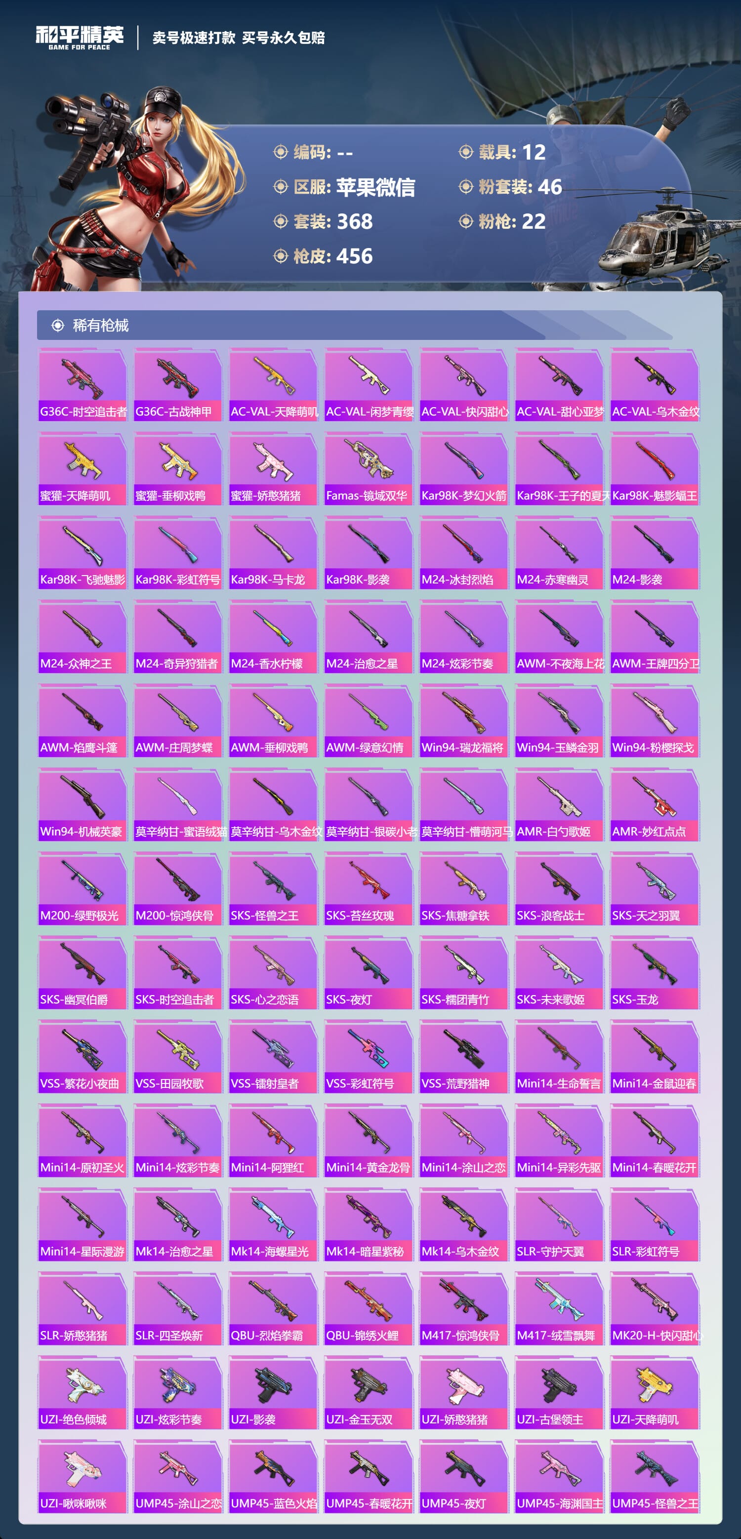 a4030/苹果微信/-18王牌印记-46粉装-22特效枪-12载具-193313热力值-368套装-456枪皮-9卓越印记-4传奇印记服务承诺:
