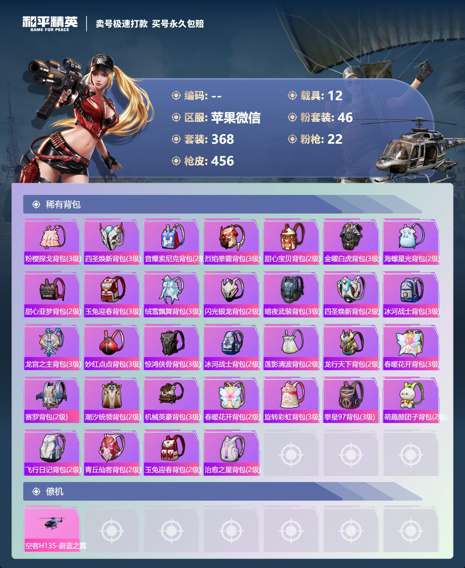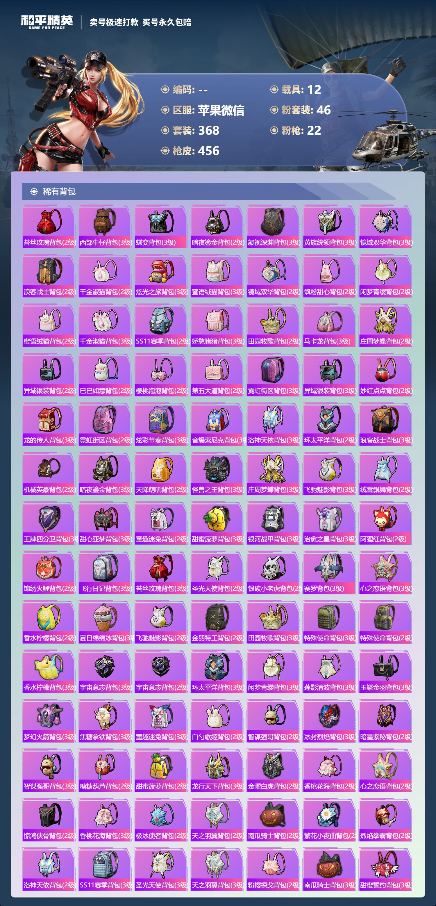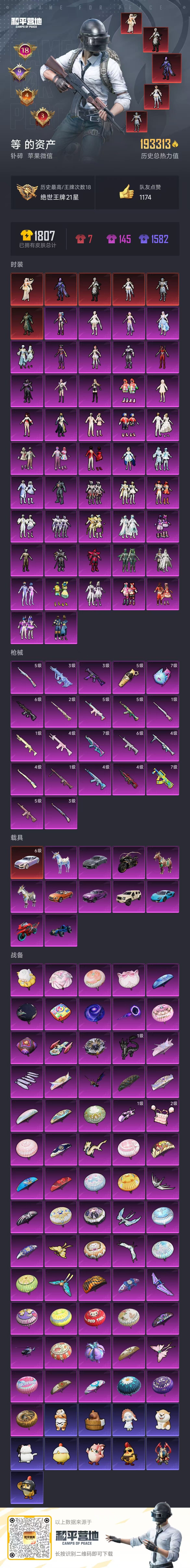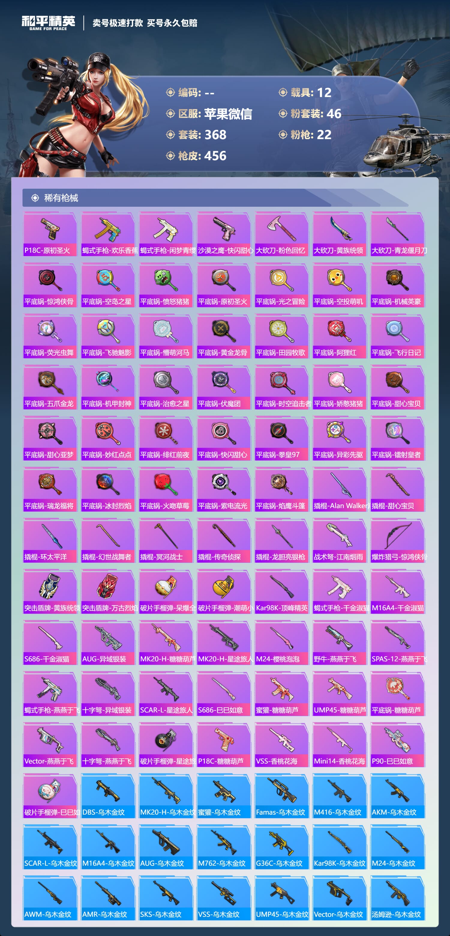 a4030/苹果微信/-18王牌印记-46粉装-22特效枪-12载具-193313热力值-368套装-456枪皮-9卓越印记-4传奇印记服务承诺: