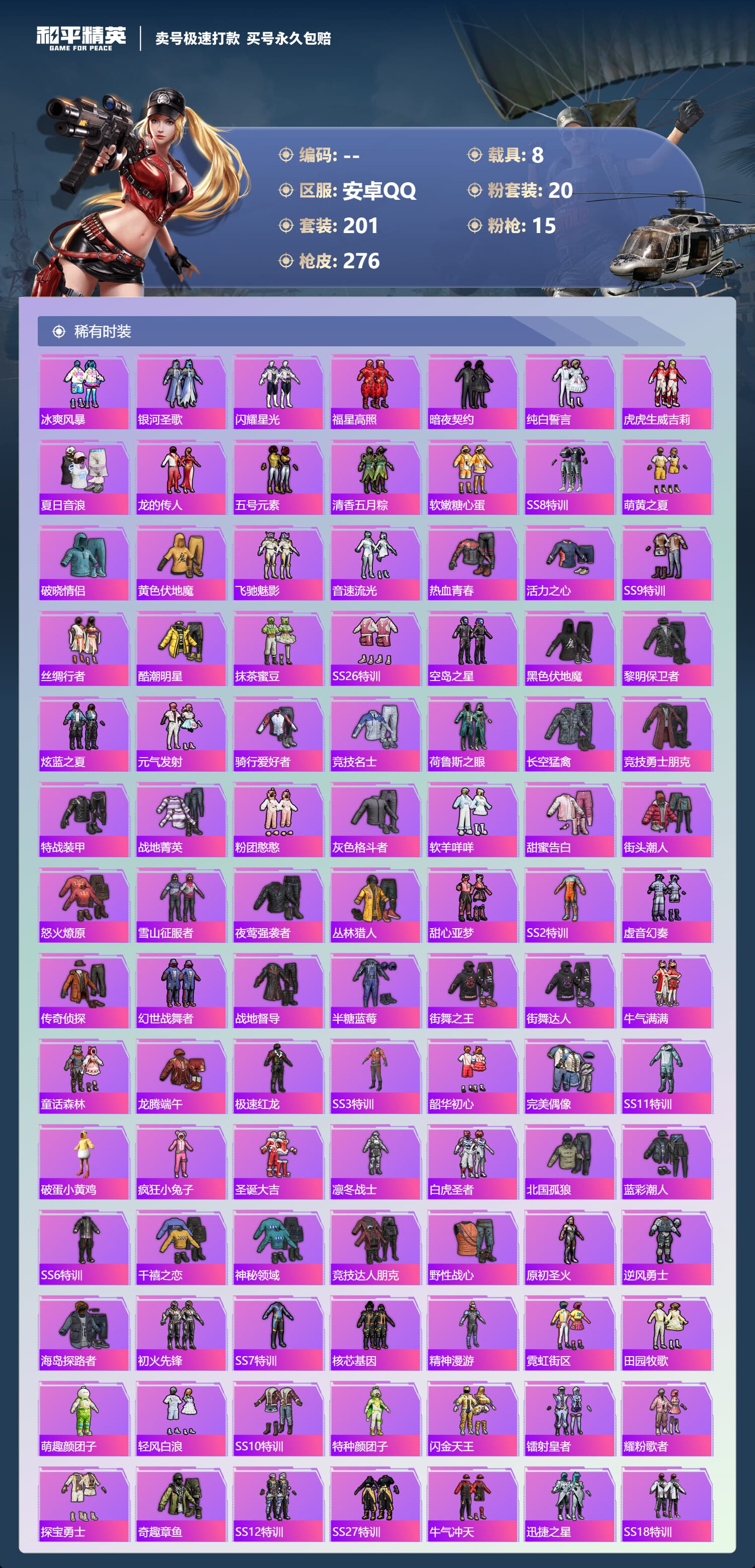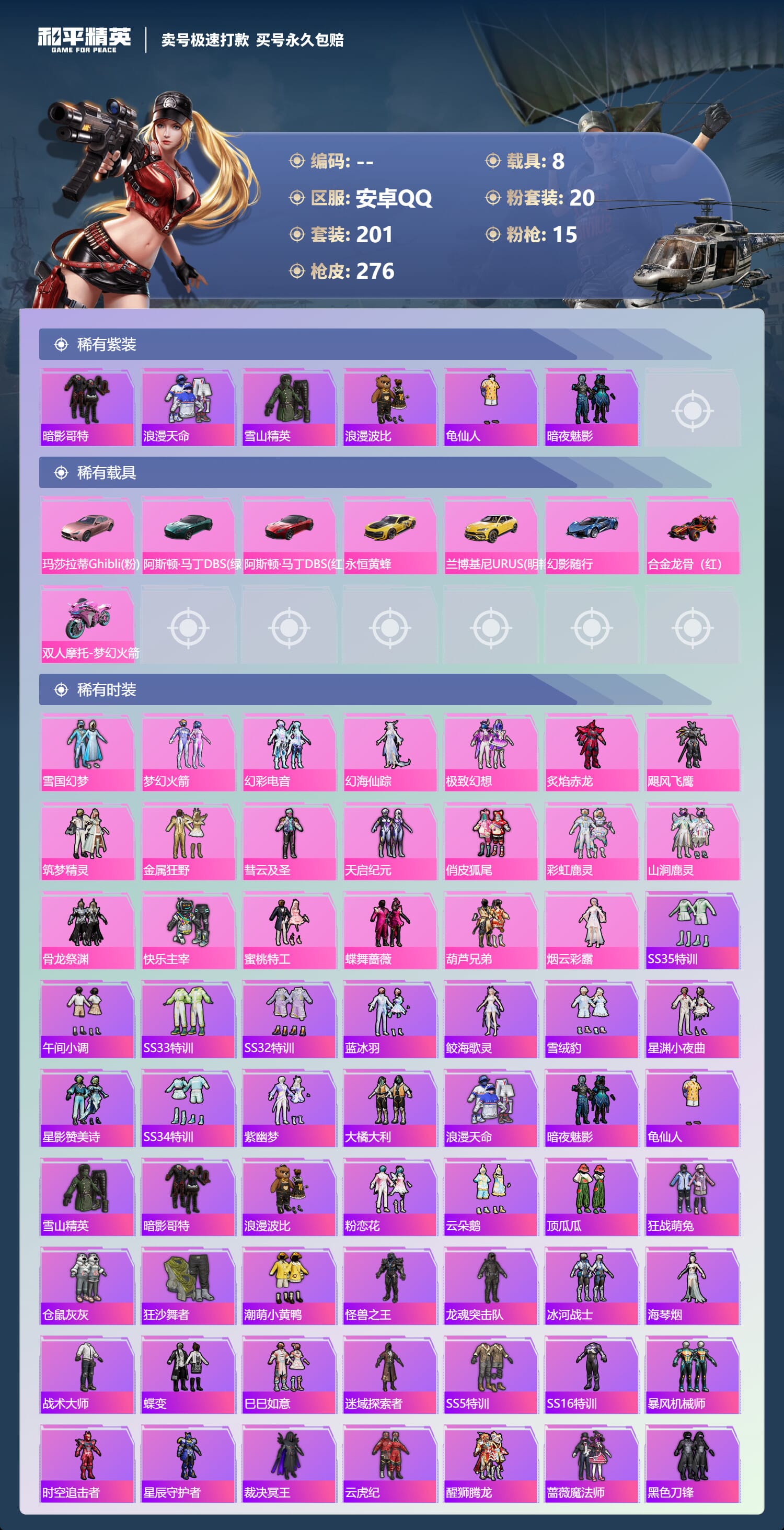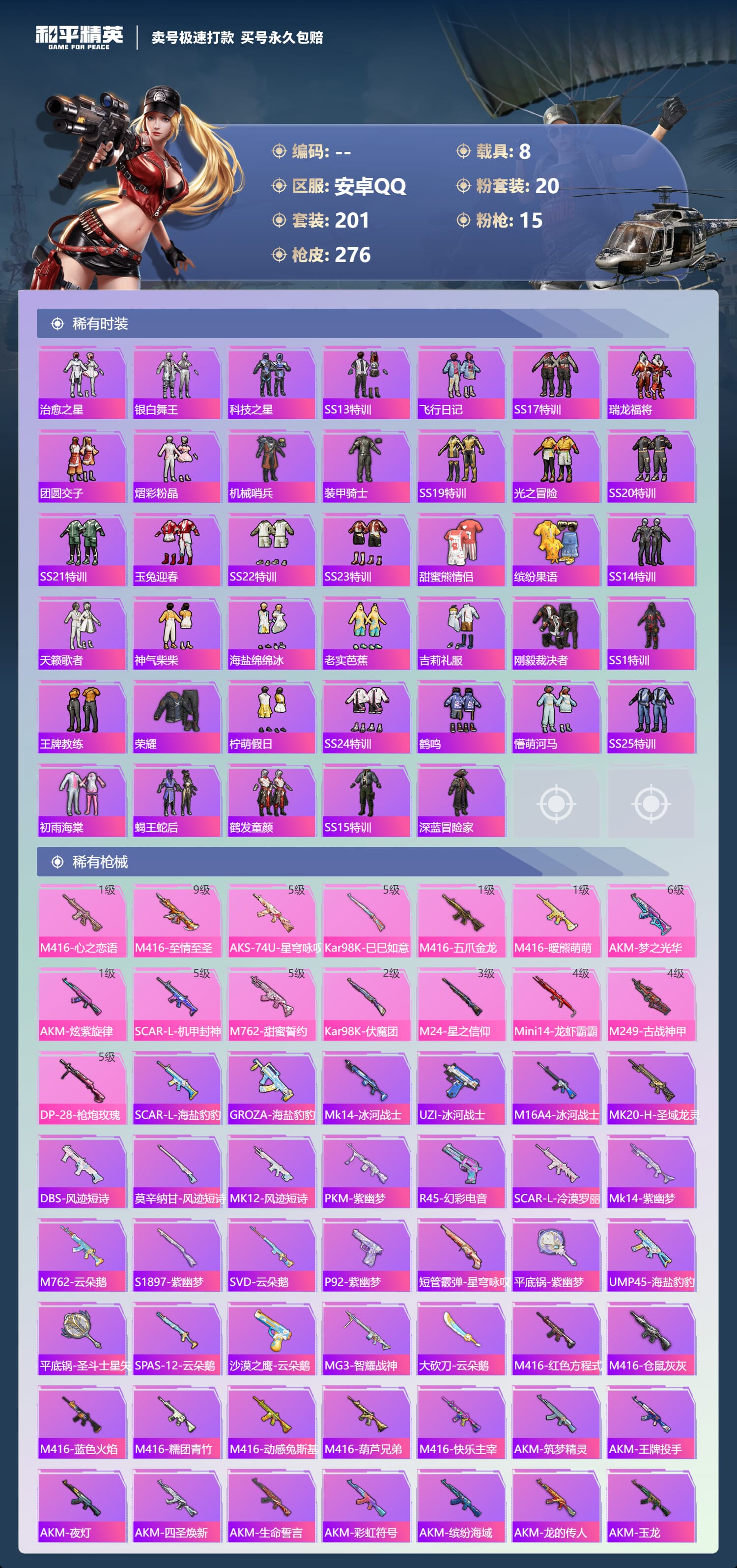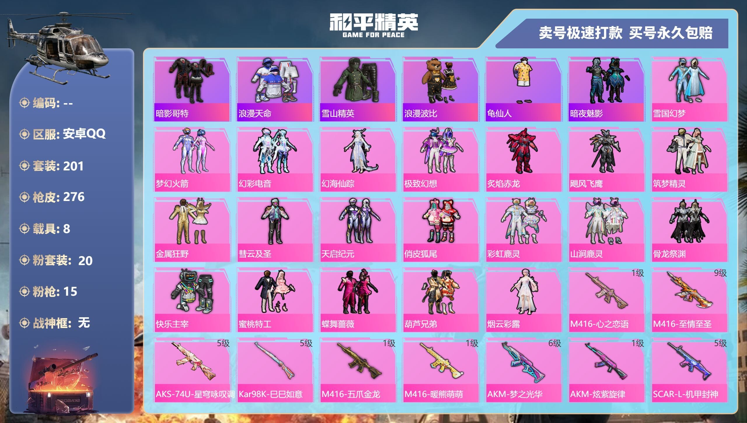 a4035/安卓QQ/-12王牌印记-20粉装-15特效枪-8载具-109969热力值-201套装-276枪皮-1卓越印记-0传奇印记服务承诺: