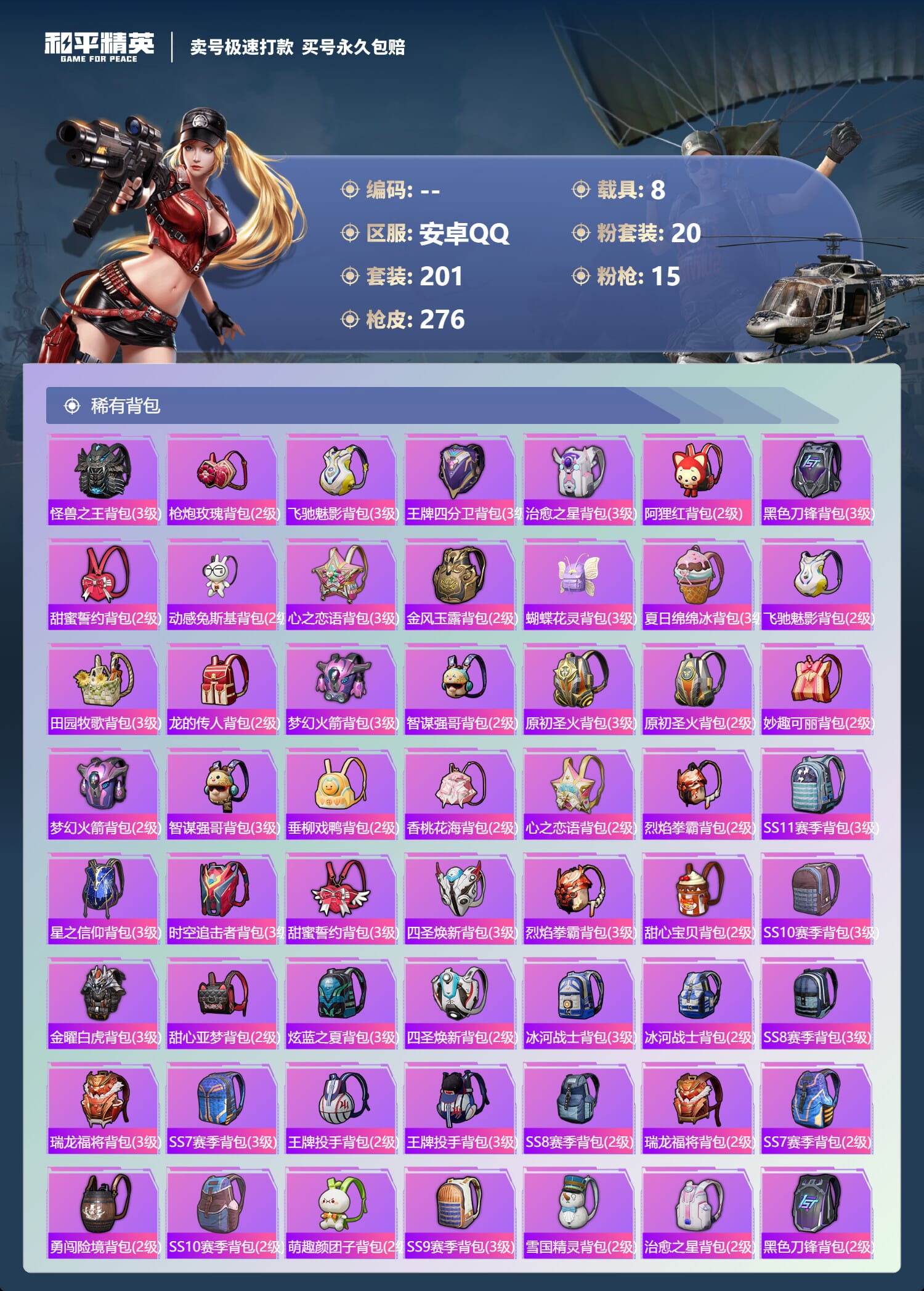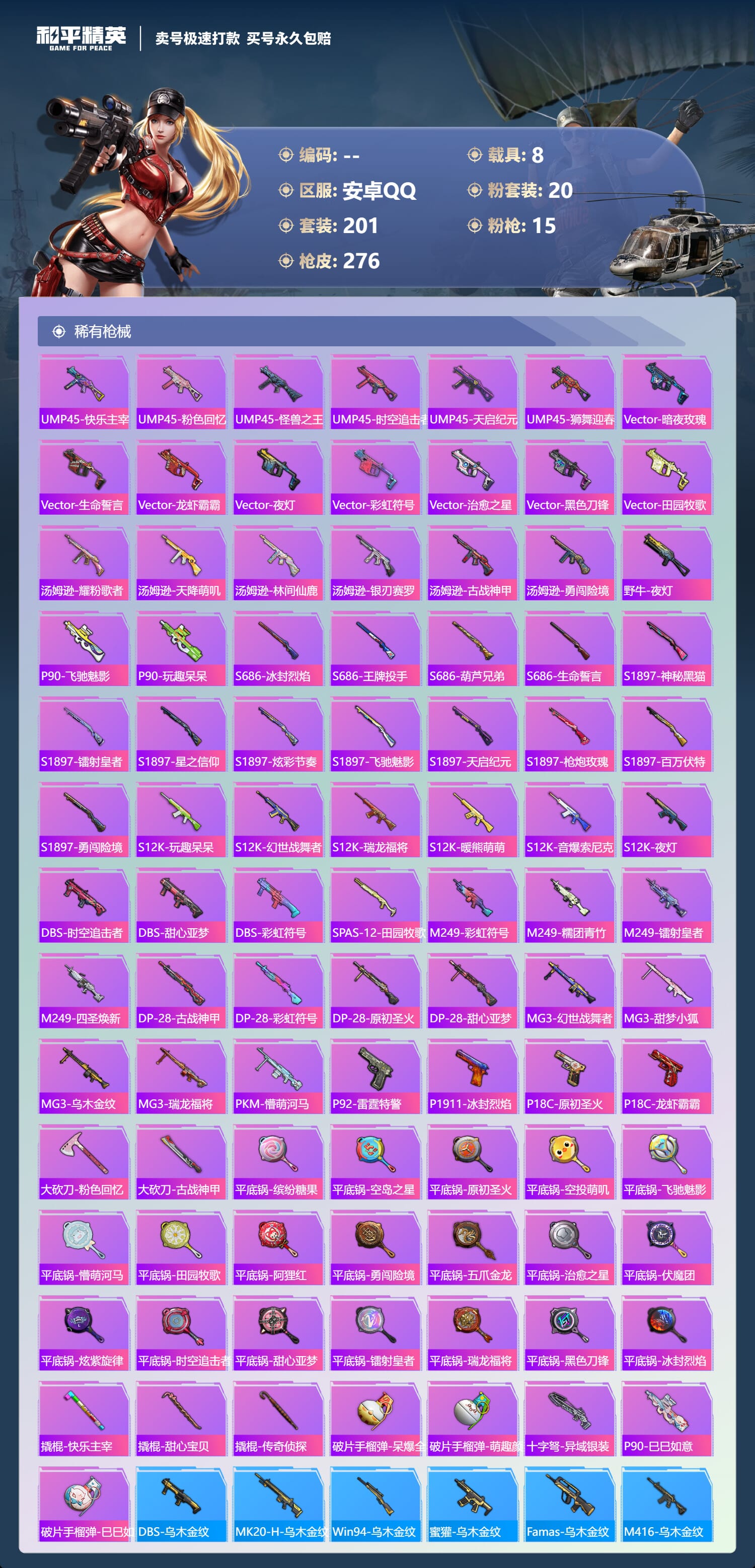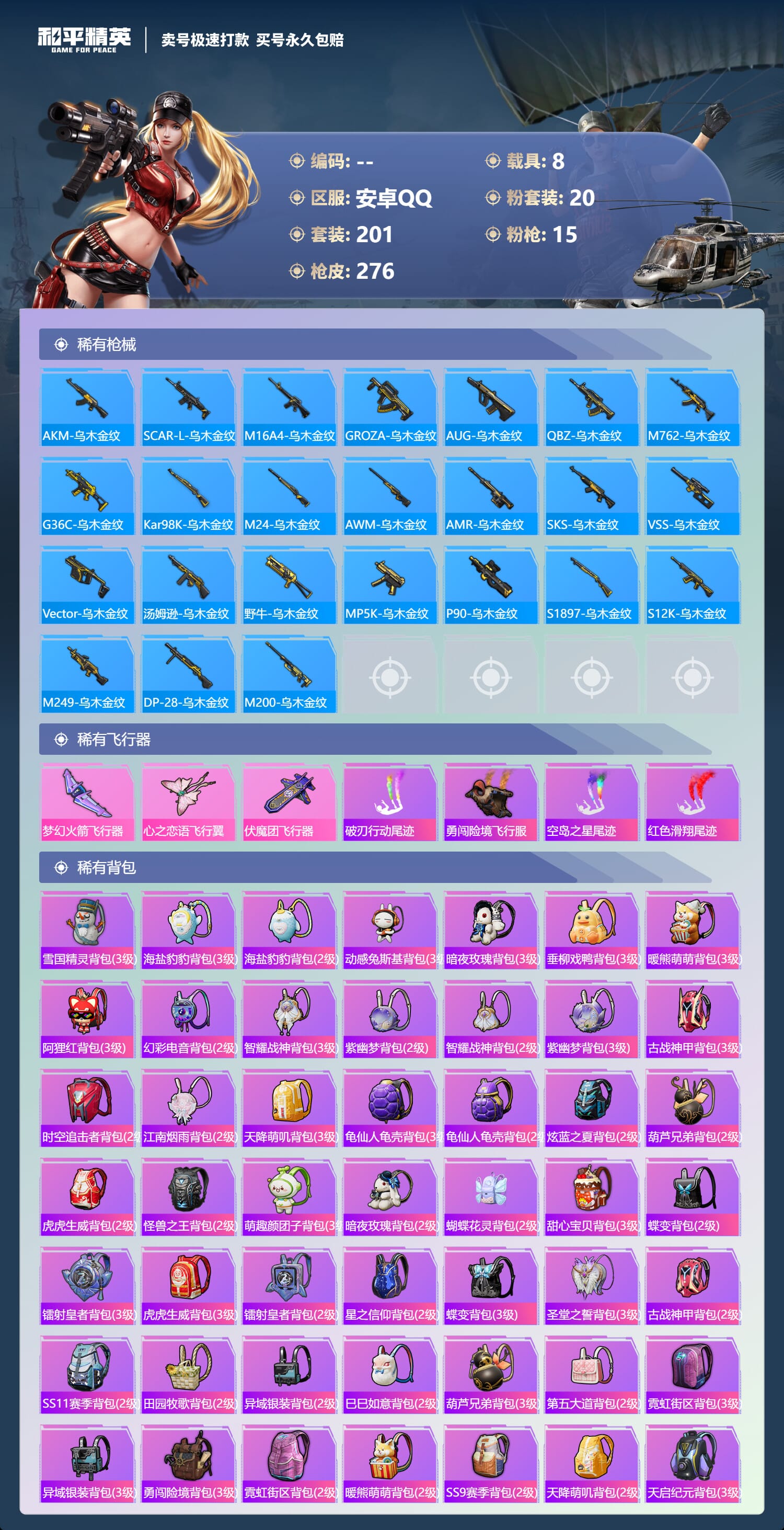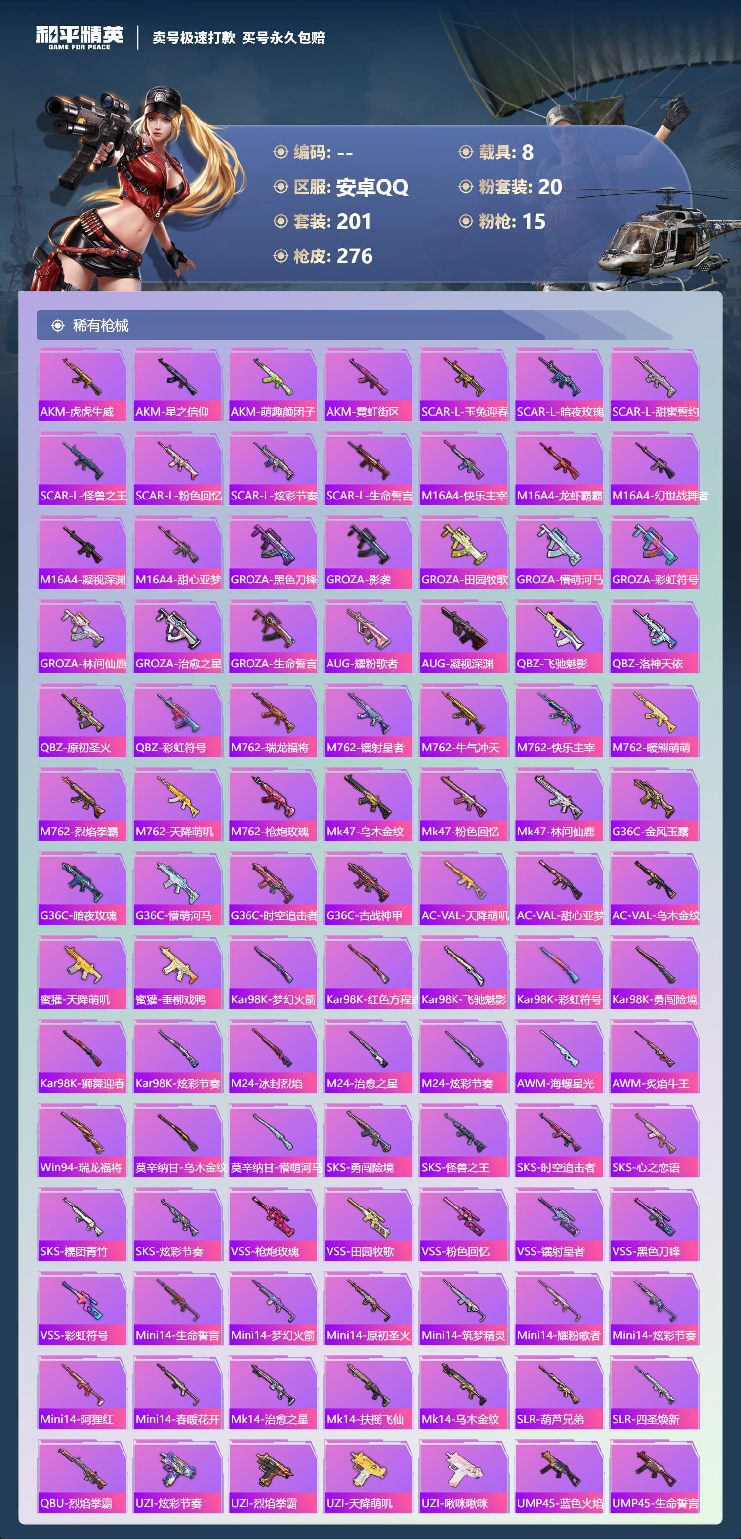 a4035/安卓QQ/-12王牌印记-20粉装-15特效枪-8载具-109969热力值-201套装-276枪皮-1卓越印记-0传奇印记服务承诺: