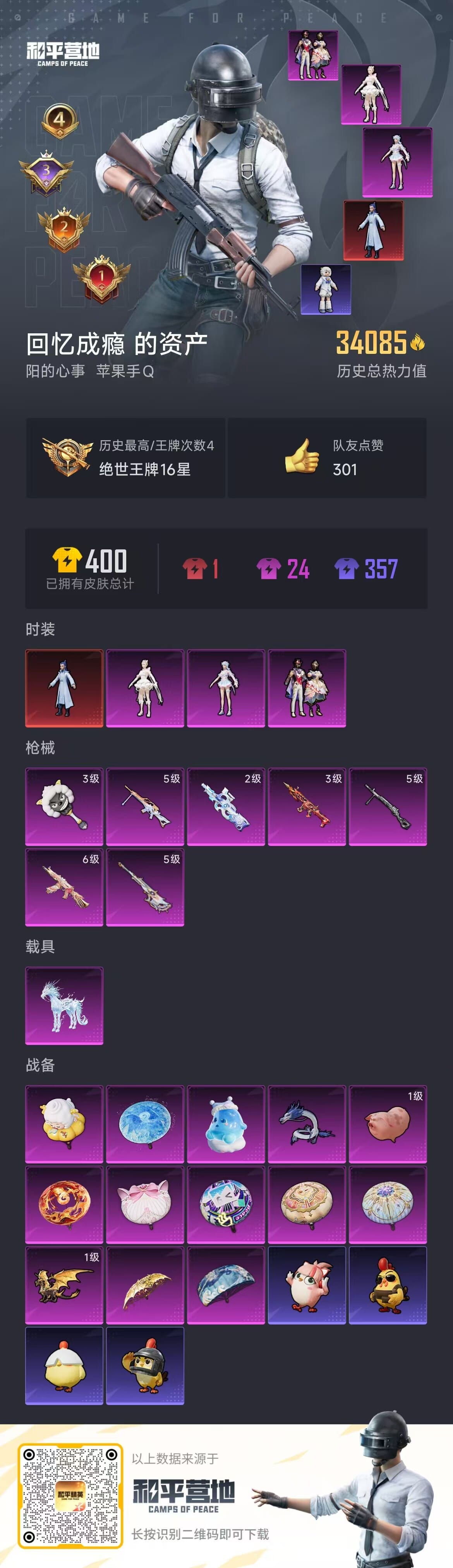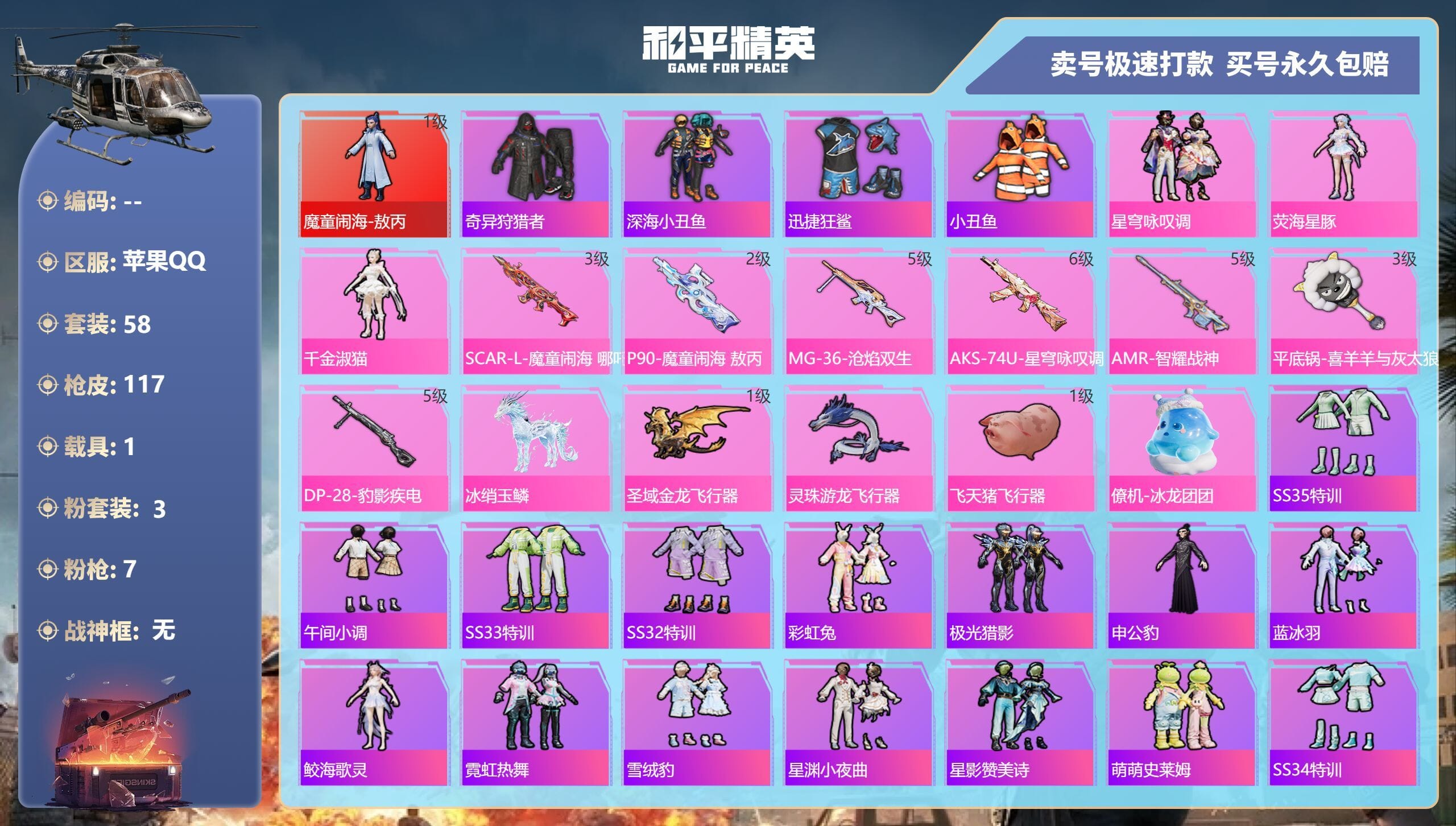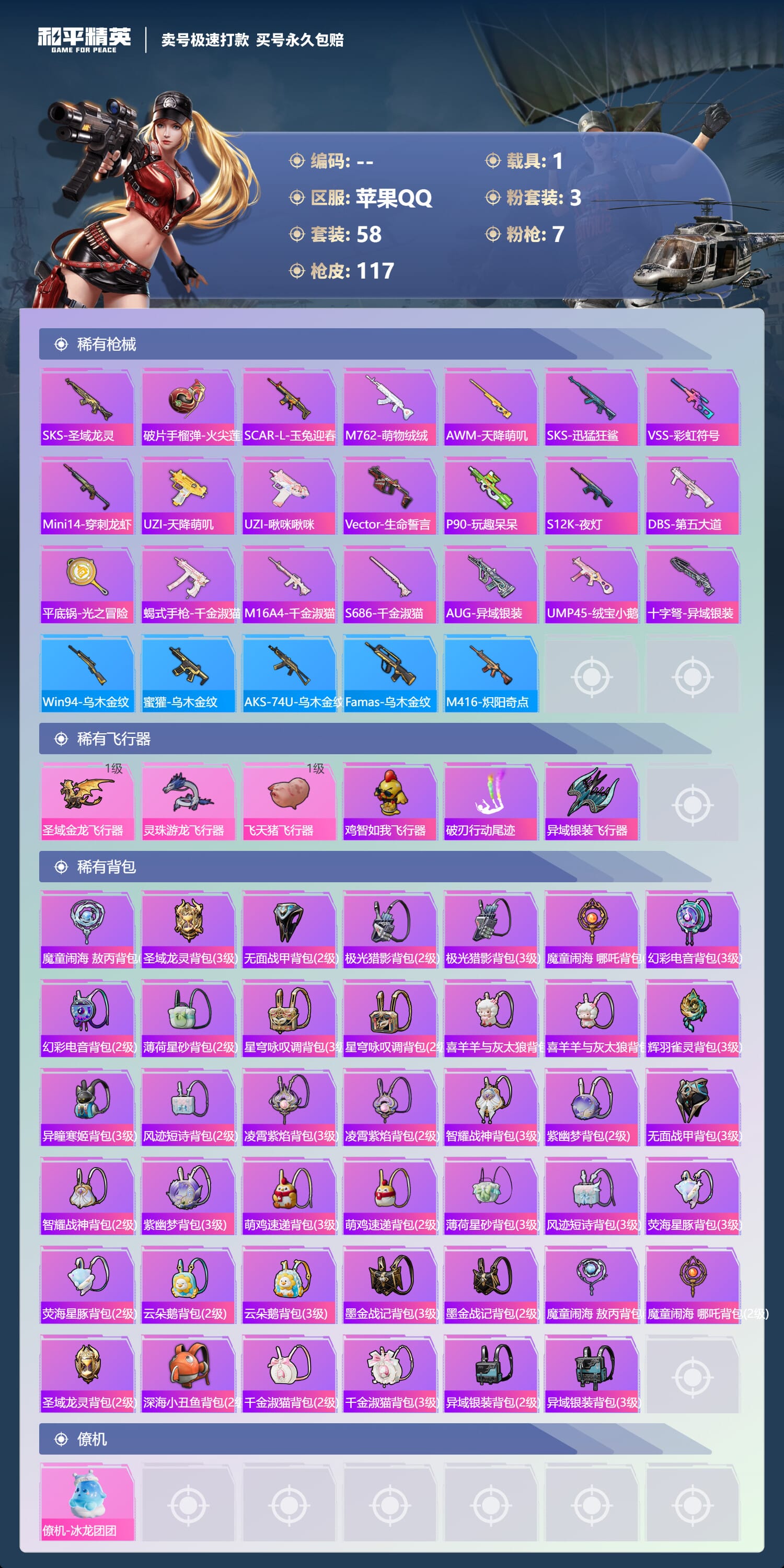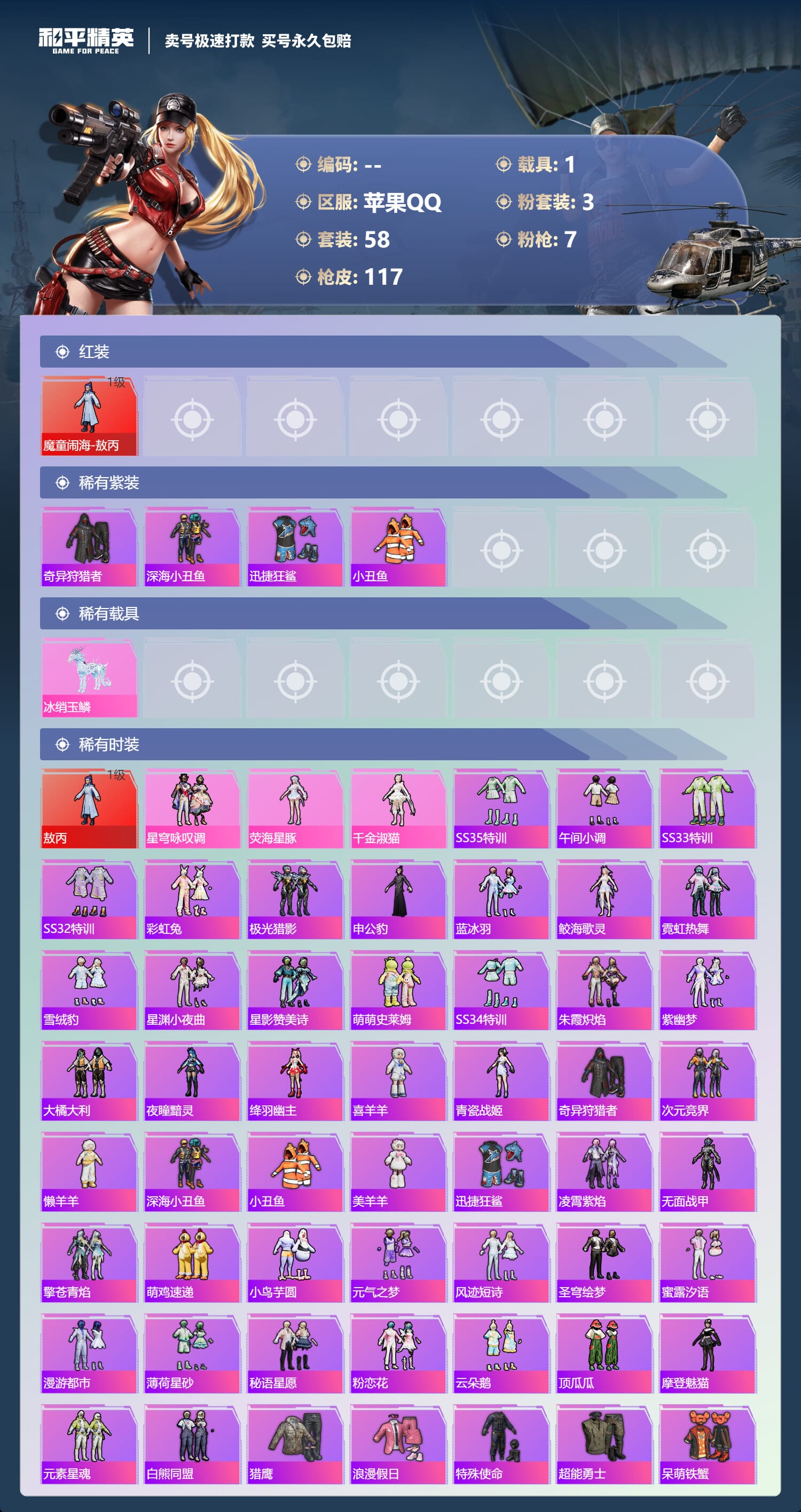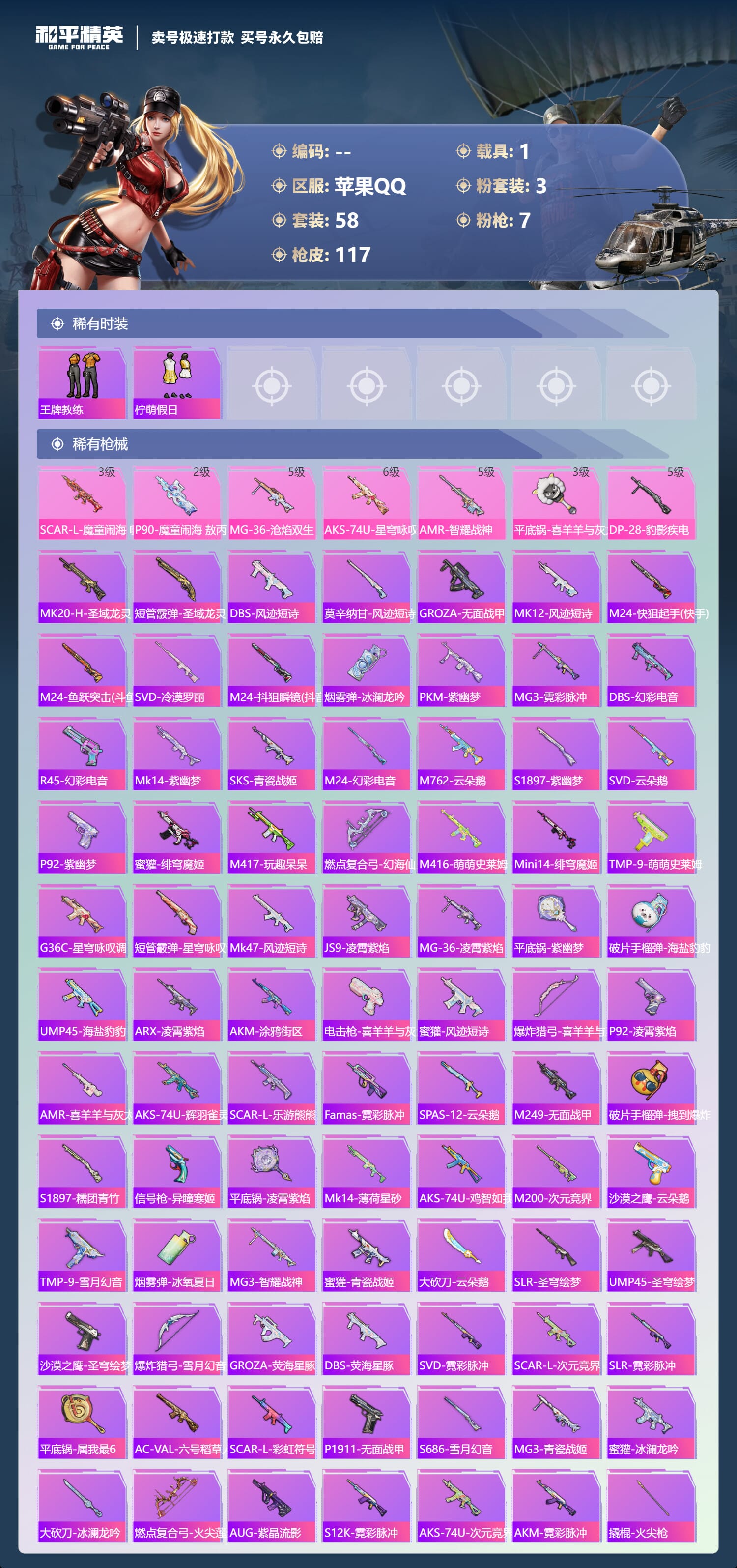 a4046/苹果QQ/-4王牌印记-3粉装-7特效枪-1载具-34085热力值-58套装-117枪皮-3卓越印记-2传奇印记服务承诺: