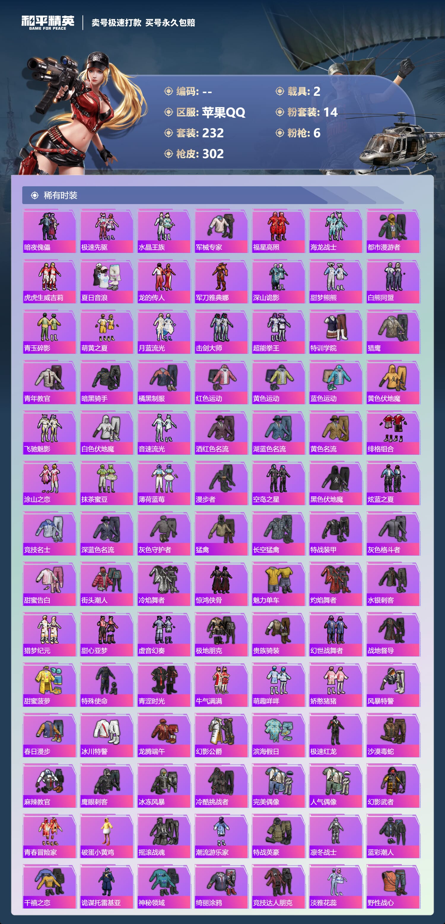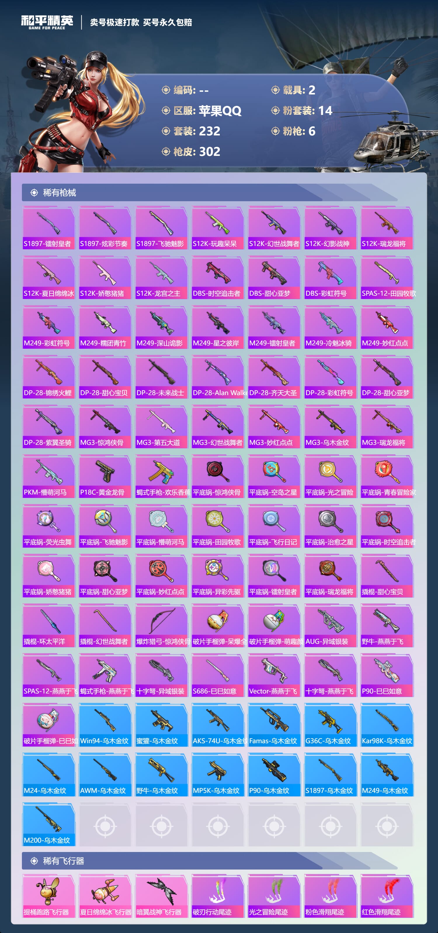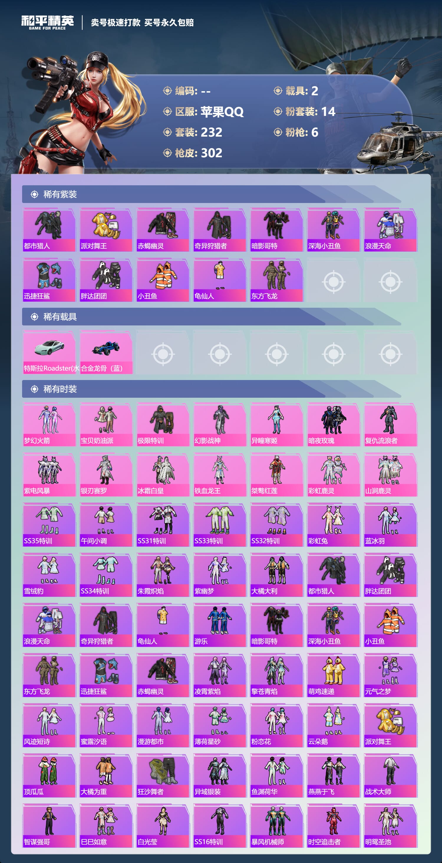 a4040/苹果QQ/一个车币/1500扭蛋碎片/-13王牌印记-14粉装-6特效枪-2载具-98516热力值-232套装-302枪皮-1卓越印记-0传奇印记服务承诺:
