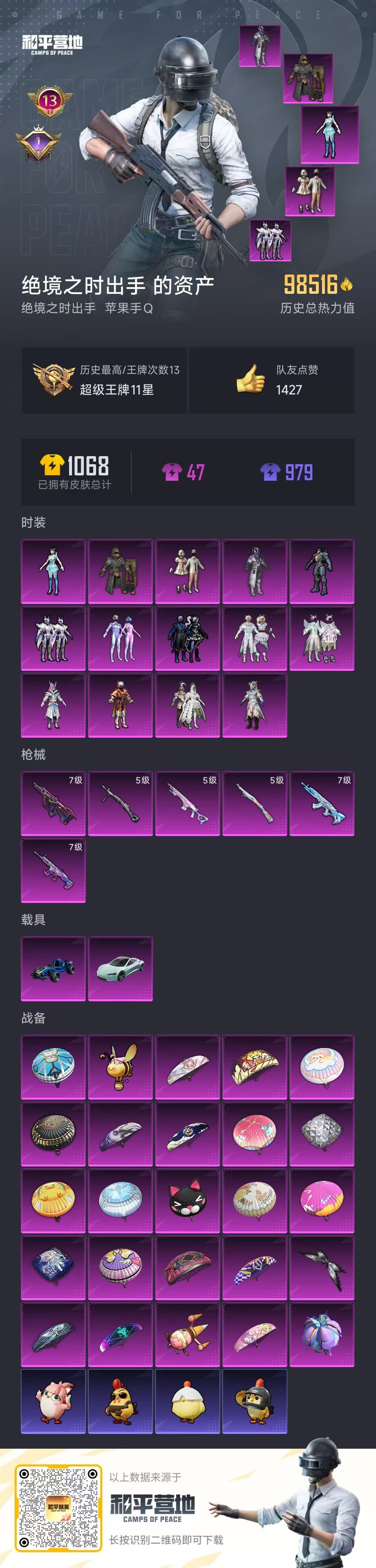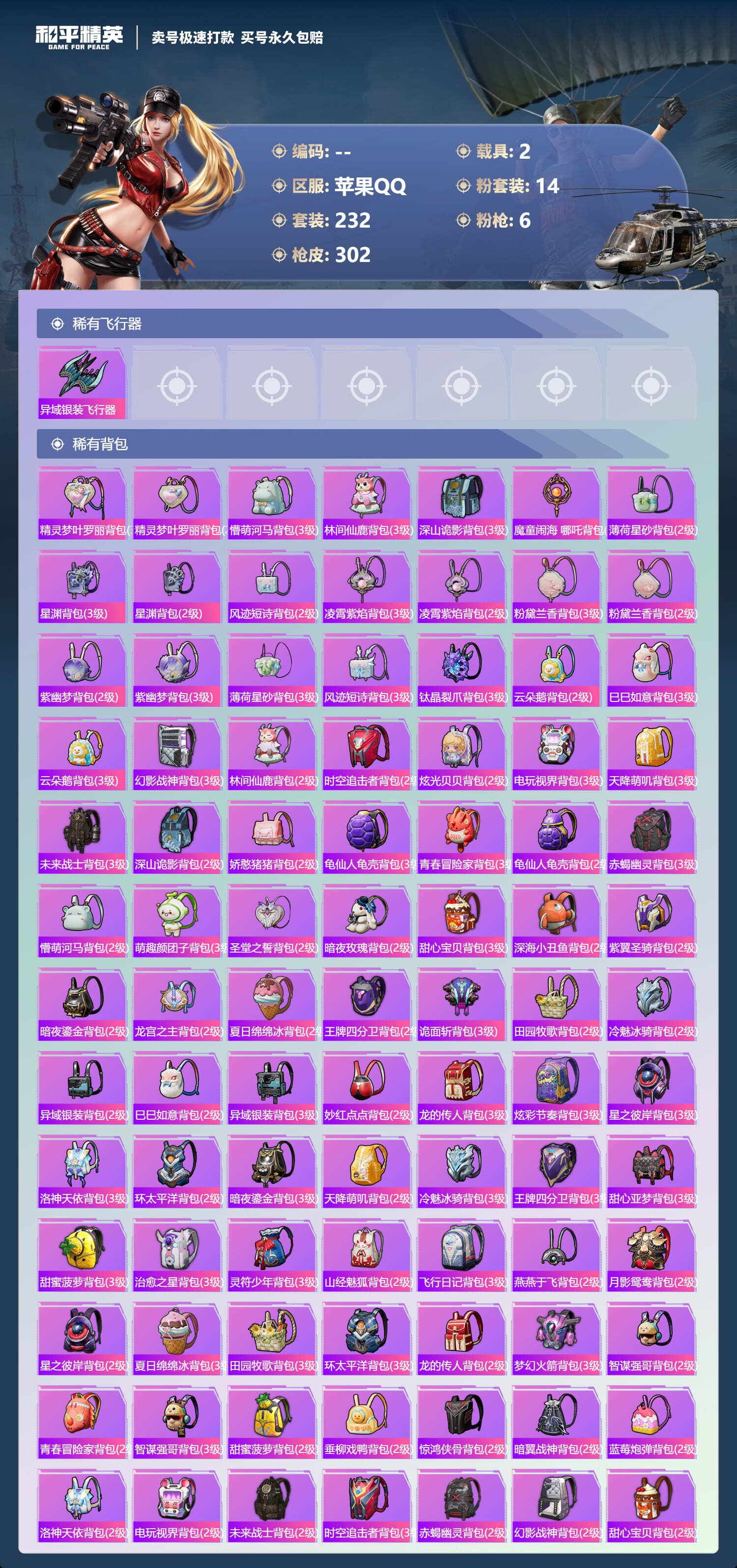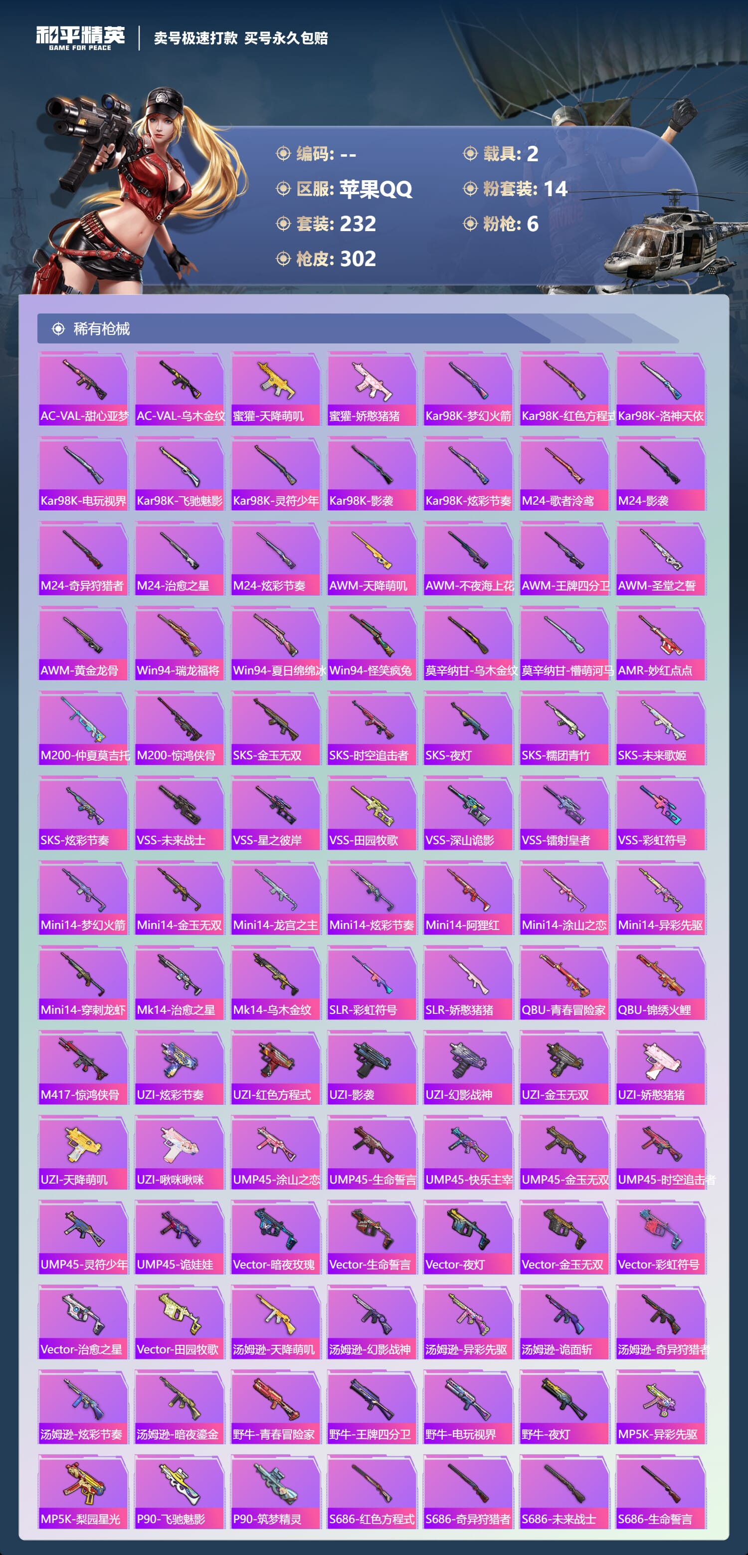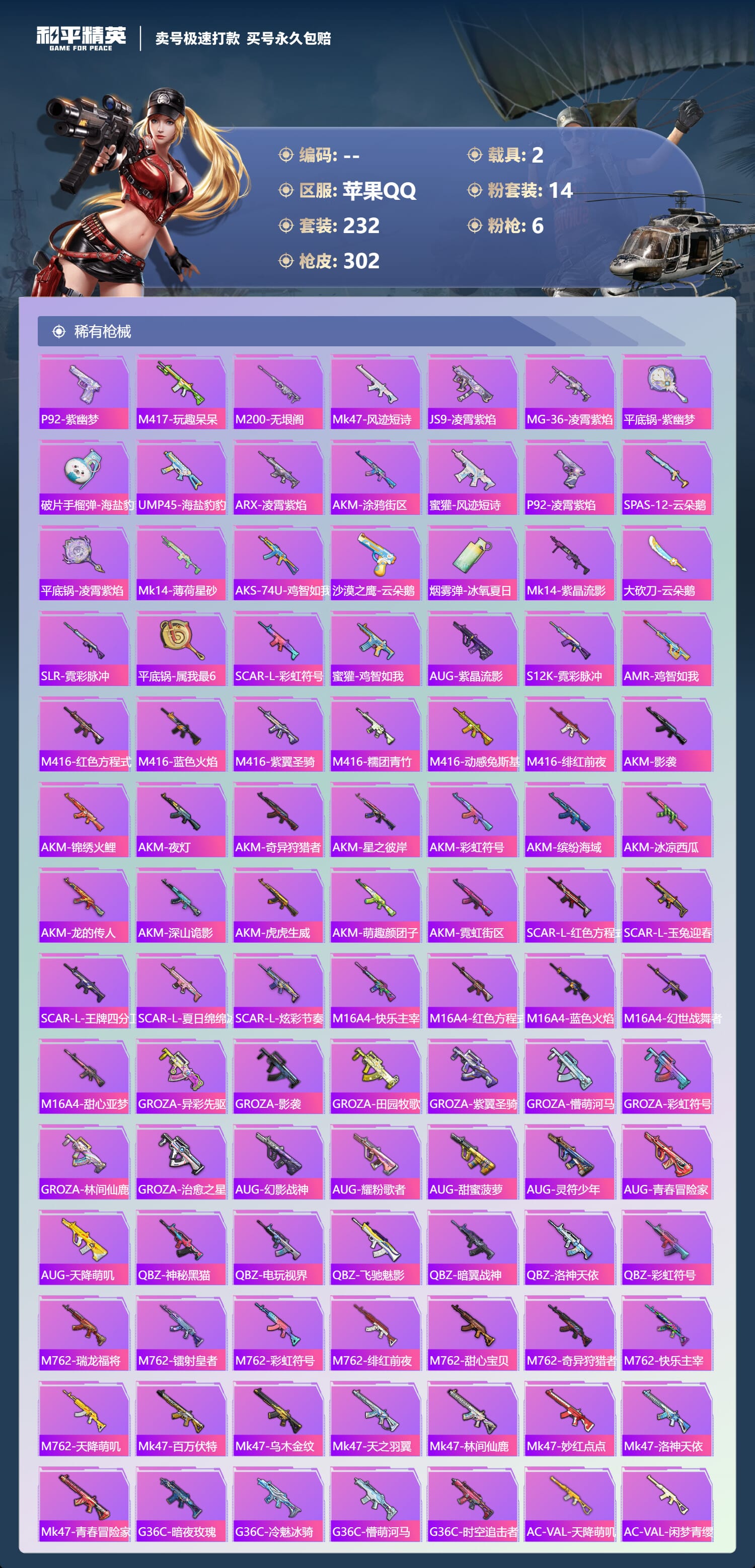 a4040/苹果QQ/一个车币/1500扭蛋碎片/-13王牌印记-14粉装-6特效枪-2载具-98516热力值-232套装-302枪皮-1卓越印记-0传奇印记服务承诺: