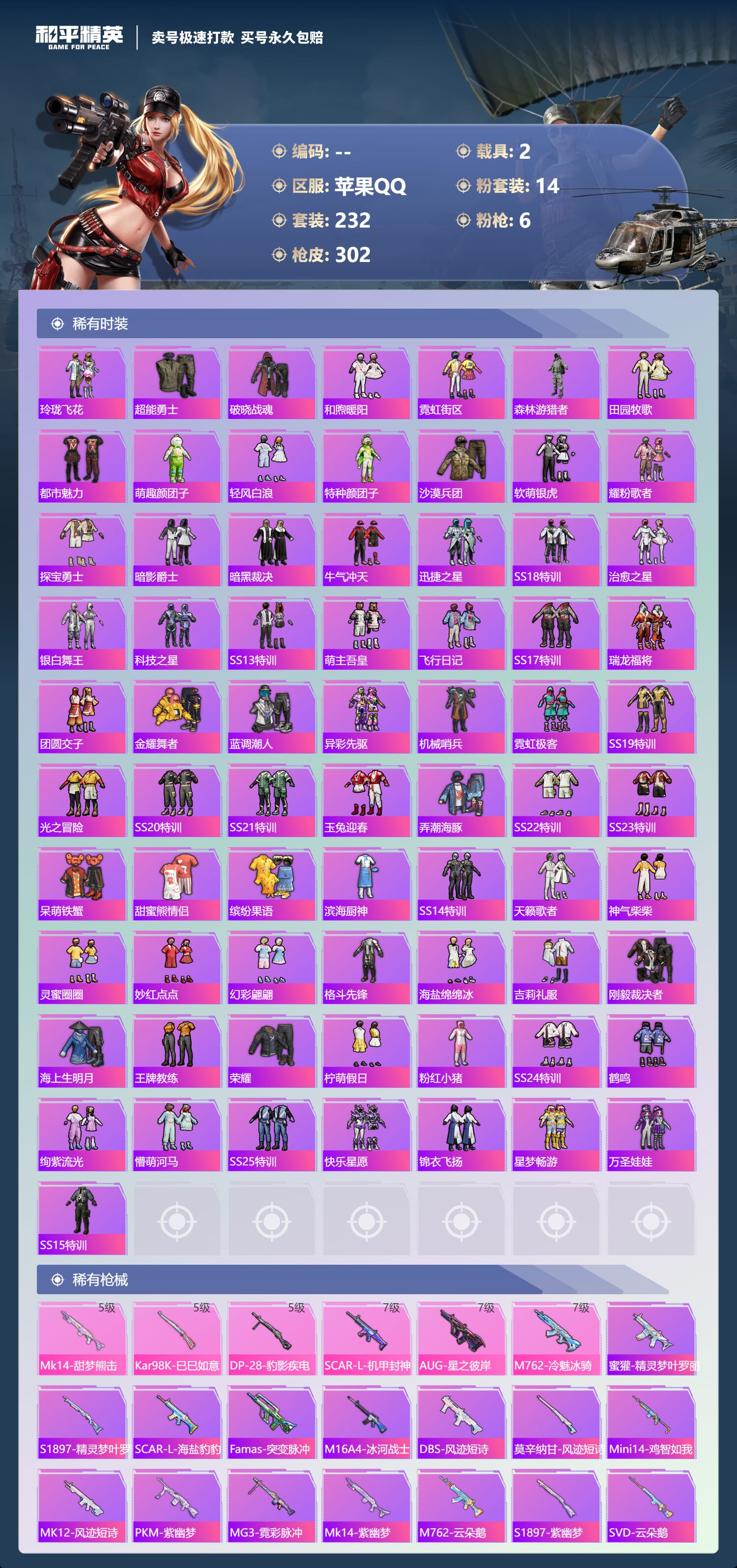 【安卓QQ】95套装-132枪皮 2王牌印记-1粉装-2特效枪-132枪皮-95套装-1载具 【1载具】 特斯拉Model X(珍珠白) 【1粉装】 零号机款机体服 【2特效枪】 Kar98K-巳巳如意 SCAR-L-锦绣绵绵 【3飞行器】 红色滑翔尾迹 紫色滑翔尾迹 黄色滑翔尾迹 【49热门】 M416-红色方程式 M416-乌木金纹 M416-夜灯 SCAR-L-红色方程式 UMP45-蓝色火焰 极速红龙 团圆交子 瑞龙福将 M416-蓝色火焰 M762-瑞龙福将 M762-乌木金纹 特训学院 黄色伏地魔 白色伏地魔 黑色伏地魔 骑行爱好者 长空猛禽 竞技勇士朋克 黄色格斗者 灰色格斗者 坚韧舞者 风暴特警 众神之王 甜心亚梦 虚音幻奏 懵萌河马 真理款战斗服 GROZA-乌木金纹 雪山精英(老6服) 战地名士 春日漫步 AUG-怪笑疯兔 黄螳螂 梦魇先生 AUG-怪笑疯兔 万圣娃娃 PEL摇滚竞梦者 活力之心 黑色刀锋 SS24特训 SS25特训 SS2特训 SS3特训 SS10特训 SS8特训 SS9特训 S5赛事 SS6特训 海岛探路者