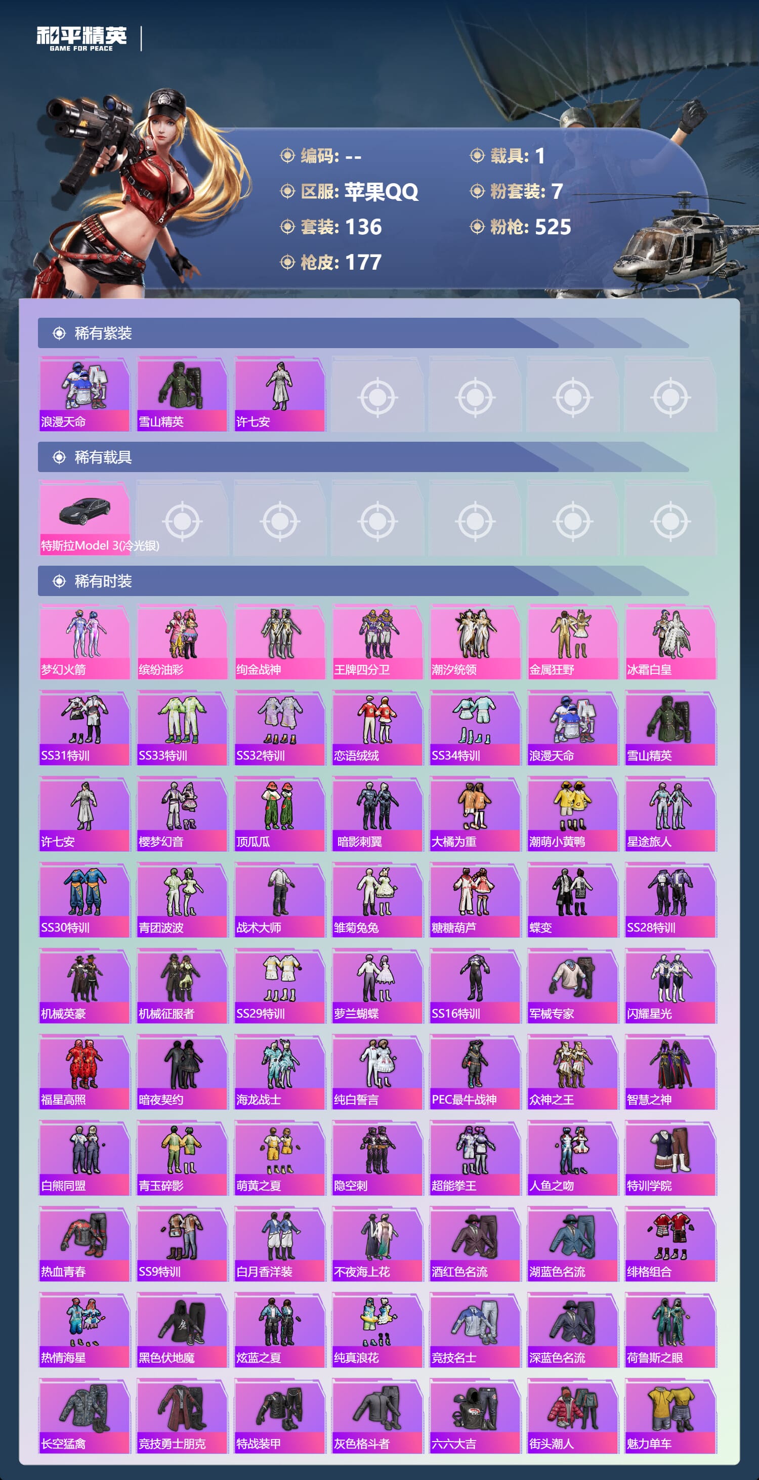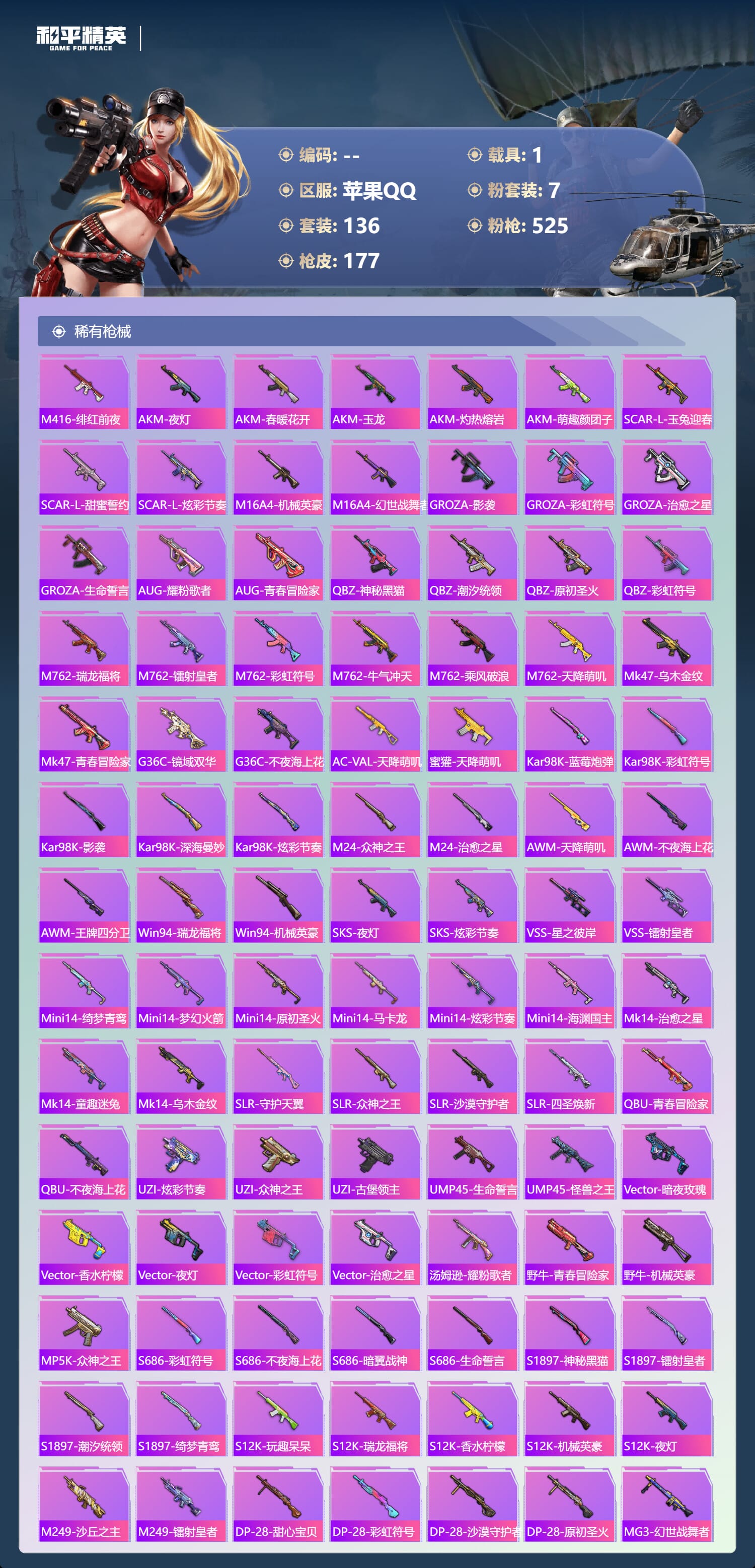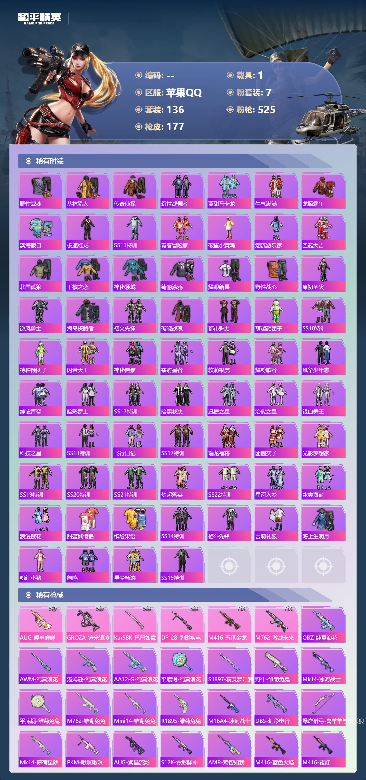 a4056/苹果QQ/-8王牌印记-7粉装-6特效枪-1载具-65425热力值-136套装-177枪皮-1卓越印记-1传奇印记服务承诺: