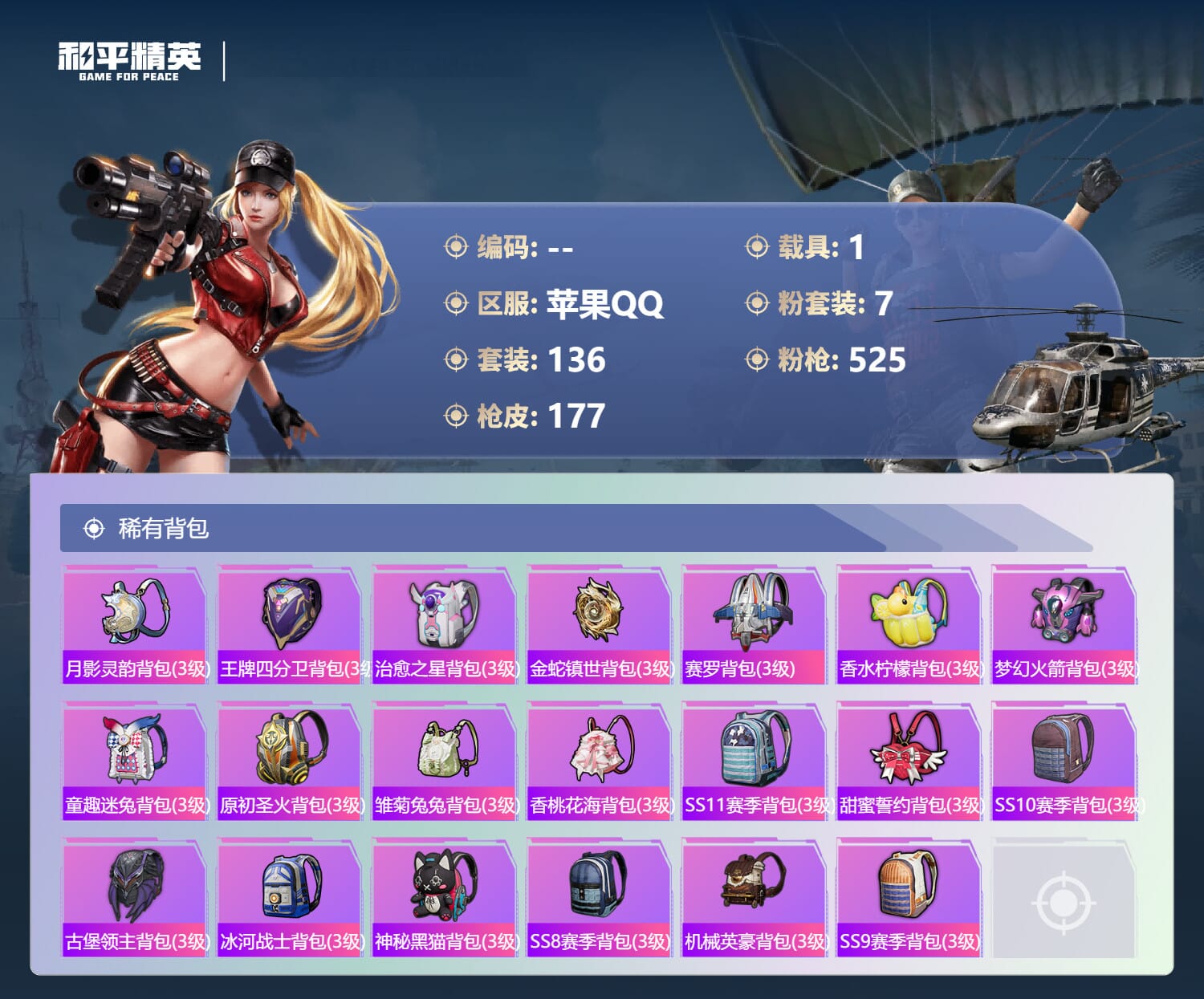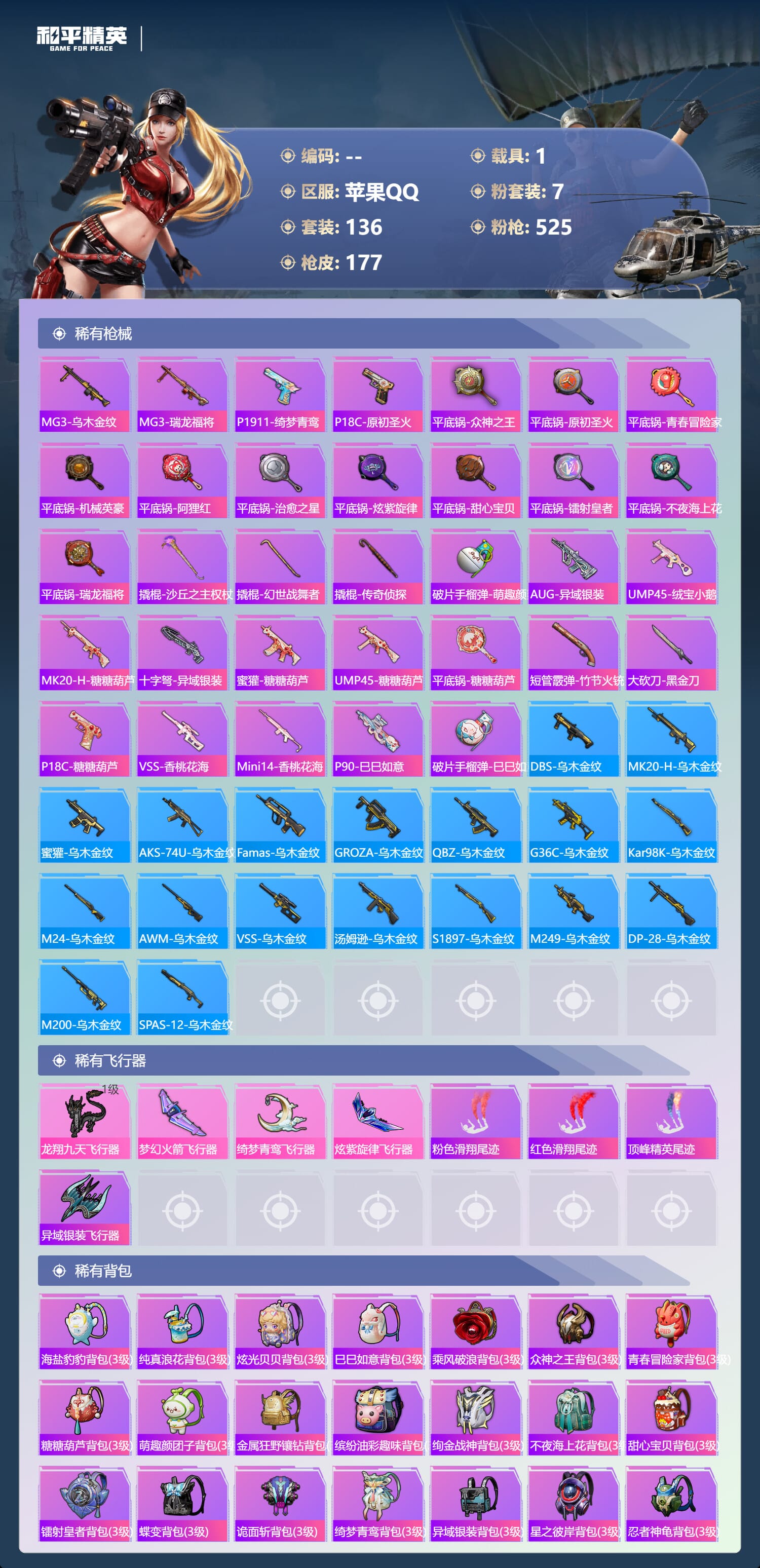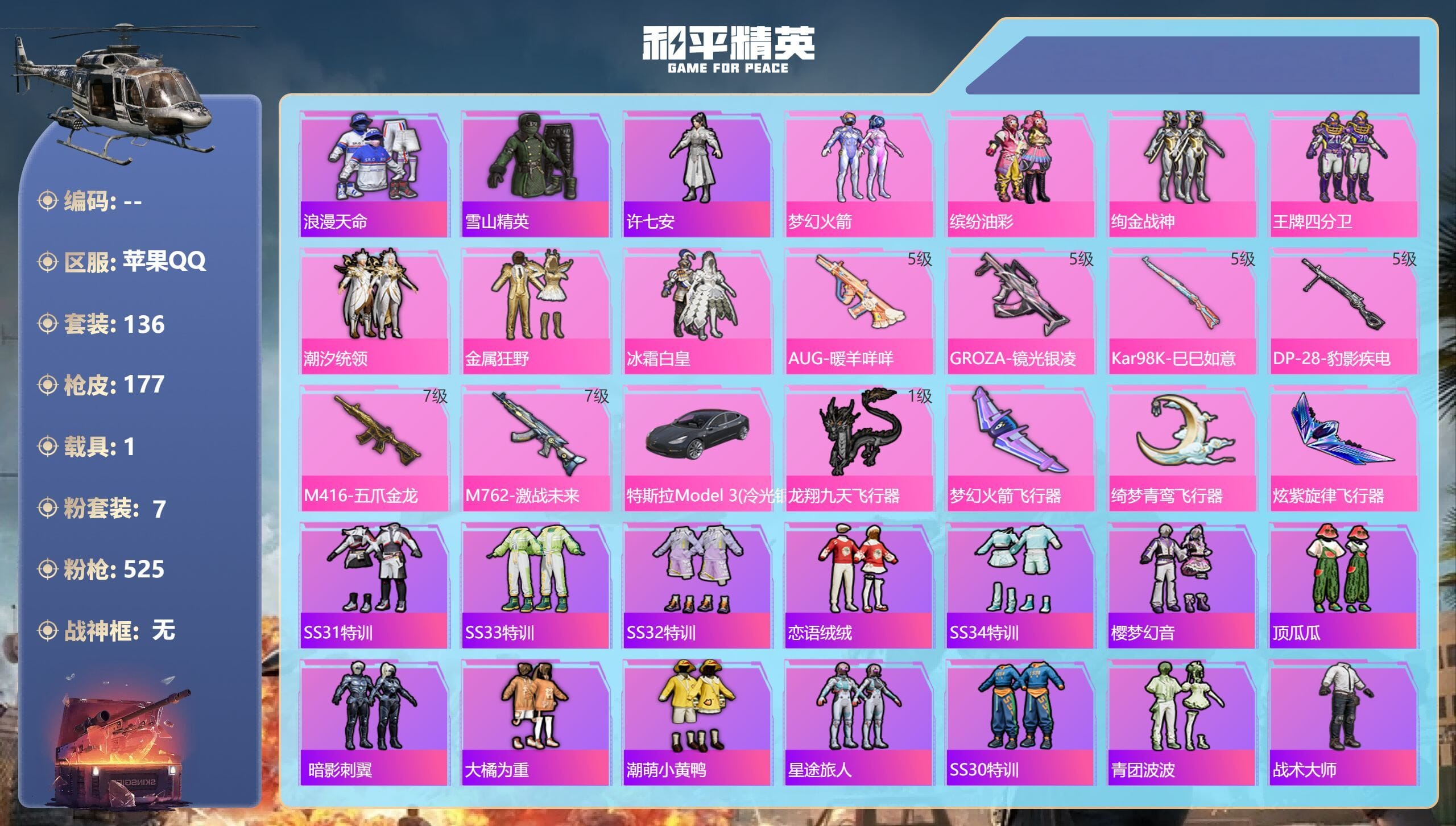 a4056/苹果QQ/-8王牌印记-7粉装-6特效枪-1载具-65425热力值-136套装-177枪皮-1卓越印记-1传奇印记服务承诺: