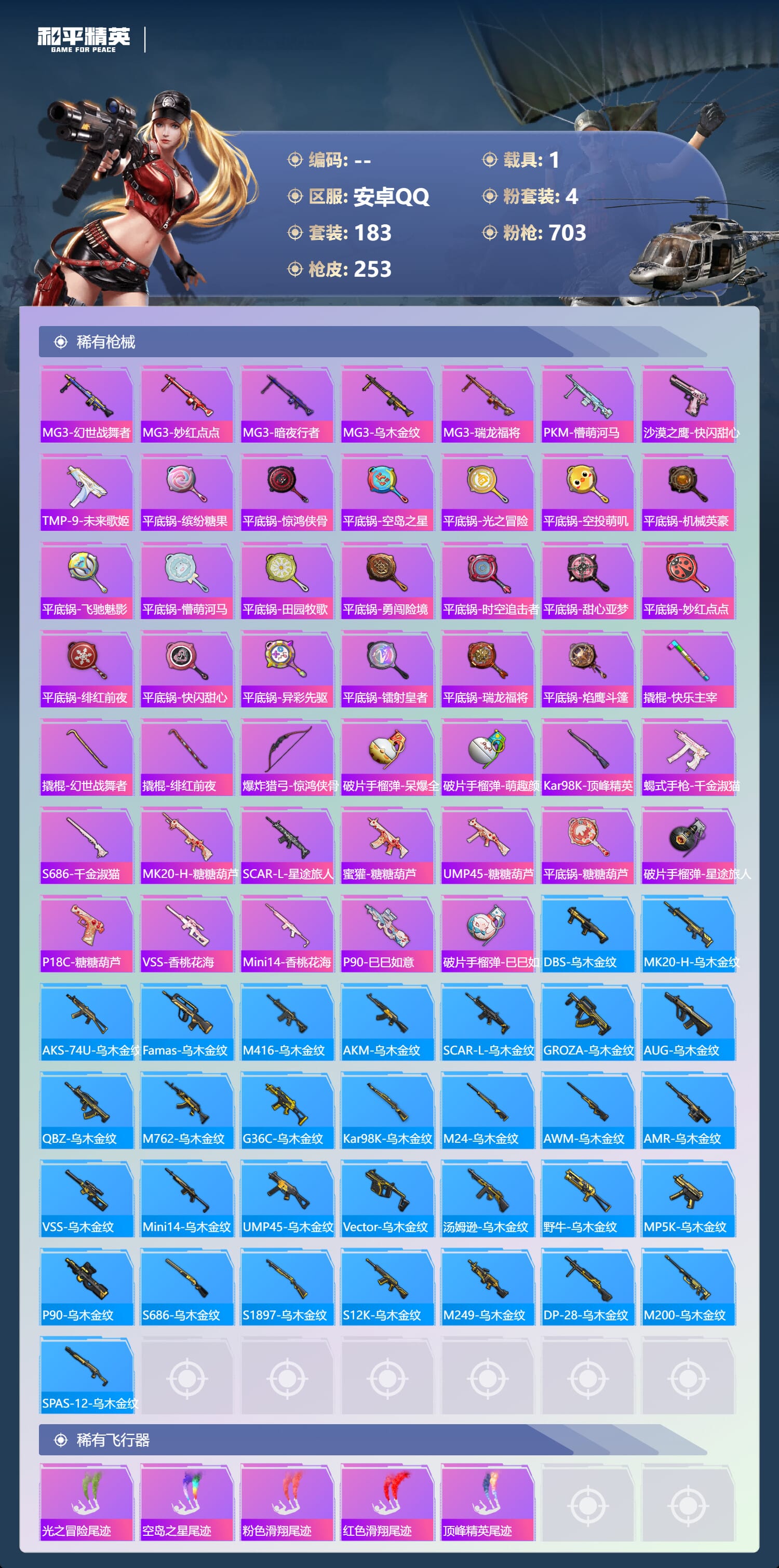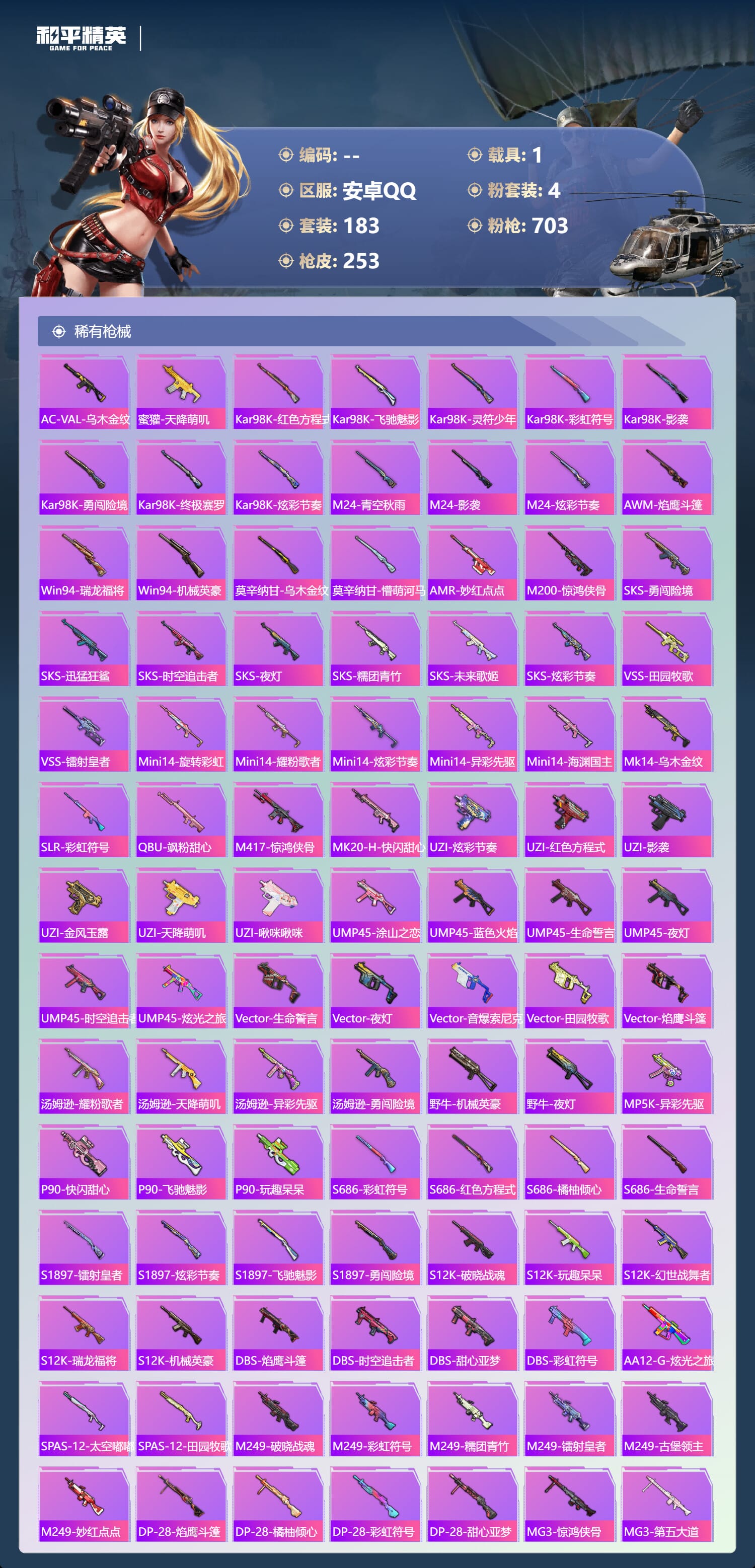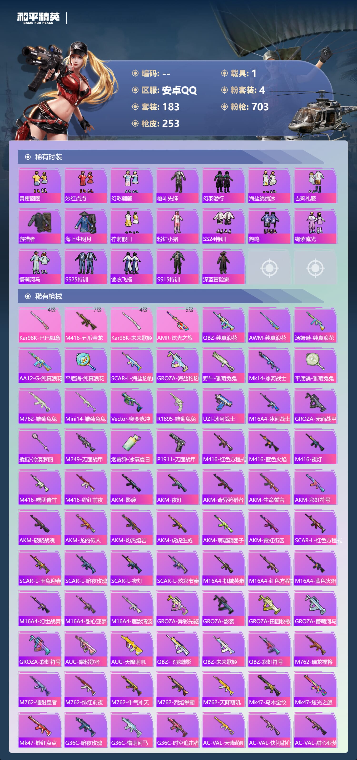 a4060/安卓QQ/-17王牌印记-4粉装-4特效枪-1载具-74717热力值-183套装-253枪皮-6卓越印记服务承诺: