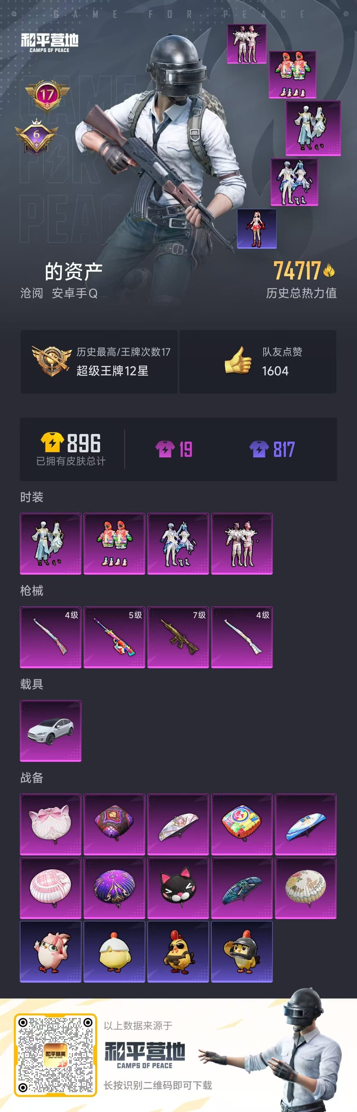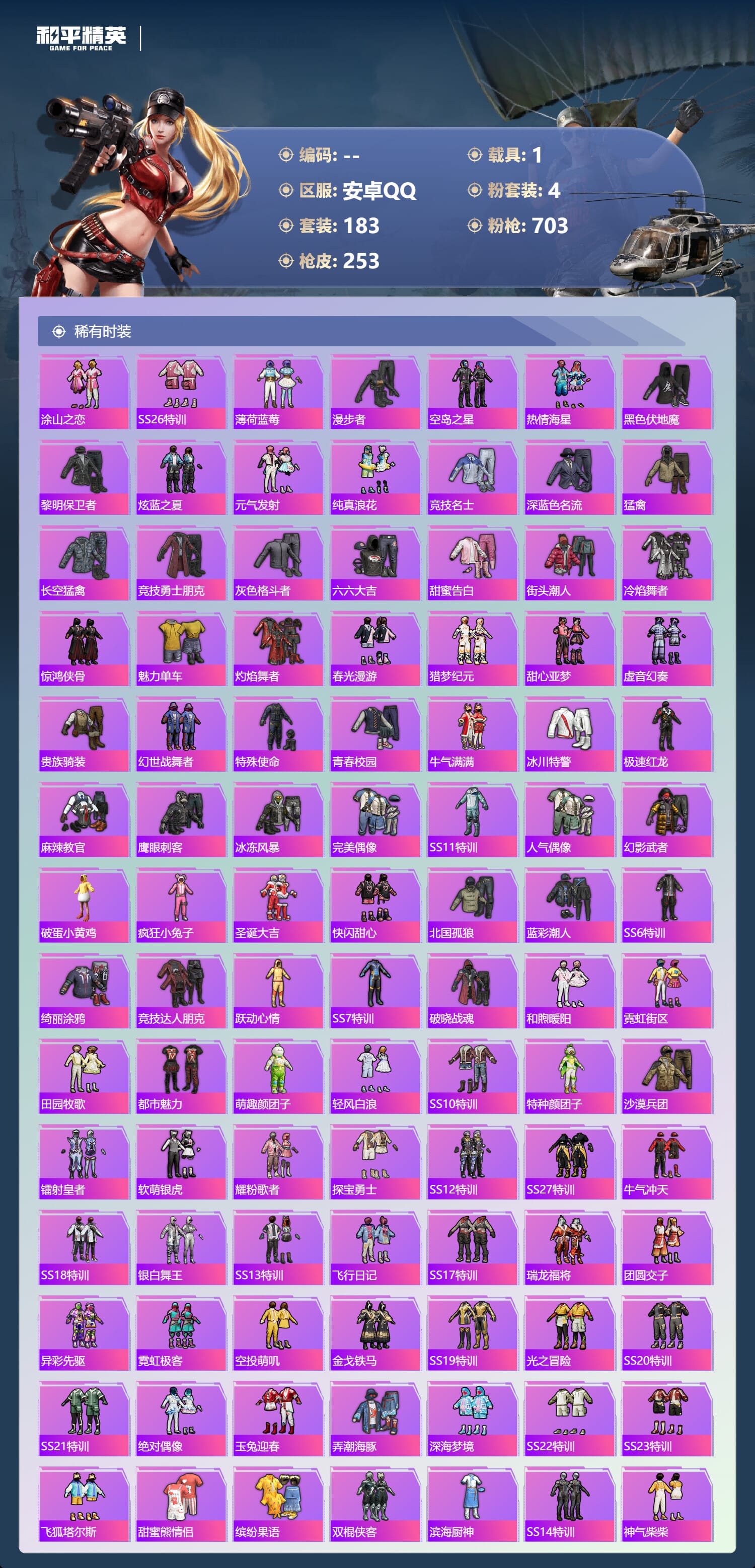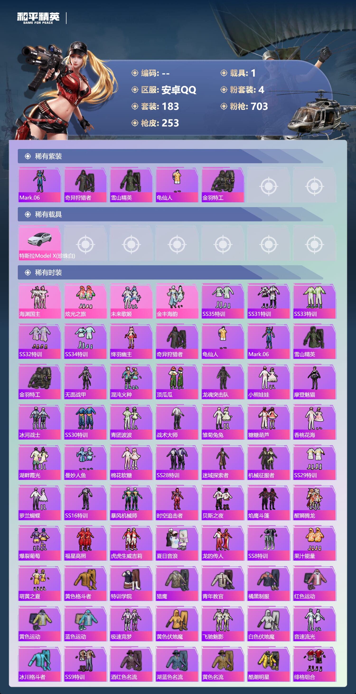 a4060/安卓QQ/-17王牌印记-4粉装-4特效枪-1载具-74717热力值-183套装-253枪皮-6卓越印记服务承诺:
