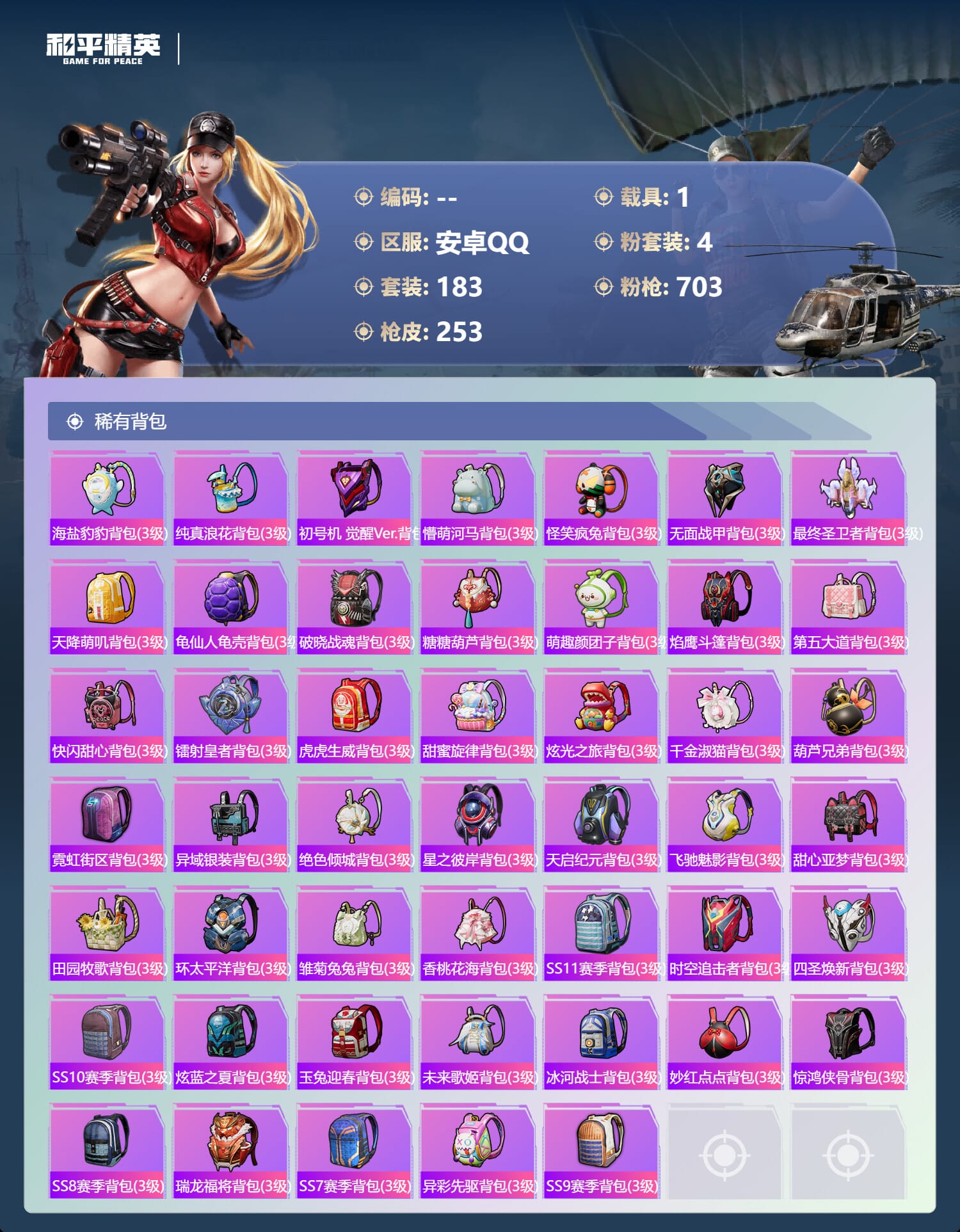【安卓QQ】130套装-150枪皮-1载具 DDD 【送安卓q王者 营地id 1776872759】16王牌印记-2粉装-1特效枪-150枪皮-130套装-1载具 【1载具】 玛莎拉蒂Quattroporte(夜幕蓝) 【2粉装】 初号机款机体服 齐天大圣 【1特效枪】 M416-风花雪月 【3飞行器】 红色滑翔尾迹 齐天大圣飞行器 空岛之星尾迹 【68热门】 M416-红色方程式 M416-夜灯 SCAR-L-红色方程式 M416-糯团青竹 SKS-糯团青竹 UZI-娇憨猪猪 UMP45-涂山之恋 UMP45-蓝色火焰 UMP45-炫光之旅 S12K-垂柳戏鸭 M249-彩虹符号 MG3-幻世战舞者 MG3-乌木金纹 AKM-霓虹街区 迪迦奥特曼 极速红龙 赛罗奥特曼 团圆交子 瑞龙福将 酷熊伴侣 M416-蓝色火焰 GROZA-异彩先驱 M762-瑞龙福将 GROZA-蓝莓炮弹 Mk47-洛神天依 Kar98K-王子的夏天 Mk14-绚金瑰梦 特训学院 猎鹰 橘黑制服 青年教官 红色运动 黄色运动 蓝色运动 黄色伏地魔 白色伏地魔 黑色伏地魔 长空猛禽 魅力单车 竞技达人朋克 甜蜜熊情侣 青涩时光 霓虹街区 牛气冲天 懵萌河马 浪漫天命 真嗣款战斗服 缤纷焰火 异彩先驱 霓虹极客 SCAR-L-玉兔迎春 GROZA-田园牧歌 和煦暖阳 M762-天降萌叽 Mk47-乌木金纹 AKM-虎虎生威 雪山精英(老6服) 紫螳螂 动感兔斯基 好奇恐龙 SS22特训 SS23特训 SS24特训 SS25特训 SS26特训 破蛋小黄鸡 海岛探路者 SS27特训