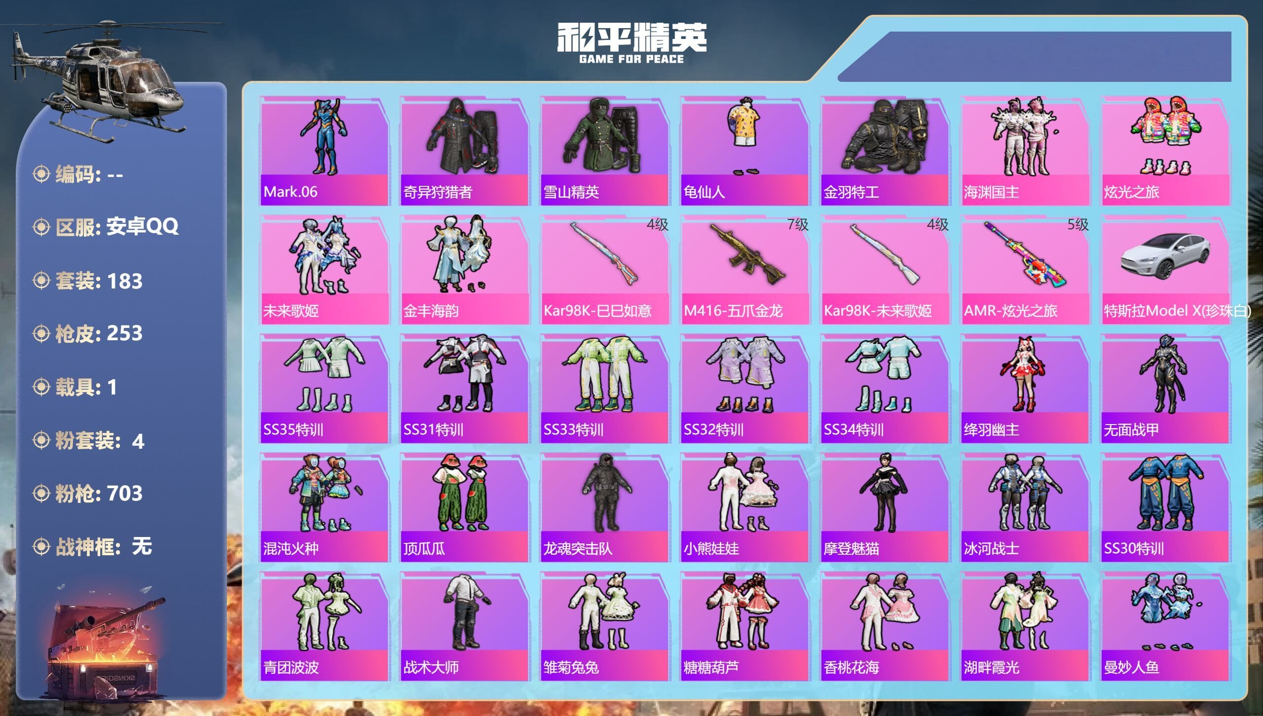 【安卓QQ】95套装-132枪皮 2王牌印记-1粉装-2特效枪-132枪皮-95套装-1载具 【1载具】 特斯拉Model X(珍珠白) 【1粉装】 零号机款机体服 【2特效枪】 Kar98K-巳巳如意 SCAR-L-锦绣绵绵 【3飞行器】 红色滑翔尾迹 紫色滑翔尾迹 黄色滑翔尾迹 【49热门】 M416-红色方程式 M416-乌木金纹 M416-夜灯 SCAR-L-红色方程式 UMP45-蓝色火焰 极速红龙 团圆交子 瑞龙福将 M416-蓝色火焰 M762-瑞龙福将 M762-乌木金纹 特训学院 黄色伏地魔 白色伏地魔 黑色伏地魔 骑行爱好者 长空猛禽 竞技勇士朋克 黄色格斗者 灰色格斗者 坚韧舞者 风暴特警 众神之王 甜心亚梦 虚音幻奏 懵萌河马 真理款战斗服 GROZA-乌木金纹 雪山精英(老6服) 战地名士 春日漫步 AUG-怪笑疯兔 黄螳螂 梦魇先生 AUG-怪笑疯兔 万圣娃娃 PEL摇滚竞梦者 活力之心 黑色刀锋 SS24特训 SS25特训 SS2特训 SS3特训 SS10特训 SS8特训 SS9特训 S5赛事 SS6特训 海岛探路者