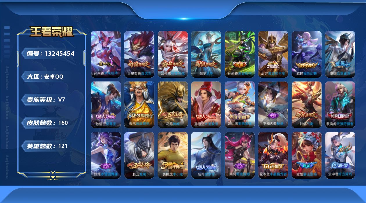 商品描述:[13245454]Xr43007-可修改-死钱包-安卓Q-V7-荣耀黄金I段位-121英雄-160皮肤-1星元-7传说-39史诗【传说皮肤】:公孙离祈雪灵祝,伽罗太华,貂蝉猫影幻舞,虞姬云霓雀翎,百里玄策白虎志,后羿黄金射手座,孙尚香末日机甲【限定皮肤】:狄仁杰阴阳师,廉颇寅虎御盾,赵云皇家上将,赵云龙胆,嬴政白昼王子,鲁班七号狮舞东方,庄周云端筑梦师,庄周玄嵩,芈月重明,芈月幻夜卜梦,吕布猎兽之王,夏侯惇朔风刀,典韦穷奇,典韦蓝屏警告,狄仁杰魔术师,狄仁杰万华元夜,达摩沙漠行僧,项羽海滩派对,老夫子醍醐杖,韩信飞衡,兰陵王金庭之子,孙悟空至尊宝,孙悟空大圣娶亲,牛魔御旌,后羿如梦令,李元芳银河之约,虞姬霸王别姬,钟馗神迹守卫,钟馗驱傩正仪,杨玉环遇见飞天,女娲朔望之晖,雅典娜单词大作战,蔡文姬繁星吟游,太乙真人饕餮,鬼谷子原初探秘者,苏烈千军破阵,百里玄策白虎志,弈星混沌棋,公孙离祈雪灵祝,沈梦溪星空之诺,沈梦溪大漠名商,明世隐疑决卦,裴擒虎天狼狩猎者,裴擒虎李小龙,裴擒虎擒涛扼浪,狂铁御狮,米莱狄御霄,云中君纤云弄巧,伽罗太华,盾山御銮,上官婉儿梁祝,蒙犽狂想玩偶喵,桑启海盐诗旅,鬼谷子天穹祈灯,姬小满妄想食味【年限皮肤】:百里玄策白虎志,廉颇寅虎御盾,公孙离祈雪灵祝,伽罗太华,韩信飞衡,庄周玄嵩,马超神威,赵云龙胆【赛季限定】:芈月重明,夏侯惇朔风刀,典韦穷奇,狄仁杰万华元夜,达摩沙漠行僧,老夫子醍醐杖,兰陵王金庭之子,牛魔御旌,钟馗驱傩正仪,太乙真人饕餮,鬼谷子原初探秘者,苏烈千军破阵,弈星混沌棋,沈梦溪大漠名商,明世隐疑决卦,裴擒虎擒涛扼浪,狂铁御狮,米莱狄御霄,盾山御銮,桑启海盐诗旅,鬼谷子天穹祈灯【战令限定】:嬴政白昼王子,鲁班七号狮舞东方,芈月幻夜卜梦,吕布猎兽之王,典韦蓝屏警告,李元芳银河之约,钟馗神迹守卫,女娲朔望之晖,雅典娜单词大作战,沈梦溪星空之诺,蒙犽狂想玩偶喵【史诗皮肤】:阿轲暗夜猫娘,赵云皇家上将,赵云未来纪元,貂蝉圣诞恋歌,甄姬冰雪圆舞曲,狄仁杰魔术师,孙尚香水果甜心,妲己魅力维加斯,刘禅绅士熊喵,虞姬霸王别姬,孙悟空至尊宝,花木兰水晶猎龙者,刘邦德古拉伯爵,诸葛亮黄金分割率,庄周云端筑梦师,李元芳逐浪之夏,白起星夜王子,杨玉环遇见飞天,嬴政白昼王子,孙策猫狗日记,孙悟空大圣娶亲,典韦蓝屏警告,裴擒虎天狼狩猎者,鲁班七号狮舞东方,狄仁杰鹰