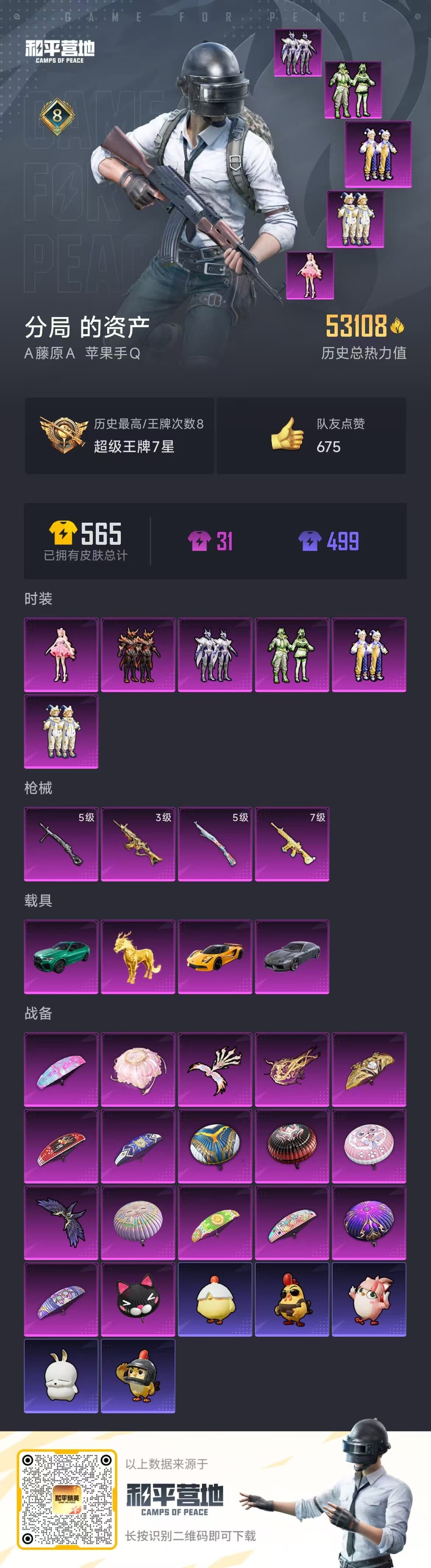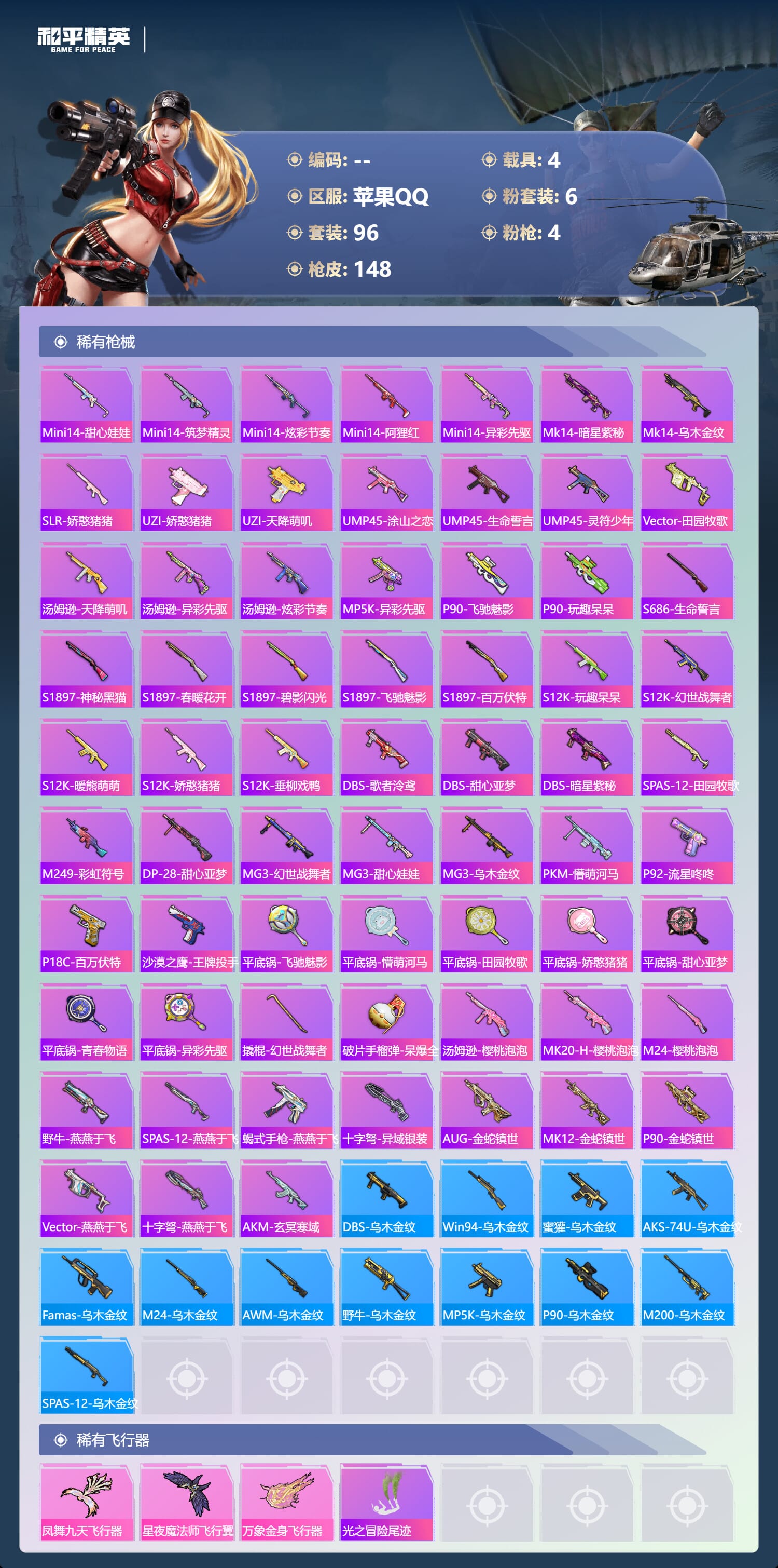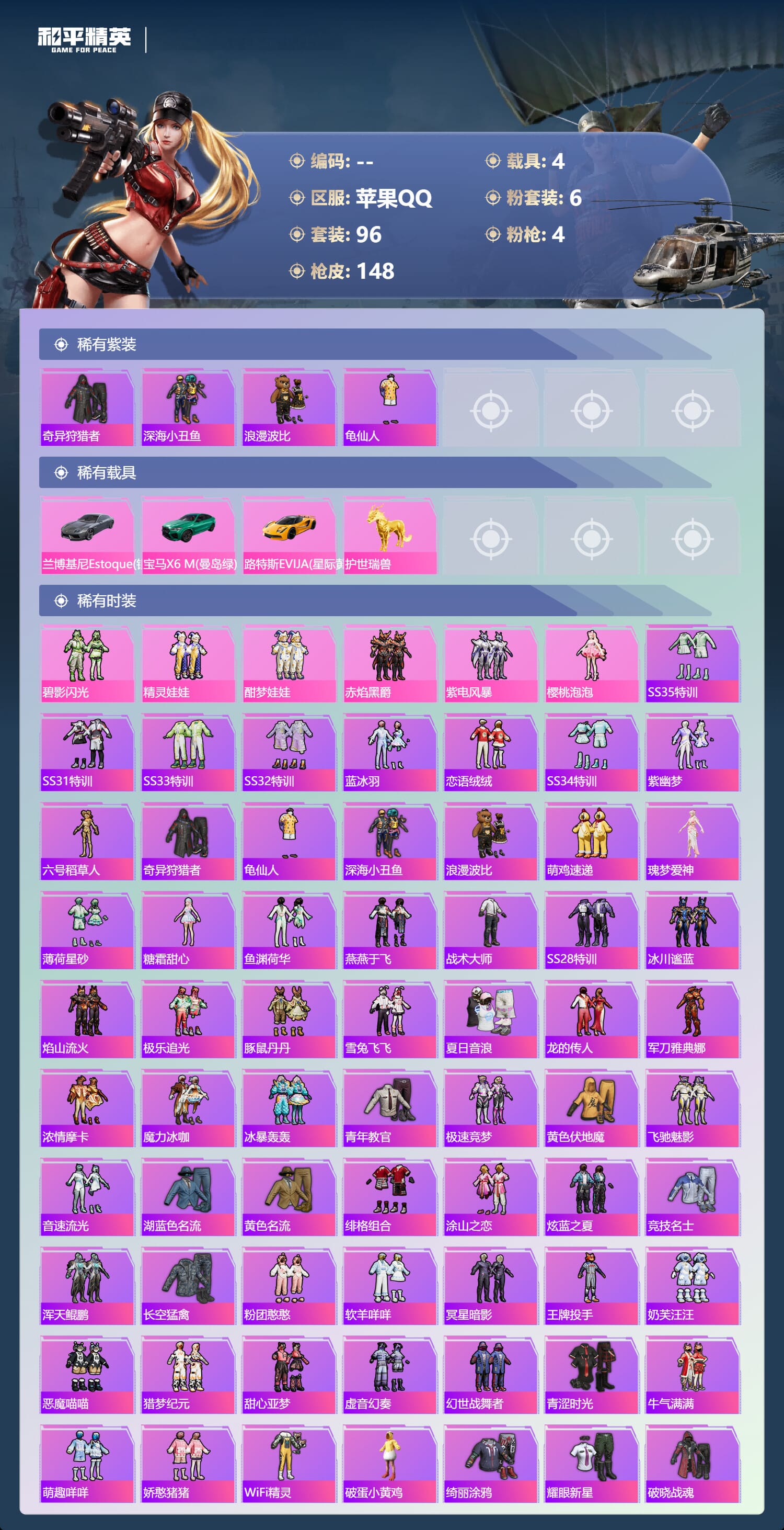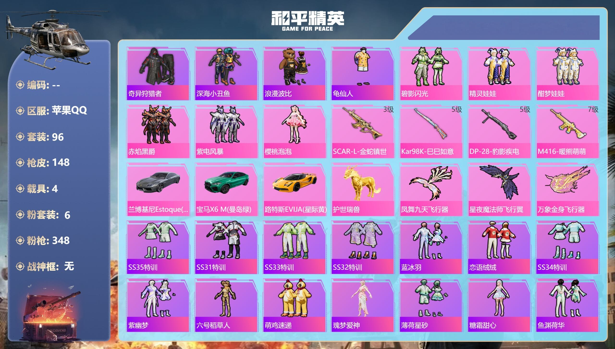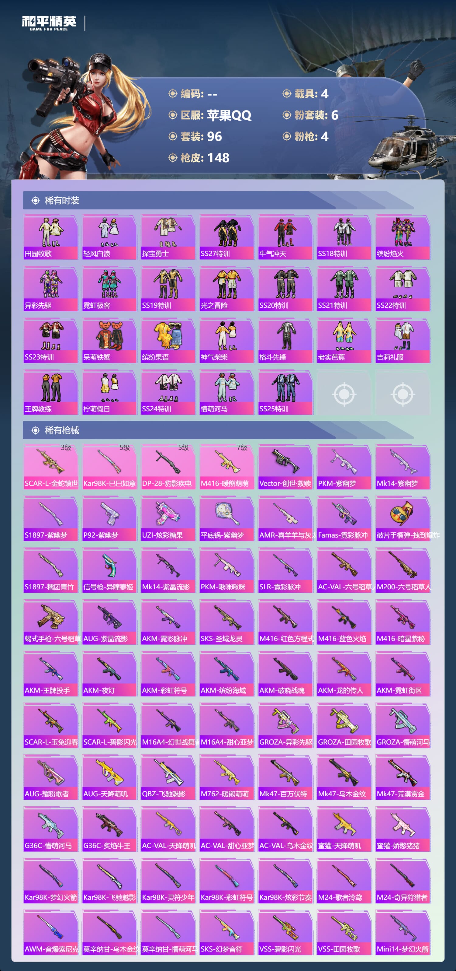a4078/苹果QQ/-8王牌印记-6粉装-4特效枪-4载具-53108热力值-96套装-148枪皮服务承诺: