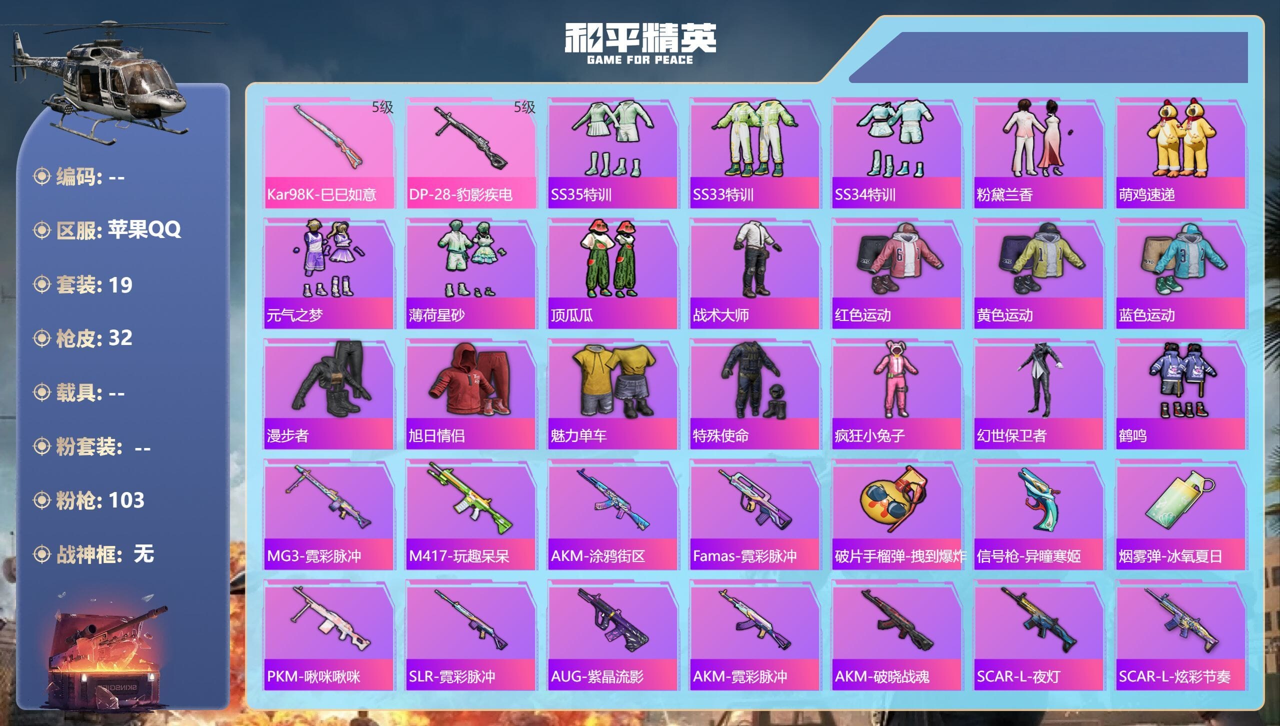 【安卓QQ】95套装-132枪皮 2王牌印记-1粉装-2特效枪-132枪皮-95套装-1载具 【1载具】 特斯拉Model X(珍珠白) 【1粉装】 零号机款机体服 【2特效枪】 Kar98K-巳巳如意 SCAR-L-锦绣绵绵 【3飞行器】 红色滑翔尾迹 紫色滑翔尾迹 黄色滑翔尾迹 【49热门】 M416-红色方程式 M416-乌木金纹 M416-夜灯 SCAR-L-红色方程式 UMP45-蓝色火焰 极速红龙 团圆交子 瑞龙福将 M416-蓝色火焰 M762-瑞龙福将 M762-乌木金纹 特训学院 黄色伏地魔 白色伏地魔 黑色伏地魔 骑行爱好者 长空猛禽 竞技勇士朋克 黄色格斗者 灰色格斗者 坚韧舞者 风暴特警 众神之王 甜心亚梦 虚音幻奏 懵萌河马 真理款战斗服 GROZA-乌木金纹 雪山精英(老6服) 战地名士 春日漫步 AUG-怪笑疯兔 黄螳螂 梦魇先生 AUG-怪笑疯兔 万圣娃娃 PEL摇滚竞梦者 活力之心 黑色刀锋 SS24特训 SS25特训 SS2特训 SS3特训 SS10特训 SS8特训 SS9特训 S5赛事 SS6特训 海岛探路者