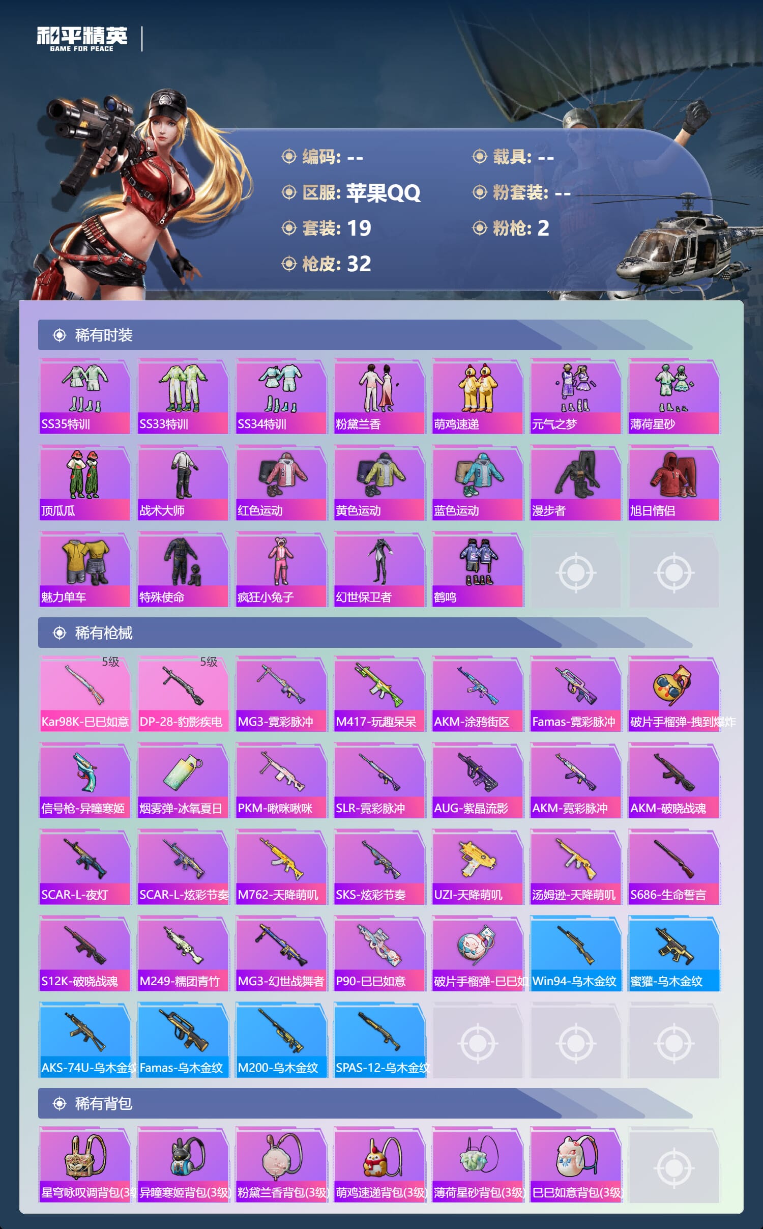 【安卓QQ】73套装-51枪皮-1载具 绝对安全 亏本甩卖 奇异狩猎者全套 玛莎拉蒂 五爪金龙 幻影战神 水曜玄武 木曜青龙 浪漫波比 至尊龙雀飞行服 AKM奇异狩猎者 云丝凤蟒 太极红客 幻影公爵 好奇恐龙 至尊龙雀降落伞 木耀青龙 水耀玄武 幻影战神 奇异狩猎者 浪漫波比 玛莎拉蒂蓝色 M416-五爪金龙【安卓QQ】110套装-88枪皮-0载具 绝对安全 亏本甩卖 奇异狩猎者 宝贝奶油派 午夜朋克 梦魇先生 万圣娃娃 AKM-奇异狩猎者 幻世猎手 金环蜂王 冷血极客 森林猎手 甜蜜菠萝 蔷薇魔法师 奇趣企鹅 宝贝奶油派