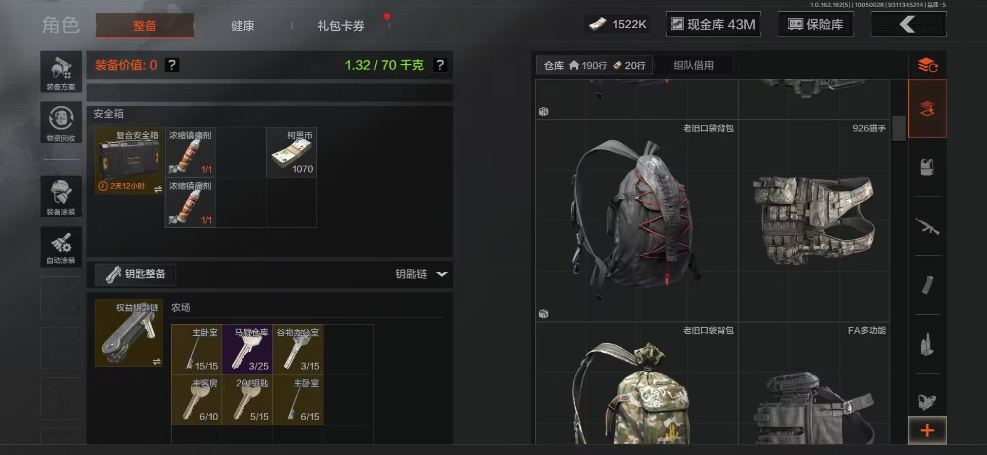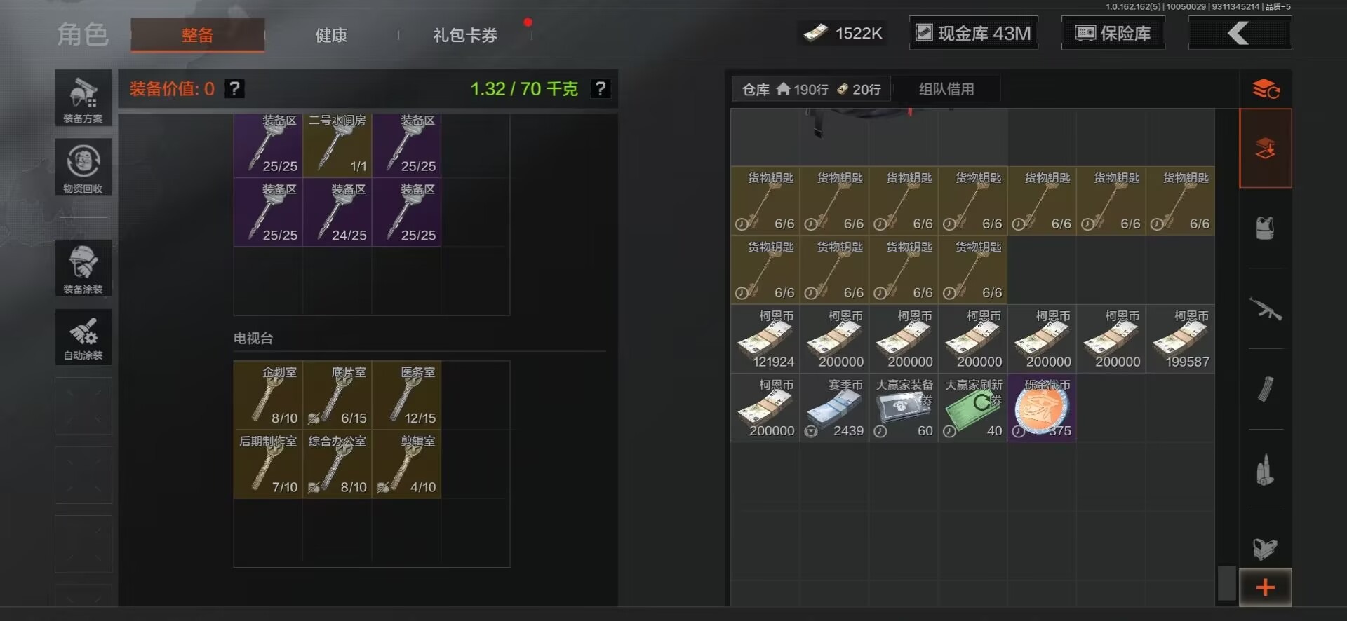 商品描述:[13319771]库存价值124.4 1近战武器 6金枪皮 可修改实名 【柯恩币数量】:1522 【近战武器】:工兵铲 【金色枪皮】:骑士之剑·VSS,旗帜·AEK,告丧夜曲·AR57,浮鳞影青·QBZ192,伦琴幻影·FAL,旧王圣谕·QBZ191 【紫色枪皮】:钢铁真理·F2000,德尔塔小队·H416,旗帜·SVDS,旗帜·RPK16,火力倾泻·AKM,火力倾泻·RPD,脊峰速降·MPX,最后防线·AEK,掌中盾·MP5,骑士之剑·SJ16,骑士之剑·AKS74U,伦琴计量·USAS12,伦琴计量·SKS,典礼武备·14,鱼跃丹青·QBU191,骤羽尖啸·M4A1,鱼跃丹青·DT MDR,骤羽尖啸·AK12,猩红羽翼·VSS,鱼跃丹青·MCX,鱼跃丹青·AK102,鱼跃丹青·M110,神锋·Vector45 【角色装扮(紫)】:金狮护身·转运套装,鎏金街头套装,都市夜影套装,王国卫队礼装