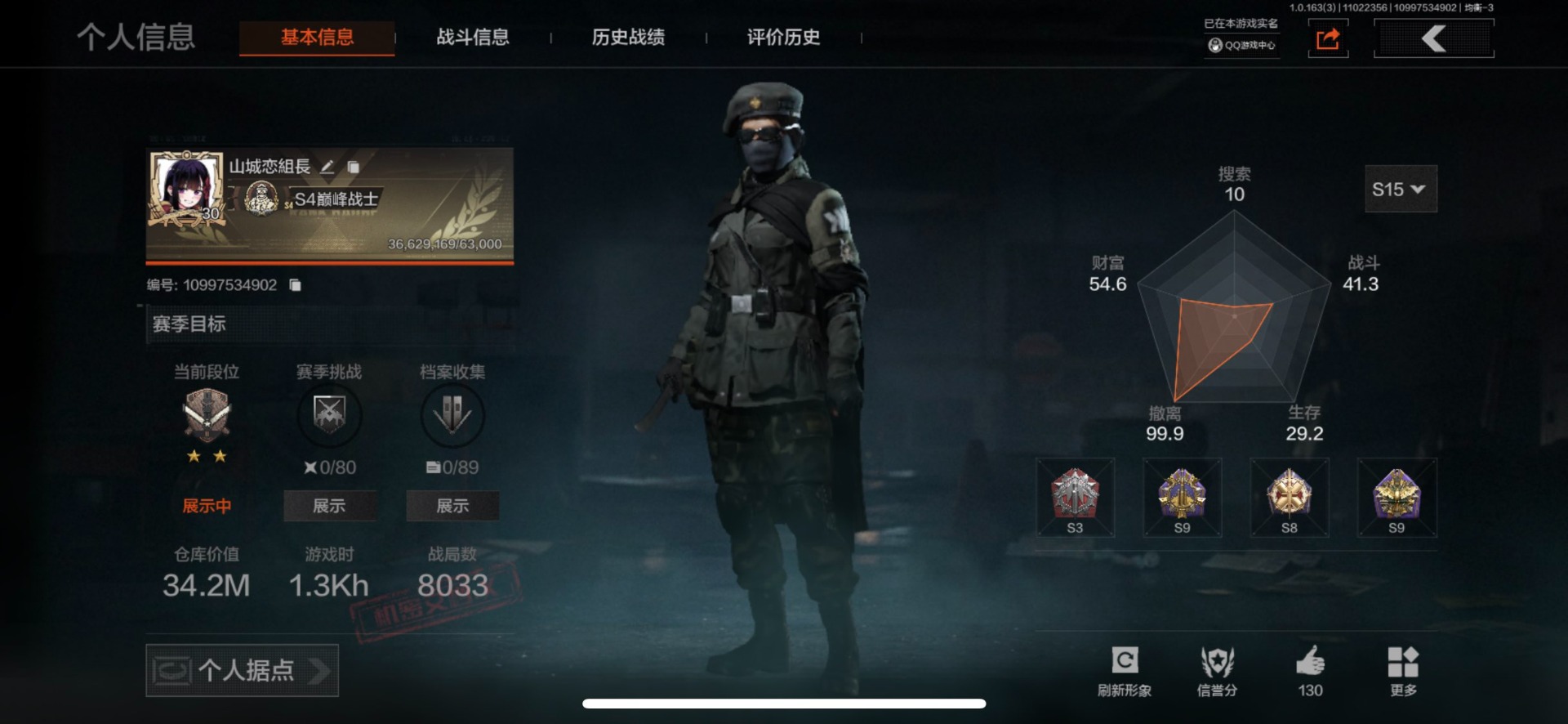 商品描述:[13354323]库存价值34.2 6近战武器 1金套装 9金枪皮 可修改实名 【柯恩币数量】:14325 【角色装扮(金)】:钢铁壁垒作战服 【近战武器】:突击匕首,工兵铲,来战·开山刀,明刀·绣春,急袭弯刀,野战折刀 【金色枪皮】:利齿风暴·MPX,告丧夜曲·AR57,浮鳞影青·QBZ192,伦琴幻影·AX50,旧王圣谕·QBZ191,诸星之子·FAL,林中人·FAL,堕落者·H416,冬夜·AK12 【紫色枪皮】:粉绒臻选·AN94,典礼武备·GROZA,粉绒臻选·AR30,典礼武备·14,鱼跃丹青·QBU191,利齿风暴·T03,鱼跃丹青·MCX,来战·AK74N,全地形数码·M110,和平之手·FAL,白貂·F57,白色丧钟·莫辛,玄戈梨花·VSS,秩序·G18C,娜迦·RPK16,敬伙伴·M16,雪原凌锋·SVDS