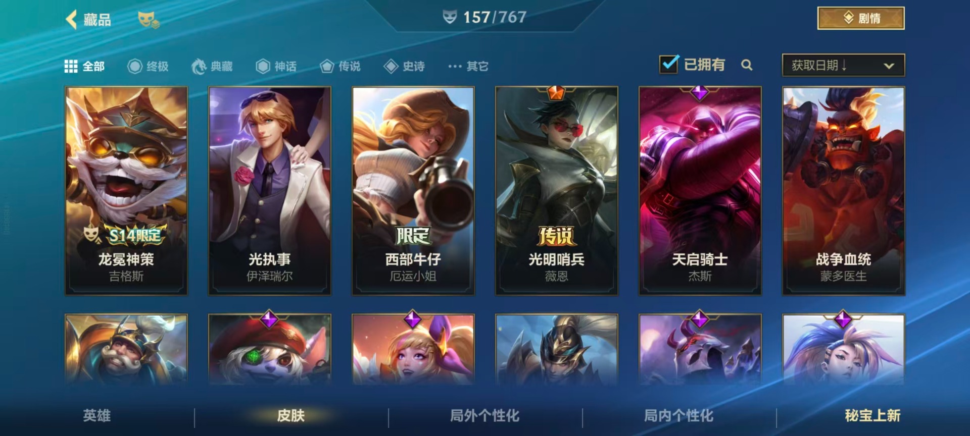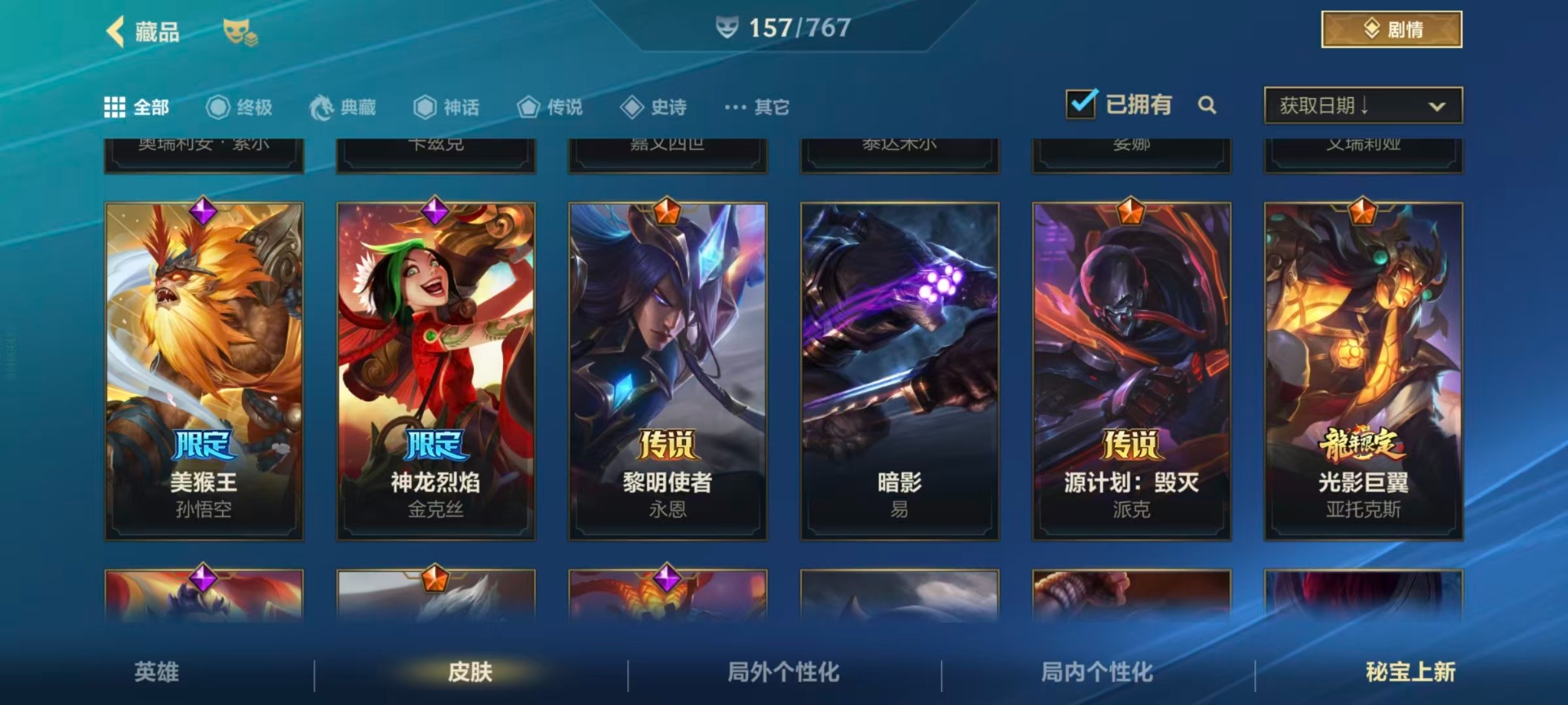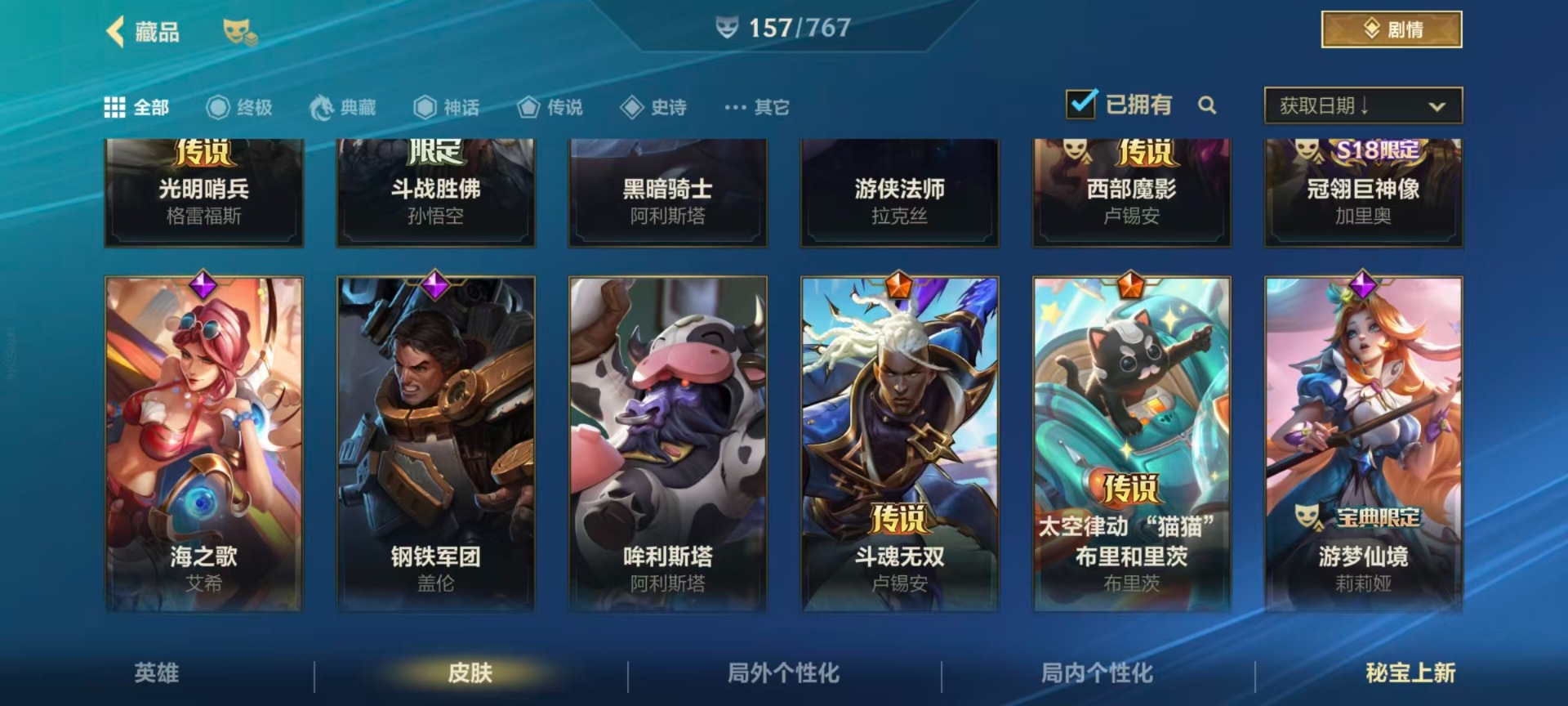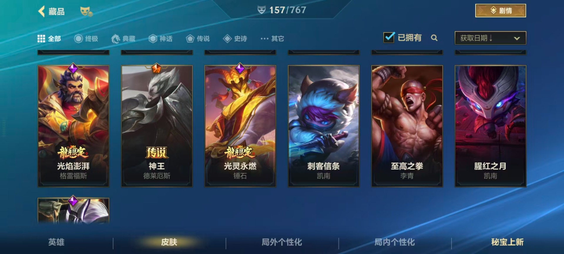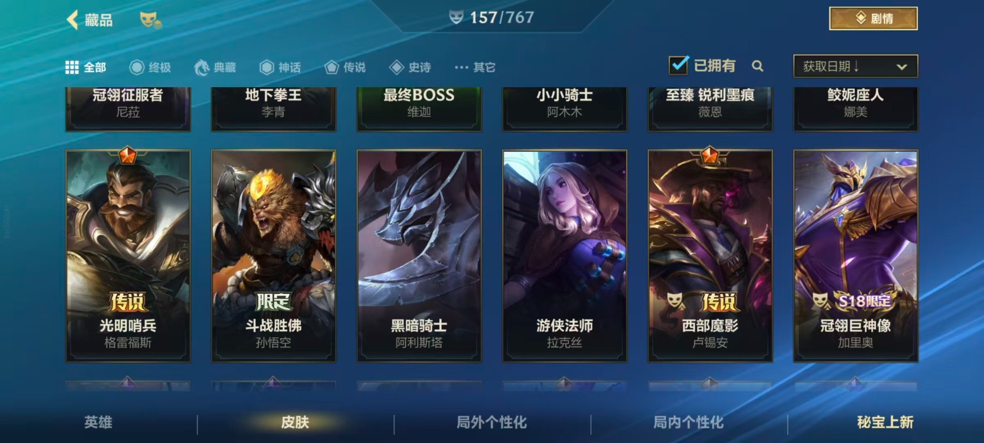 【LSC101】130英雄/706皮肤/傲世宗师/超武乾坤:虹影 劫/超武乾坤:孤拳 瑟提/超武乾坤:裁决 德莱厄斯/超武乾坤:征服 莎弥拉/冠星耀辰 盖伦/臻藏 光影巨翼 亚托克斯/定海神珍:御定乾坤 孙悟空/摄魂使者 薇恩/至臻 斗魂无双 赵信/光谱幻影 金克丝/至臻 喵喵魅影 金克丝/夜星流火 金克丝/星域游侠 圣时豪杰 崔斯特/春晖仙子 苍云缥缈 卡莎/灰烬征服者 潘森/KBG 任凭浪起 破浪 菲奥娜/海克斯科技 安妮/臻藏 御风墨影 亚索/渔帆满载 亚索/星之守护者 永绽盛芒 阿狸/臻藏 西部魔影 卢锡安/至臻 水晶玫瑰 格温/海克斯科技 嘉文四世/银鞍玉甲 嘉文四世/黎明使者 破