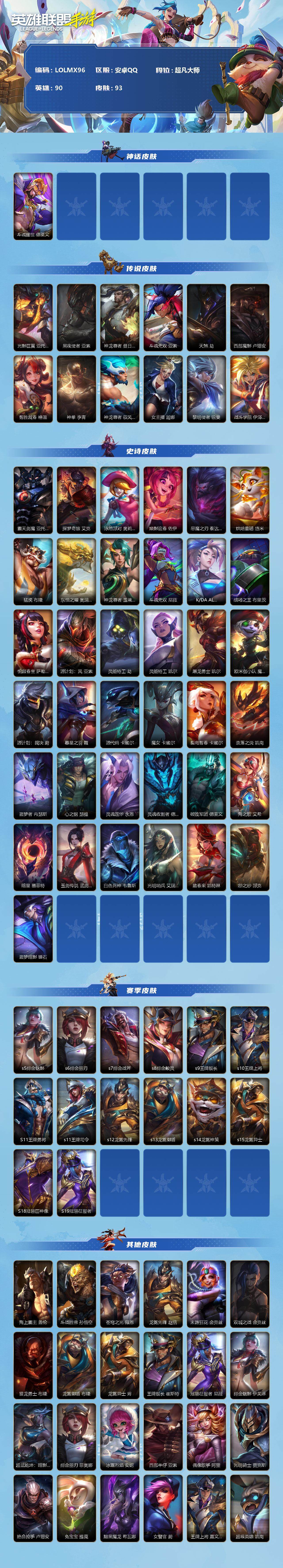 商品描述:【LOLMX96】90英雄/93皮肤/超凡大师/斗魂耀世 德莱文/光影巨翼 亚托克斯/黑夜使者 亚索/神龙尊者 昼日真龙 亚索/斗魂无双 亚索/天煞 劫/西部魔影 卢锡安/剪胜裁春 格温/神拳 李青/神龙尊者 驭风啸龙 易/女主播 迦娜/黎明使者 锐雯/战斗学院 伊泽瑞尔/霸天剑魔 亚托克斯/探梦奇旅 艾克/泳池派对 奥莉安娜/焕影迎春 佐伊/恶魔之刃 泰达米尔/烘焙童谣 悠米/猛虎 布隆/东恒之曜 奥瑞利安·索尔/神龙尊者 玉境灵龙 卡莎/斗魂无双 尼菈/K/DA ALL OUT 阿卡丽/战场之王 布里茨/悦鼓春生 萨勒芬妮/源计划:风 亚索/灵能特工 劫/灵能特工 凯尔/屠龙勇士 凯尔/