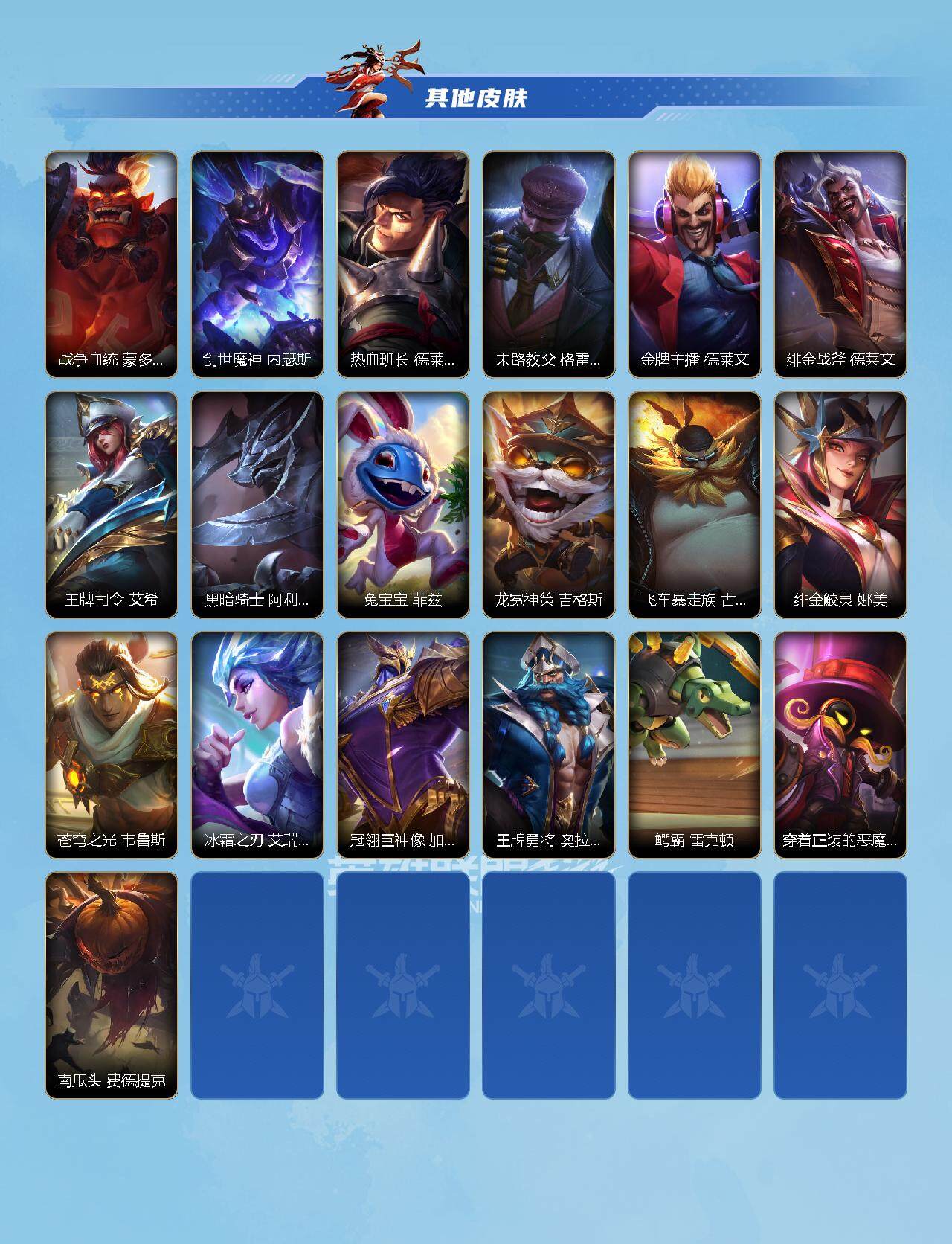 【LSC101】130英雄/706皮肤/傲世宗师/超武乾坤:虹影 劫/超武乾坤:孤拳 瑟提/超武乾坤:裁决 德莱厄斯/超武乾坤:征服 莎弥拉/冠星耀辰 盖伦/臻藏 光影巨翼 亚托克斯/定海神珍:御定乾坤 孙悟空/摄魂使者 薇恩/至臻 斗魂无双 赵信/光谱幻影 金克丝/至臻 喵喵魅影 金克丝/夜星流火 金克丝/星域游侠 圣时豪杰 崔斯特/春晖仙子 苍云缥缈 卡莎/灰烬征服者 潘森/KBG 任凭浪起 破浪 菲奥娜/海克斯科技 安妮/臻藏 御风墨影 亚索/渔帆满载 亚索/星之守护者 永绽盛芒 阿狸/臻藏 西部魔影 卢锡安/至臻 水晶玫瑰 格温/海克斯科技 嘉文四世/银鞍玉甲 嘉文四世/黎明使者 破