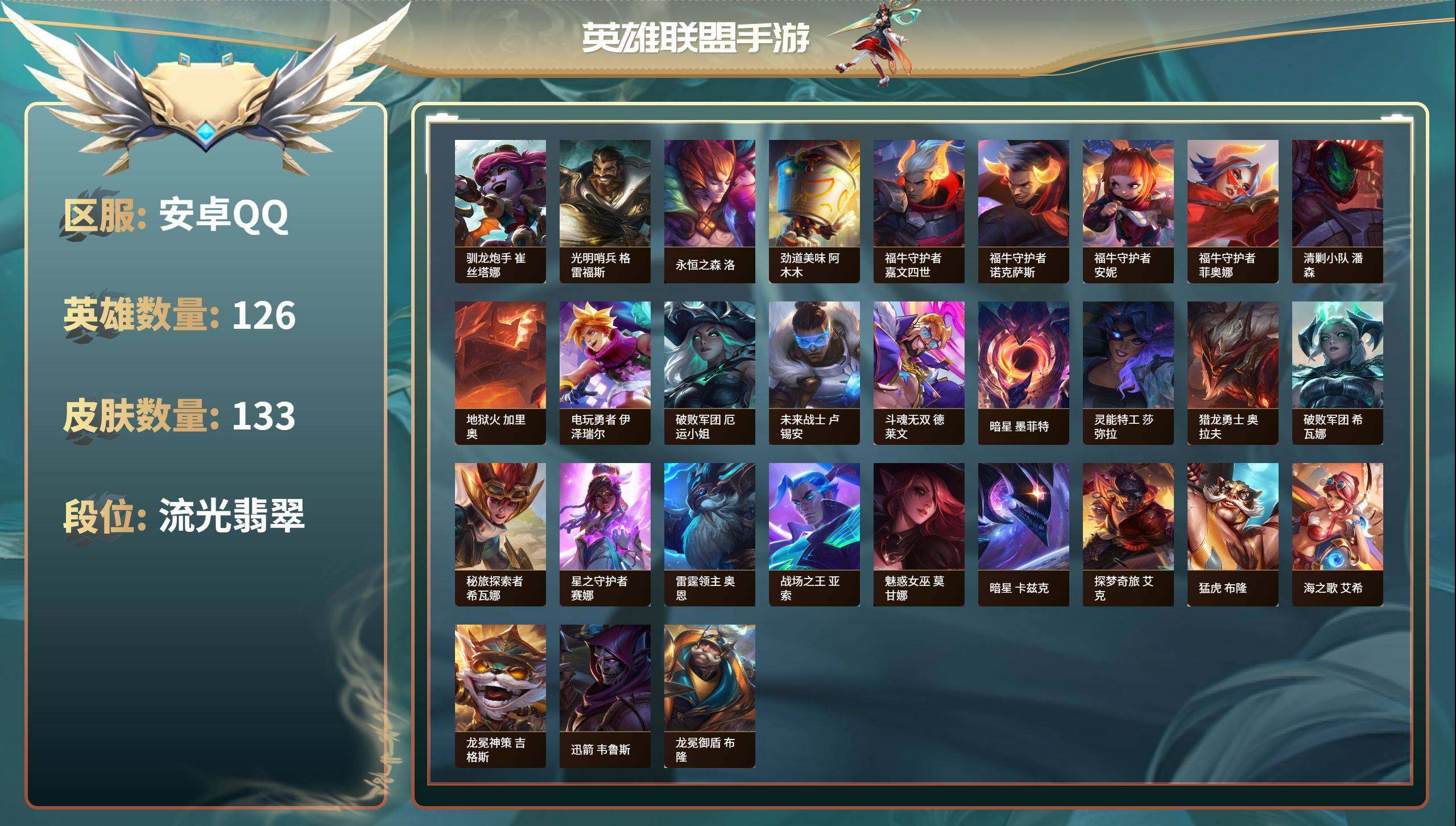 MLL1428【130英雄 143皮肤 2神话 26传说】安卓Q-等级220-段位:铂金-130英雄-143皮肤 灌篮高手 黑夜使者亚索 黎明使者锐雯 炼狱魔犬 律政大亨 欧米伽小队 幽灵特工 神拳盲僧 神王德莱厄斯 天煞劫 西部魔影卢锡安 星域游侠卡牌 星之守护者阿狸 魔女伊芙琳 剪胜裁春格温 黎明使者永恩 源计划:林 源计划:泯灭 最终BOSS维迦 跳跳倩影女枪 未来战士女警 灵魂莲华腕豪 星之守护者 落 腥红之月皎月 星之守护者萨勒芬妮 星之守护者发条 清剿小队金克丝 末路管家 破败军团德莱文 清剿小队潘森 战斗教授男枪 古神狼人 怨之砂 魅惑女巫莫甘娜 银河魔装机神龙女 泳池派对璐璐 泳池派对鳄鱼 泳池派对男枪 源计划:火 源计划:暗影 玉剑传说 武剑仙 玉剑传说 舞剑仙 星之守护者EZ 斗魂无双德莱文 黑夜使者吸血鬼 霸天战车螃蟹 霸天剑魔亚托克斯 水晶玫瑰格温 小蜜蜂提莫 源计划:燃 光明哨兵刀妹 灰烬领主 K/DA ALL OUT卡莎 猎龙勇士潘森 猎龙勇士奥拉夫 灵魂烈焰 灵魂收割者 灵能特工天使 霸天巨兽石头人 持胡萝卜的雪人 西部魔影诺手 太空律动“百万调音” 天启骑士 铁血女忍 未来战士锤石 s1光耀之刃 s4光耀之心 s5绯金魅影 s6绯金丽刃 s7绯金战斧 s8绯金鮫灵 s9王牌舰长