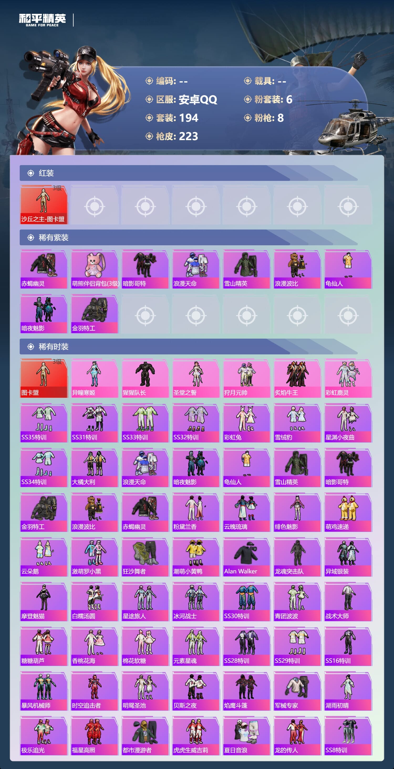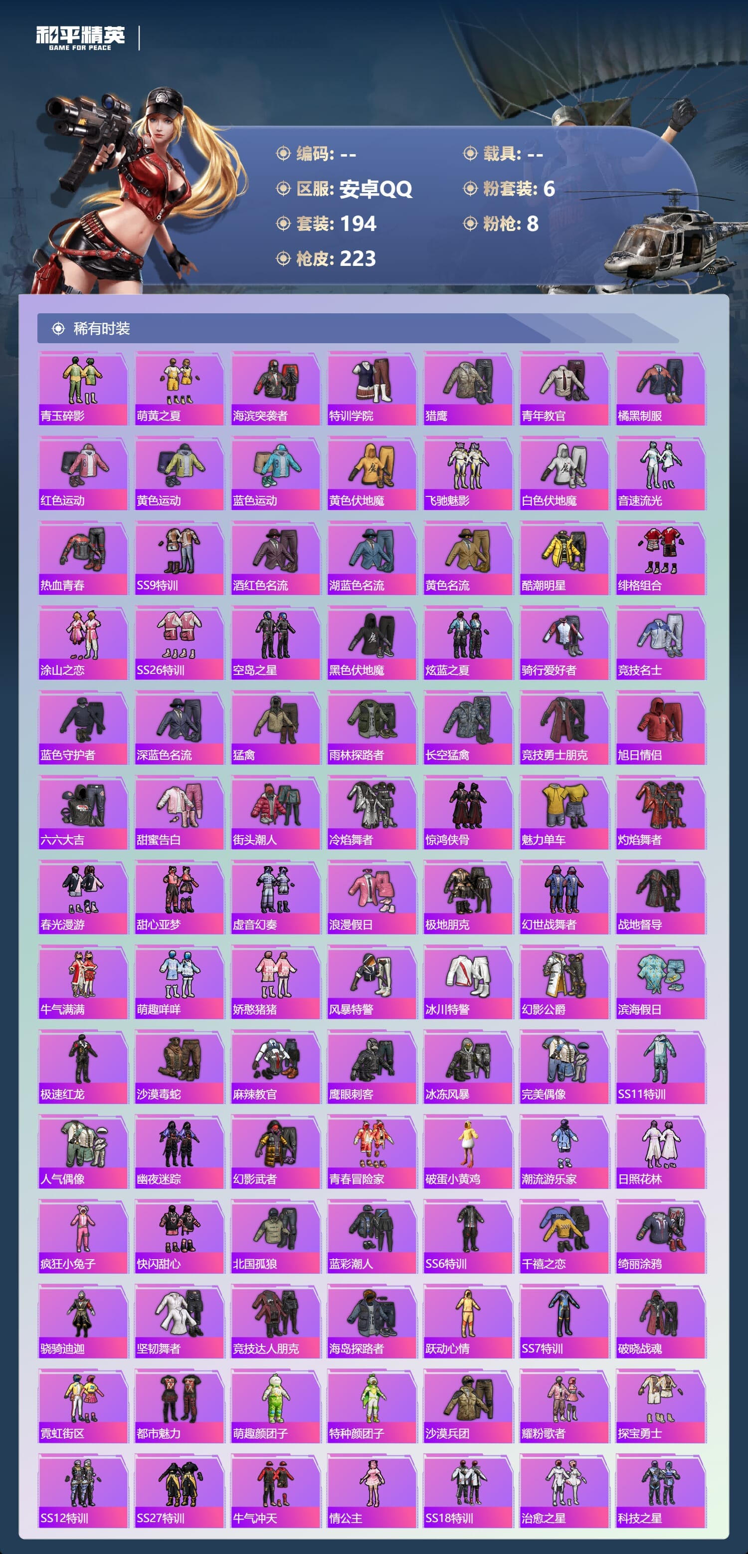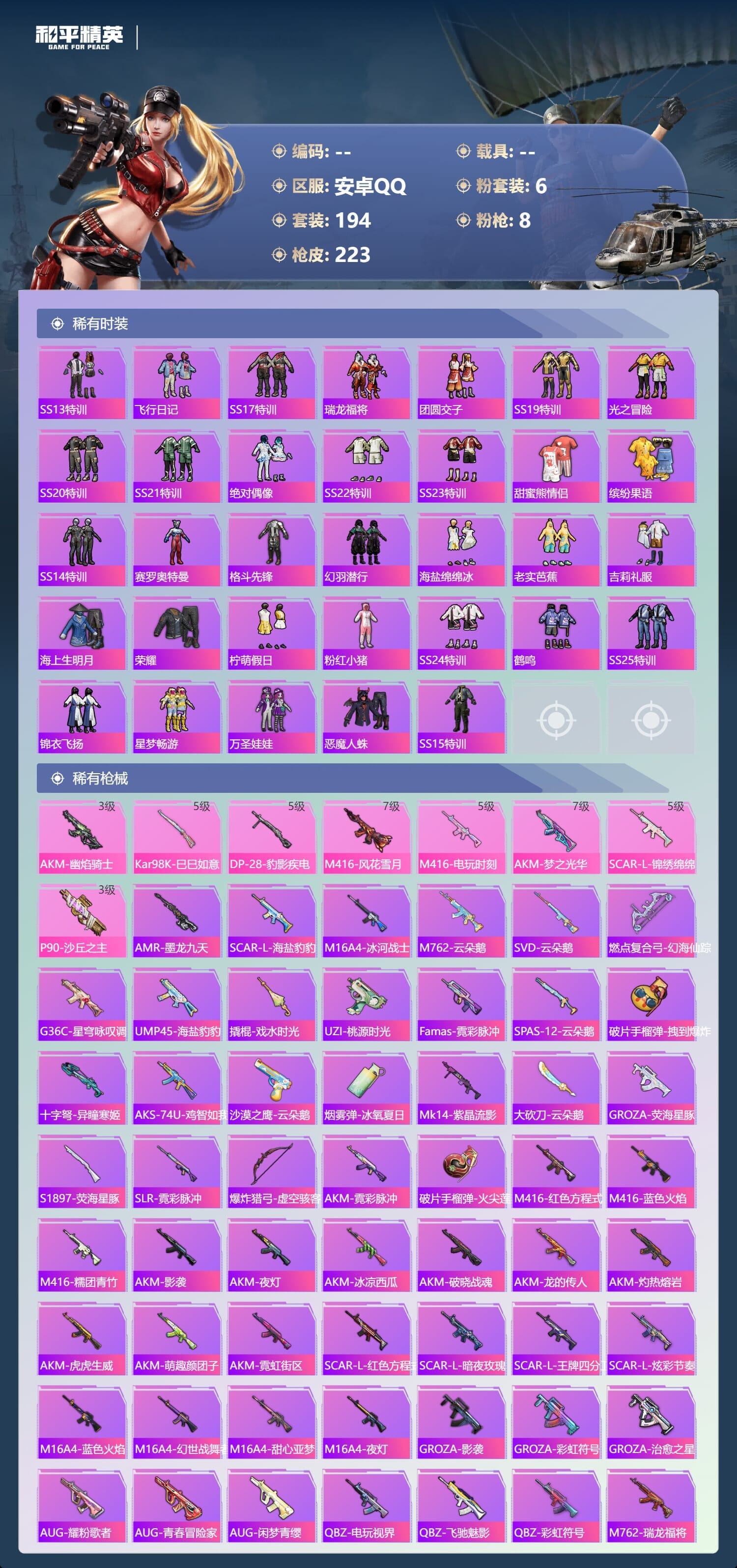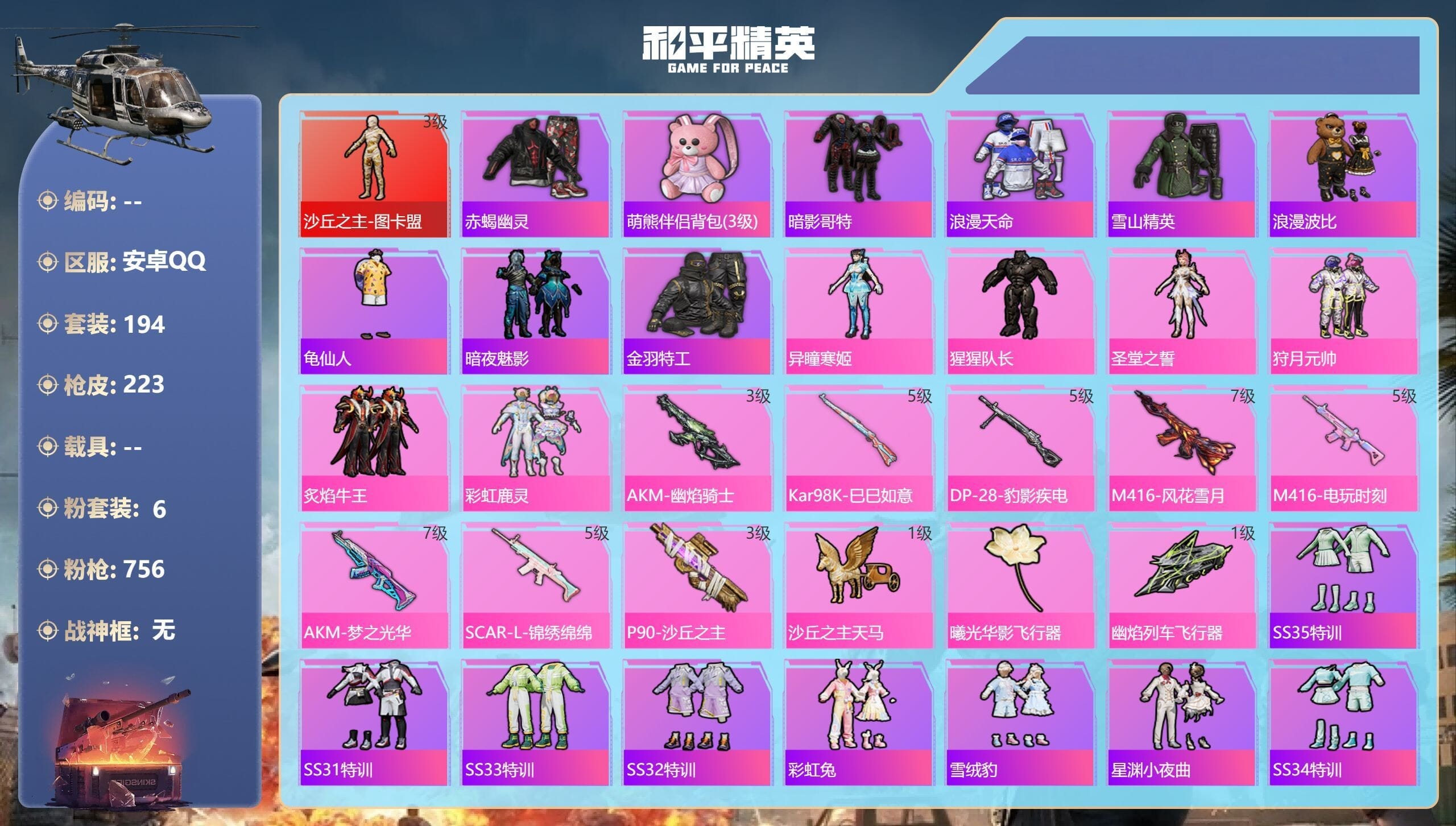 【安卓QQ】130套装-150枪皮-1载具 DDD 【送安卓q王者 营地id 1776872759】16王牌印记-2粉装-1特效枪-150枪皮-130套装-1载具 【1载具】 玛莎拉蒂Quattroporte(夜幕蓝) 【2粉装】 初号机款机体服 齐天大圣 【1特效枪】 M416-风花雪月 【3飞行器】 红色滑翔尾迹 齐天大圣飞行器 空岛之星尾迹 【68热门】 M416-红色方程式 M416-夜灯 SCAR-L-红色方程式 M416-糯团青竹 SKS-糯团青竹 UZI-娇憨猪猪 UMP45-涂山之恋 UMP45-蓝色火焰 UMP45-炫光之旅 S12K-垂柳戏鸭 M249-彩虹符号 MG3-幻世战舞者 MG3-乌木金纹 AKM-霓虹街区 迪迦奥特曼 极速红龙 赛罗奥特曼 团圆交子 瑞龙福将 酷熊伴侣 M416-蓝色火焰 GROZA-异彩先驱 M762-瑞龙福将 GROZA-蓝莓炮弹 Mk47-洛神天依 Kar98K-王子的夏天 Mk14-绚金瑰梦 特训学院 猎鹰 橘黑制服 青年教官 红色运动 黄色运动 蓝色运动 黄色伏地魔 白色伏地魔 黑色伏地魔 长空猛禽 魅力单车 竞技达人朋克 甜蜜熊情侣 青涩时光 霓虹街区 牛气冲天 懵萌河马 浪漫天命 真嗣款战斗服 缤纷焰火 异彩先驱 霓虹极客 SCAR-L-玉兔迎春 GROZA-田园牧歌 和煦暖阳 M762-天降萌叽 Mk47-乌木金纹 AKM-虎虎生威 雪山精英(老6服) 紫螳螂 动感兔斯基 好奇恐龙 SS22特训 SS23特训 SS24特训 SS25特训 SS26特训 破蛋小黄鸡 海岛探路者 SS27特训