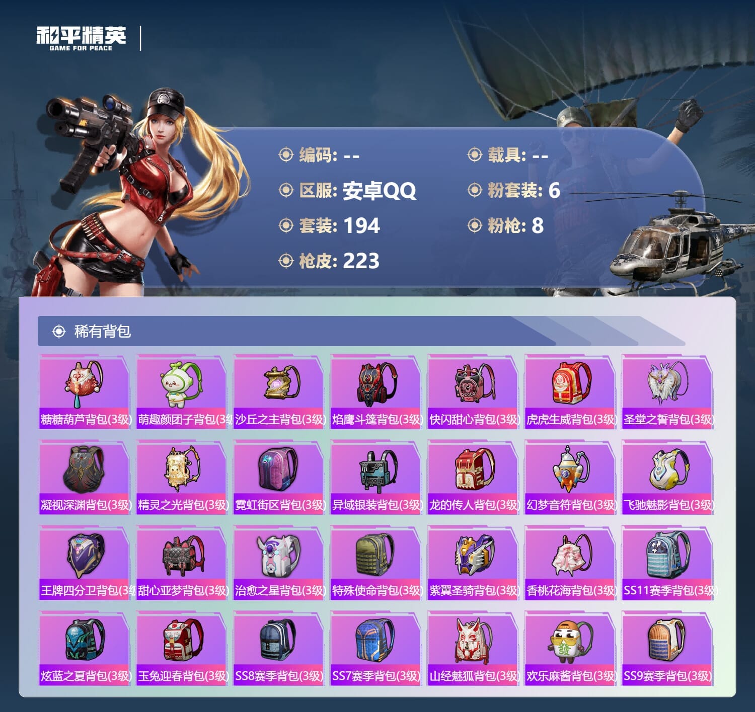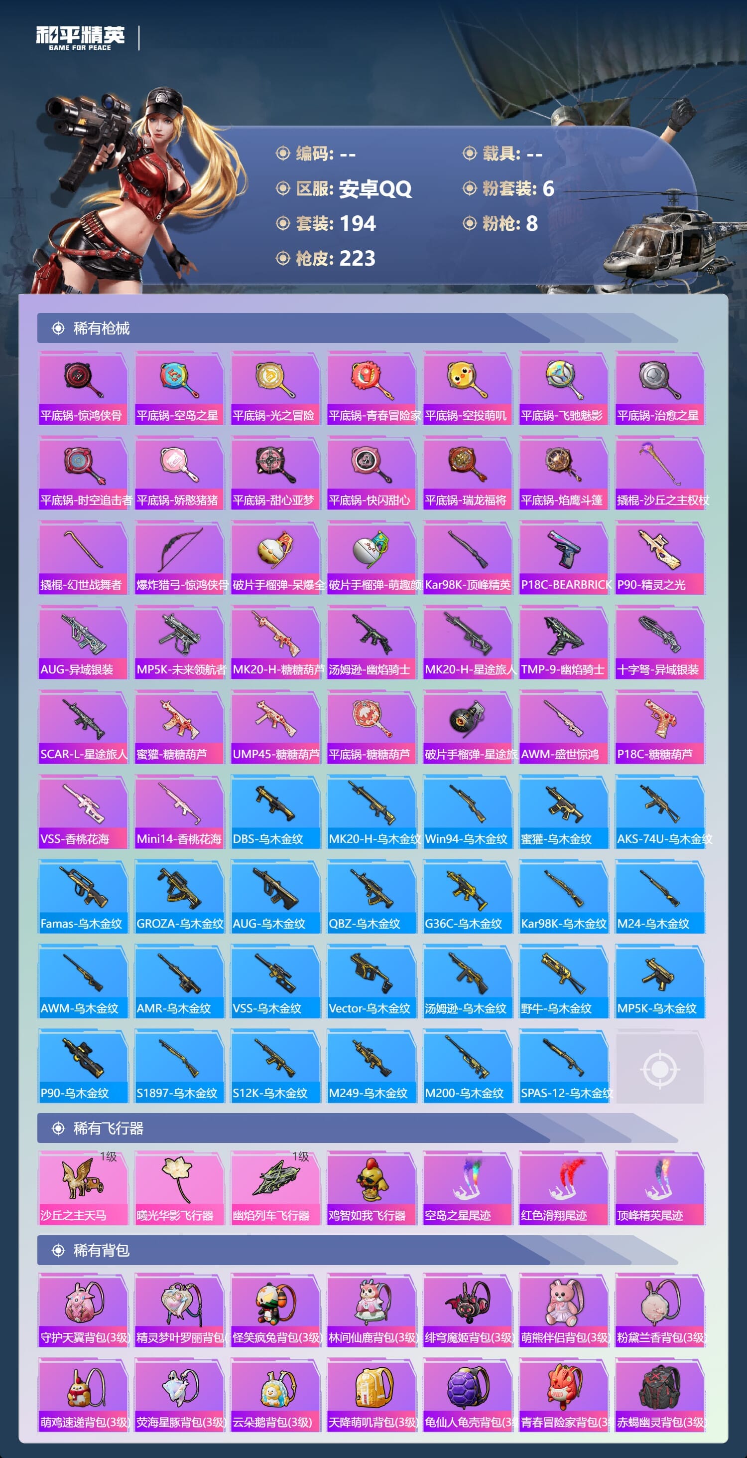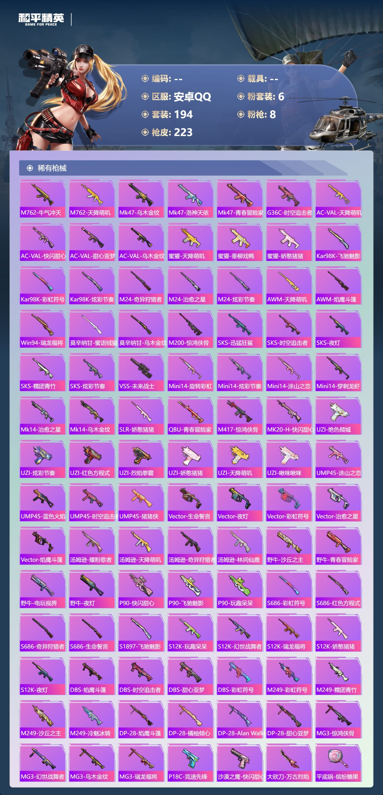 【安卓QQ】73套装-51枪皮-1载具 绝对安全 亏本甩卖 奇异狩猎者全套 玛莎拉蒂 五爪金龙 幻影战神 水曜玄武 木曜青龙 浪漫波比 至尊龙雀飞行服 AKM奇异狩猎者 云丝凤蟒 太极红客 幻影公爵 好奇恐龙 至尊龙雀降落伞 木耀青龙 水耀玄武 幻影战神 奇异狩猎者 浪漫波比 玛莎拉蒂蓝色 M416-五爪金龙【安卓QQ】110套装-88枪皮-0载具 绝对安全 亏本甩卖 奇异狩猎者 宝贝奶油派 午夜朋克 梦魇先生 万圣娃娃 AKM-奇异狩猎者 幻世猎手 金环蜂王 冷血极客 森林猎手 甜蜜菠萝 蔷薇魔法师 奇趣企鹅 宝贝奶油派