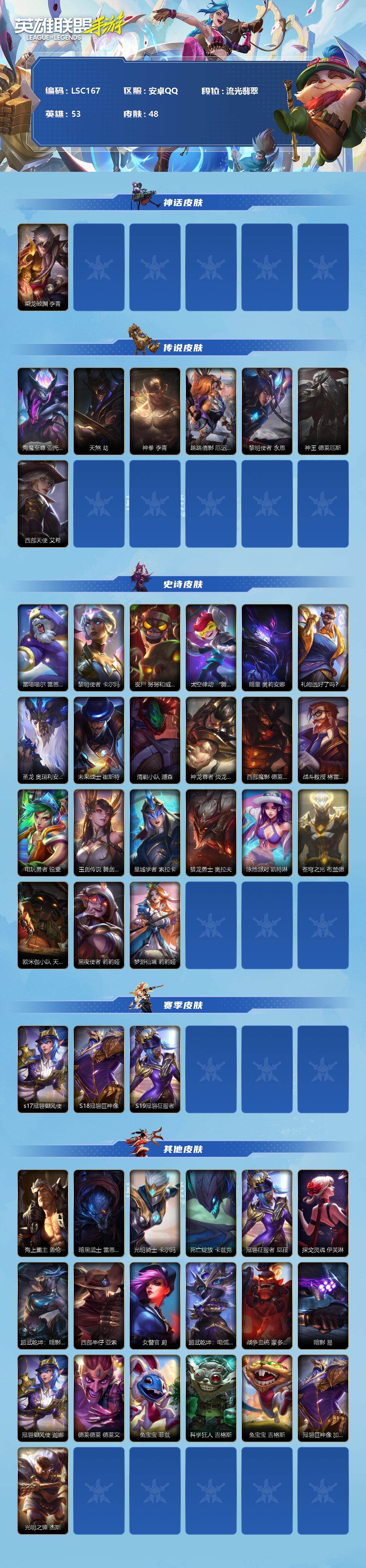 商品描述:【LSC167】53英雄/48皮肤/流光翡翠/乘龙破渊 李青/海魔至尊 亚托克斯/天煞 劫/神拳 李青/跳跳倩影 厄运小姐/黎明使者 永恩/神王 德莱厄斯/西部天使 艾希/雷喵喵尔 雷恩加尔/黎明使者 卡尔玛/丧尸 努努和威朗普/太空律动 “舞林双子” 努努和威朗普/暗星 奥莉安娜/礼物选好了吗? 布隆/圣龙 奥瑞利安·索尔/未来战士 崔斯特/清剿小队 潘森/神龙尊者 炎龙 瑟提/西部魔影 德莱厄斯/战斗教授 格雷福斯/电玩勇者 锐雯/玉剑传说 舞剑仙 艾瑞莉娅/星域学者 索拉卡/猎龙勇士 奥拉夫/泳池派对 凯特琳/苍穹之光 布兰德/欧米伽小队 天雷爆破手 维迦/黑夜使者 莉莉娅/梦游仙境
