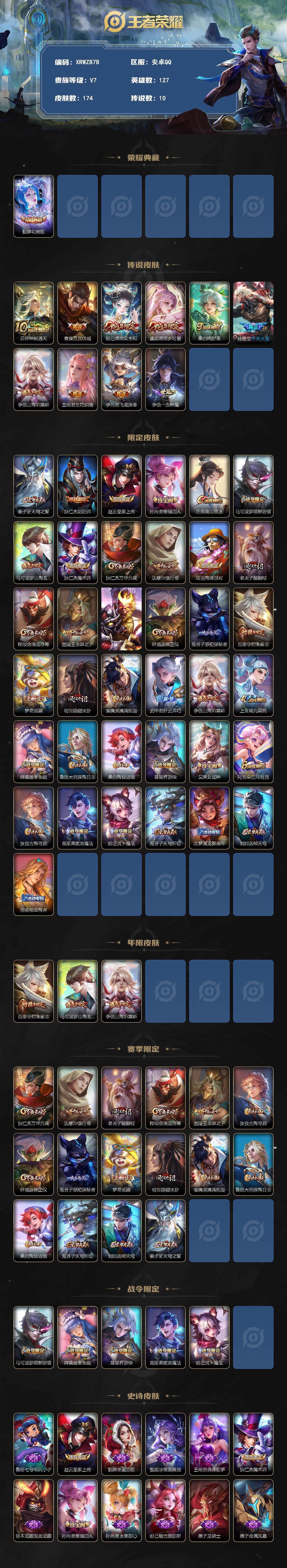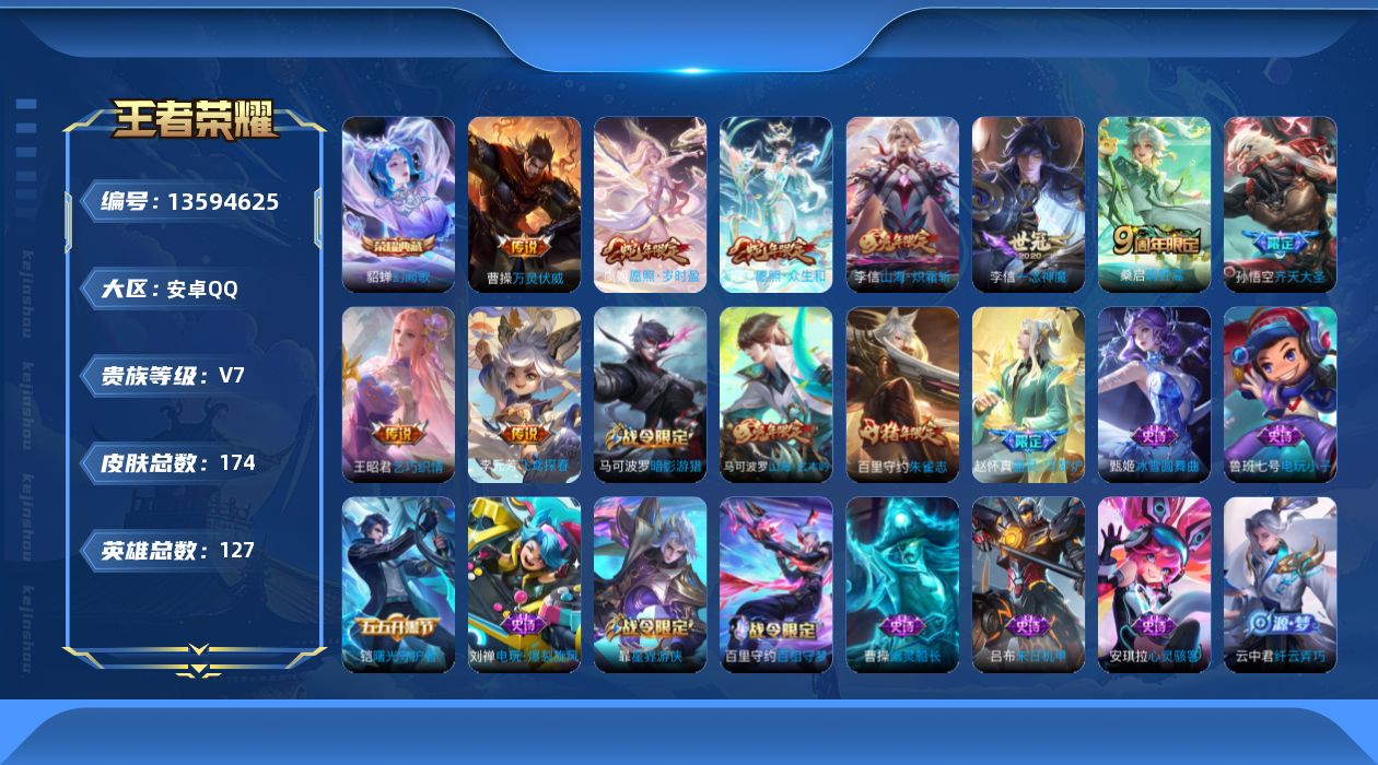 商品描述:[13594625]Xr42650-安卓Q-V7-可二次-最强王者段位-127英雄-174皮肤-1典藏-10传说-41史诗【英雄全皮】:孙权全皮,李信全皮【荣耀典藏】:貂蝉幻阙歌【传说皮肤】:后羿神树通天,曹操万灵伏威,妲己愿照众生和,虞姬愿照岁时盈,桑启鸣野蒿,孙悟空齐天大圣,李信山海炽霜斩,王昭君乞巧织情,李元芳飞鸢探春,李信一念神魔【限定皮肤】:姜子牙天穹之誓,狄仁杰阴阳师,赵云皇家上将,孙尚香蔷薇恋人,庄周高山流水,马可波罗暗影游猎,马可波罗山海玄木吟,狄仁杰魔术师,狄仁杰万华元夜,达摩沙漠行僧,项羽海滩派对,老夫子醍醐杖,程咬金演武夺筹,兰陵王金庭之子,孙悟空齐天大圣,钟馗驱傩正仪,鬼谷子原初探秘者,百里守约朱雀志,梦奇顽趣,明世隐疑决卦,裴擒虎擒涛扼浪,云中君纤云弄巧,李信山海炽霜斩,上官婉儿梁祝,嫦娥暖冬兔眠,鲁班大师探海日志,桑启海盐诗旅,暃星界游侠,艾琳女武神,阿古朵江河有灵,张良古海寻踪,高渐离燃音魔法,妲己灵卜魔法,鬼谷子天穹祈灯,沈梦溪龙舞盛年,刘邦剑破天穹,周瑜熔金海岸【年限皮肤】:百里守约朱雀志,马可波罗山海玄木吟,李信山海炽霜斩【赛季限定】:狄仁杰万华元夜,达摩沙漠行僧,老夫子醍醐杖,程咬金演武夺筹,兰陵王金庭之子,张良古海寻踪,钟馗驱傩正仪,鬼谷子原初探秘者,梦奇顽趣,明世隐疑决卦,裴擒虎擒涛扼浪,鲁班大师探海日志,桑启海盐诗旅,鬼谷子天穹祈灯,刘邦剑破天穹,姜子牙天穹之誓【战令限定】:马可波罗暗影游猎,嫦娥暖冬兔眠,暃星界游侠,高渐离燃音魔法,妲己灵卜魔法【史诗皮肤】:鲁班七号电玩小子,赵云皇家上将,貂蝉圣诞恋歌,甄姬冰雪圆舞曲,王昭君偶像歌手,狄仁杰魔术师,宫本武藏鬼剑武藏,孙尚香蔷薇恋人,孙尚香水果甜心,妲己魅力维加斯,墨子龙骑士,墨子金属风暴,曹操幽灵船长,吕布末日机甲,张飞乱世虎臣,刘邦德古拉伯爵,兰陵王暗隐猎兽者,安琪拉心灵骇客,铠曙光守护者,蔡文姬舞动绿茵,李元芳逐浪之夏,阿轲节奏热浪,孙策猫狗日记,大乔猫狗日记,百里守约朱雀志,狄仁杰鹰眼统帅,上官婉儿梁祝,马可波罗暗影游猎,云中君纤云弄巧,杨戬天秀启明,庄周高山流水,梦奇顽趣,暃星界游侠,马可波罗山海玄木吟,刘禅电玩爆裂旋风,阿古朵江河有灵,妲己灵卜魔法,高渐离燃音魔法,百里守约百相守梦,牛魔星界战将,孙膑茶境仙,赵怀真器灵浮梦炉【其他皮肤】:项羽海滩派对,韩信教廷特