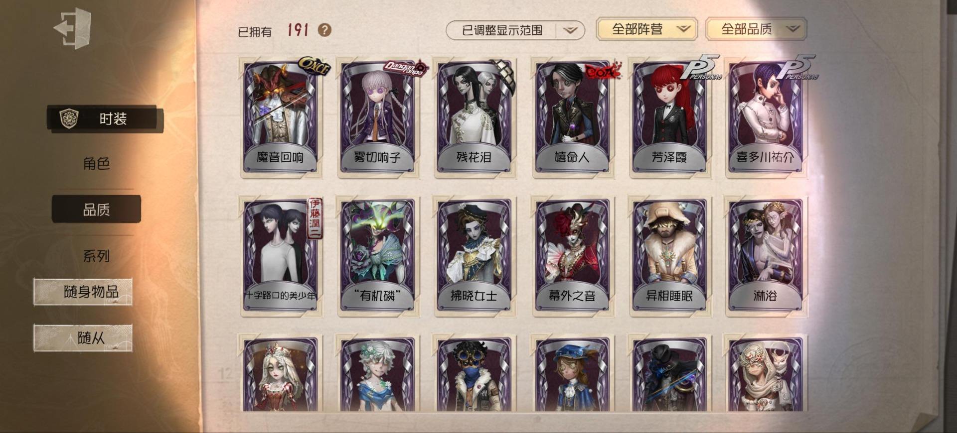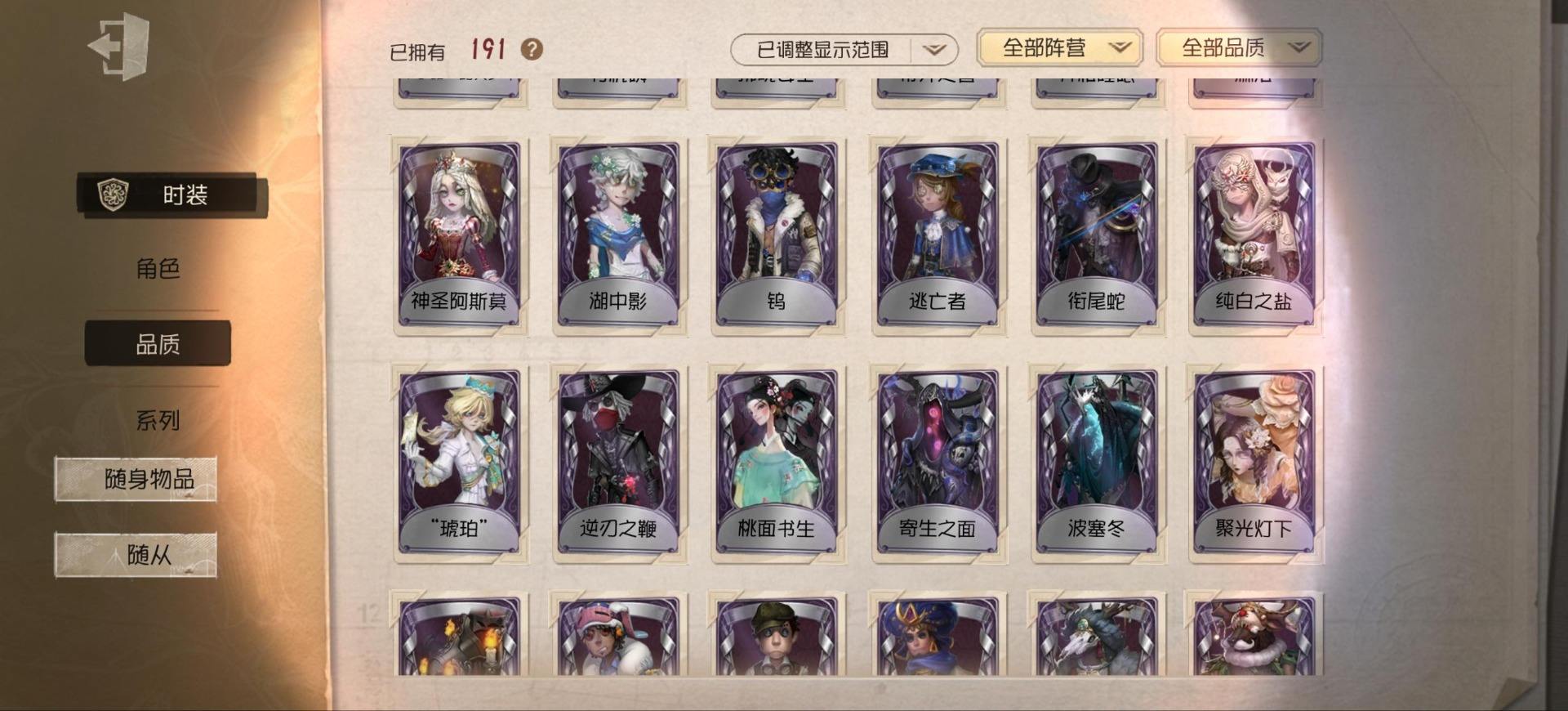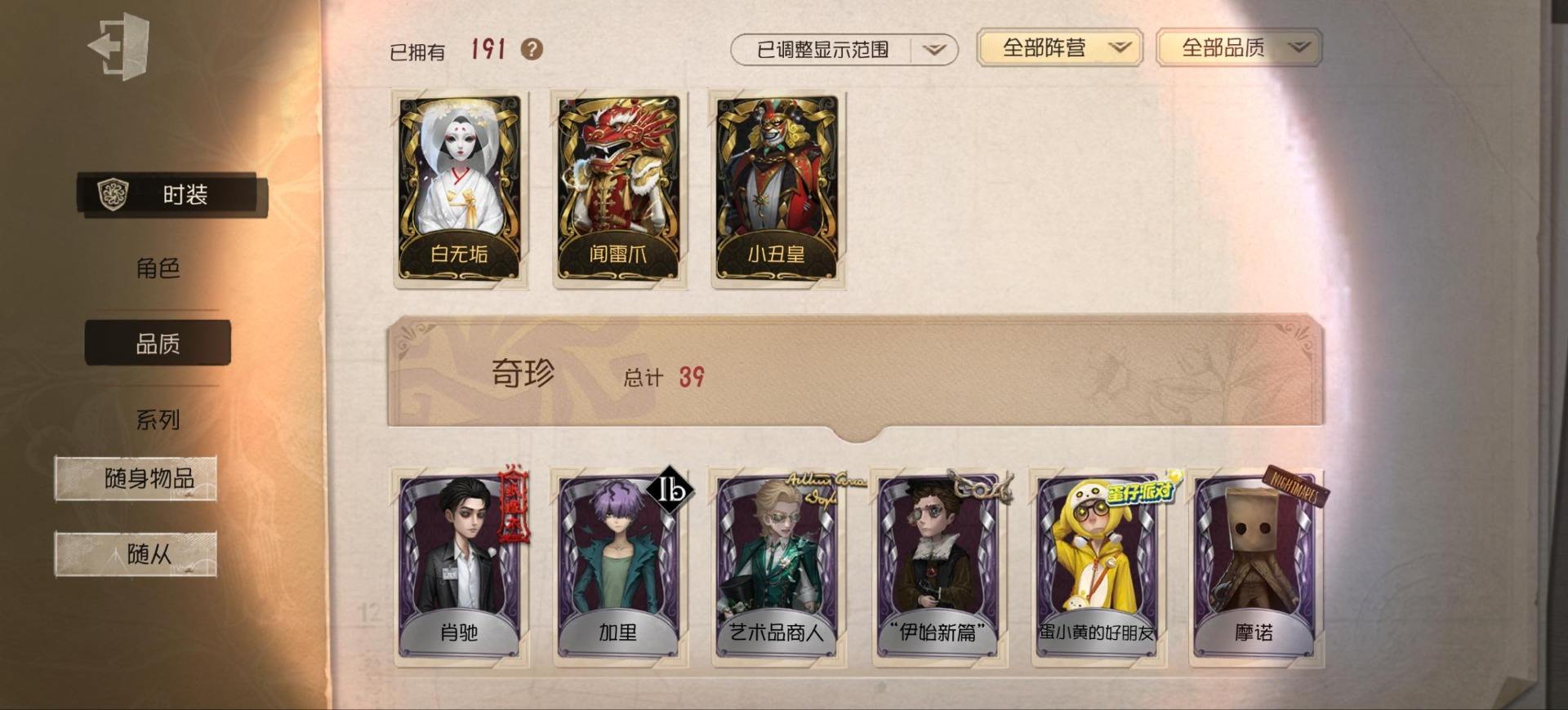 [14349997]苹果官服 邮箱账号 1虚妄杰作 243时装 13金皮 70紫皮 18随从 101随身物品 【时装】:古董商-招风旗,渔女-垂泪的神女,使徒-多加雷萨,小说家-最原终一,画家-温暖的平安夜,古董商-木兰,园丁-异想Hello Kitty,爱哭鬼-摩诺,渔女-百万人鱼,律师-亚伯拉罕·葛雷,祭司-“绯”,渔女-Chef K,古董商-填海平,邮差-秋日随想,“囚徒”-天海兰太郎,调香师-提炼师,古董商-黑鸦,咒术师-椰香假日,杂技演员-雨宫莲,杂技演员-JOKER,空军-爱神之吻,记者-伊布,红蝶-融化的泪琥珀,大副-雷斯垂德探长,雕刻家-善忘的海马体,骑士-艺术品商人,爱哭鬼-善恶的本性,教授-吟游诗人,画家-掌中篆记,26号守卫-秘密大厨,小说家-无归的昨日,冒险家-赞因,“法罗女士”-向深处求告,魔术师-动力芯,幸运儿-蛋小黄的好朋友,古董商-墨韵,宿伞之魂-桃面书生,摄影师-“琥珀”,勘探员-盛夏飞盘,“法罗女士”-VIOLET,古董商-菌丝研究,先知-纯白之盐,调酒师-逐浪的玫瑰,“法罗女士”-芳泽霞,“小女孩”-异动指针,小说家-“伊始新篇”,园丁-郁金香之梦,破轮-沙滩漂移,蜡像师-收藏品,空军-新岛真,空军-QUEEN,祭司-“朝圣者”,机械师-佐仓双叶,空军-“苏珊娜”,蜡像师-淋浴,魔术师-梅林,昆虫学者-可妮兔,“杰克”-夜来香,大副-明智吾郎,“噩梦”-随机数,红蝶-仙鹤,红蝶-彼岸,红蝶-更纱,红夫人-贝拉夫人,红蝶-竹华,舞女-高卷杏,舞女-女武神,舞女-PANTHER,调香师-致命温柔,调香师-Lady K,调香师-红菱艳,调香师-摩涅莫绪涅之梦,调香师-花序,园丁-奥村春,先知-月相,“小女孩”-年岁,前锋-坂本龙司,盲女-海西遗风,梦之女巫-川上富江,摄影师-月下绅士,入殓师-喜多川祐介【随身物品】:荣光的残像(稀世),茅龙书(稀世),夏(稀世),遗忘之花(稀世),火火火(奇珍),指挥(奇珍),海岸花环(奇珍),海之低语(奇珍),集邮册(奇珍),回旋镖(奇珍),炸药桶(奇珍),“全熟”(奇珍),凝固的声音(奇珍),漂浮(奇珍),充气海豚(奇珍),沙漠精灵(奇珍),咖啡壶(稀世),德米特里1号(奇珍),聚集哨笛(奇珍),手摇铃(奇珍),酩酊(奇珍),心海之梦(奇珍),欢呼(奇珍),糖果鬼(奇珍),秘密(奇珍),折柳(稀世),海底遗物(奇[13739442]苹果官服 邮箱账号 208时装 15金皮 63紫皮 8随从 78随身物品 【时装】:守夜人-KNIGHT-c3,破轮-胡桃夹子,勘探员-盖提亚之遗,飞行家-异相睡眠,小丑-捣蛋裘克,爱哭鬼-摩诺,作曲家-幽灵帆,舞女-西尔菲德,佣兵-中岛敦,园丁-宇宙女巫,杂技演员-茶话会,记者-华生小姐,“囚徒”-OPH.LUCA,骑士-Mentor K,教授-吟游诗人,病患-溯光,“杰克”-加里,雕刻家-善忘的海马体,邮差-华生医生,小丑-OPH.JOKER,邮差-潘塔龙,小说家-“伊始新篇”,哭泣小丑-熄灭的太阳,“法罗女士”-芳泽霞,时空之影-“有机磷”,入殓师-“温室”,“记录员”-删除符,击球手-迫降专家,哭泣小丑-炮弹飞船,勘探员-中原中也,爱哭鬼-雪上小王子,红夫人-女大公,画家-江户川乱步,红蝶-更纱,舞女-高卷杏,调酒师-海盐特调,幸运儿-双一,小丑-变脸王,魔术师-广津柳浪,梦之女巫-信使,前锋-SKULL,梦之女巫-川上富江,前锋-坂本龙司,摄影师-宿醉,“囚徒”-太宰治