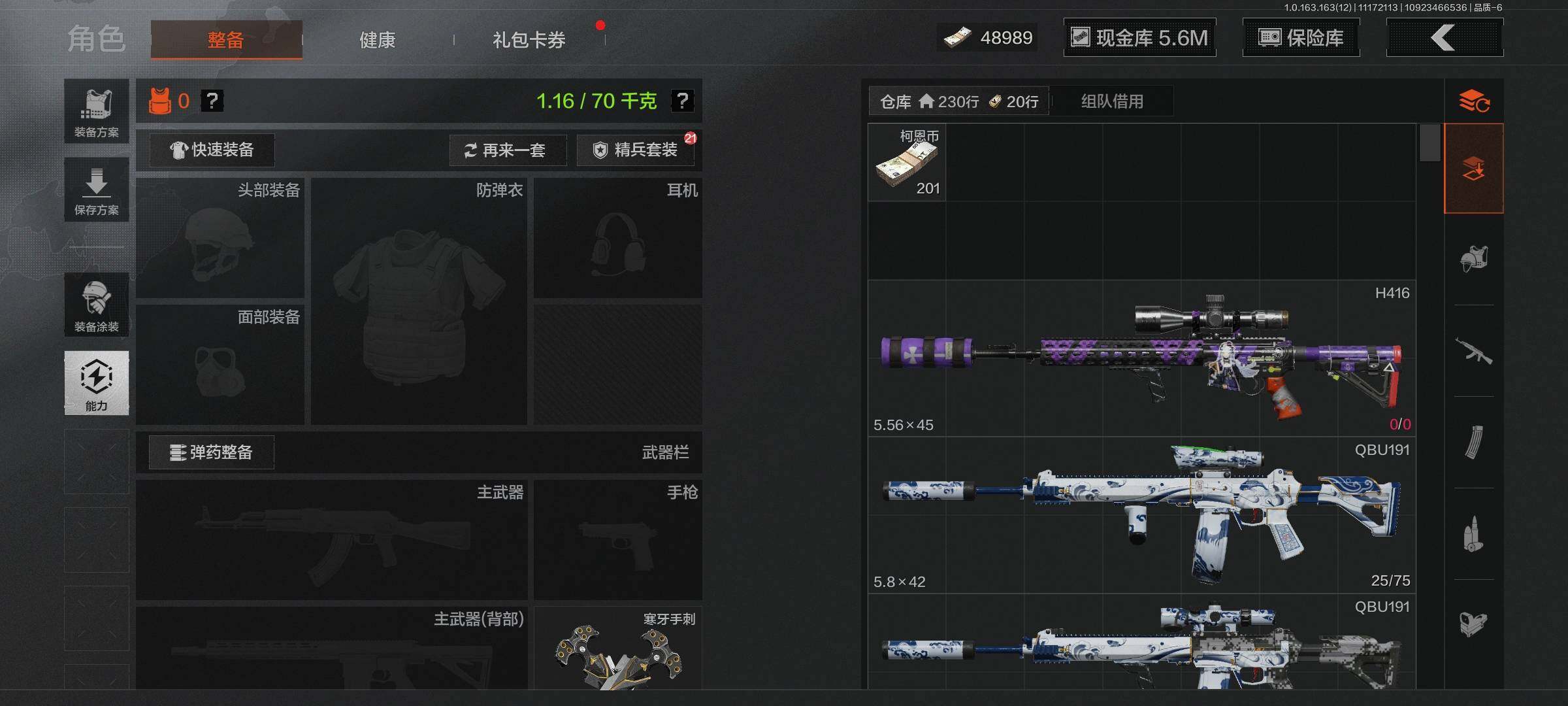 库存价值9.9 5近战武器 1金套装 1金枪皮 可修改实名 【柯恩币数量】:57345【角色装扮(金)】:火绒·塔莉娅【近战武器】:来战·开山刀,瀚星斩铁,工兵铲,涂鸦利刃,裁决手杖剑【金色枪皮】:竞技·FAL【紫色枪皮】:火绒·AK12,棱光裂变·AKM,无畏·USAS12,骑士之剑·SJ16,百锻寒芒·T03,百锻寒芒·T951,竞技·AUG,V·SKS,竞技·MDR,掌中盾·MP5,自喷网格·H416,来战·AK74N,德尔塔小队·M4A1,玄戈梨花·MPX,07式林地迷彩·QBZ191,全地形数码·M110【角色装扮(紫)】:都市夜影套装